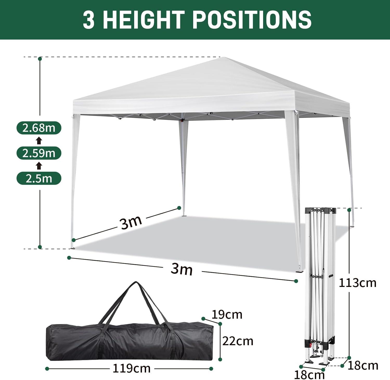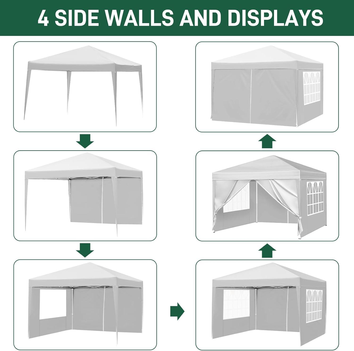 【OVERALL DIAMENSION】10'X10' (3m*3m) outdoor canopy tent with 2 wall sides can hold up to 10 people. 3 heights to adjust. From gound to tent top: 8.2ft/8.5ft/8.8ft. Comes with 4 upright poles and ground stakes, the side walls can be set up like a tent to provide additional shade