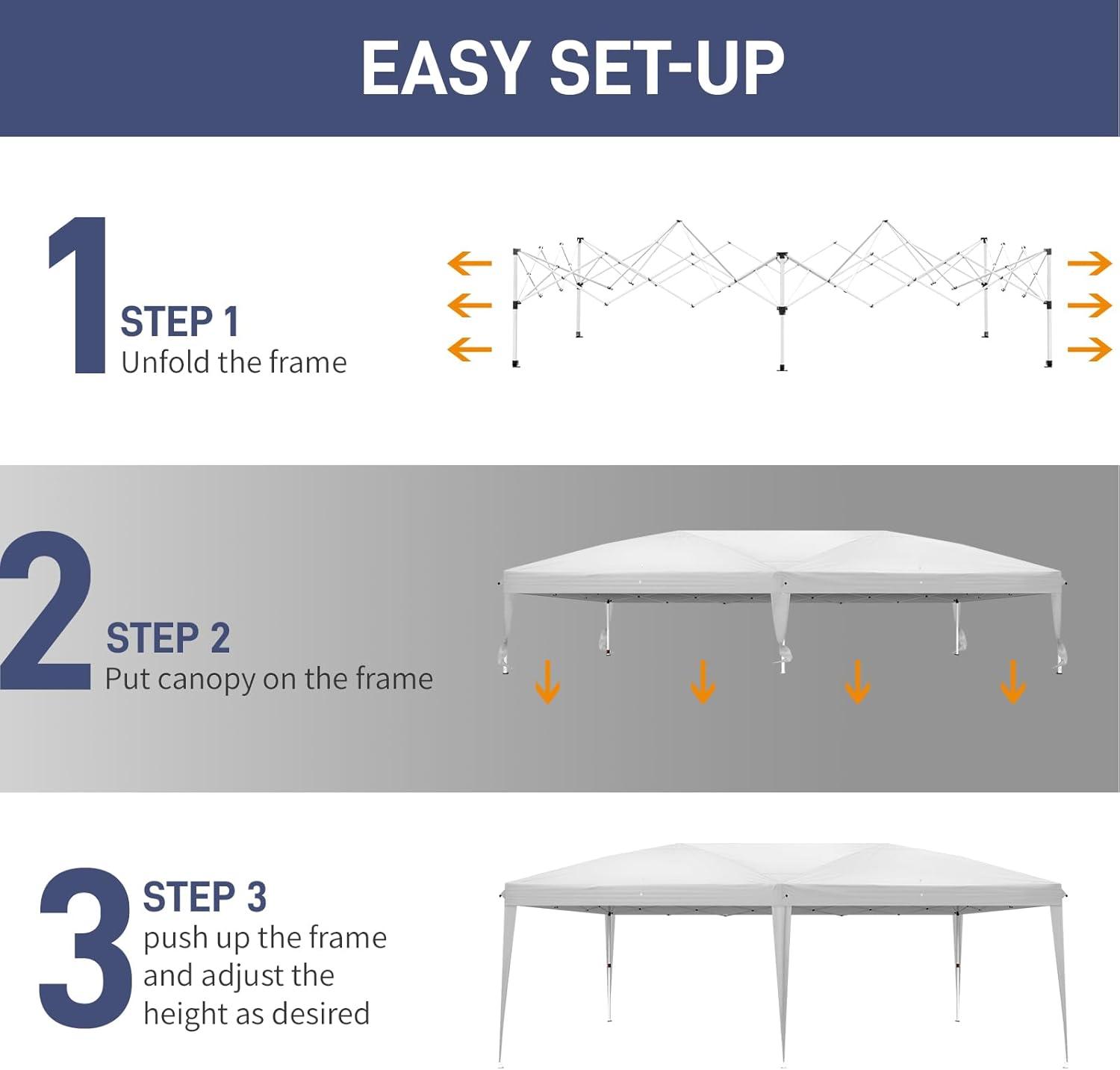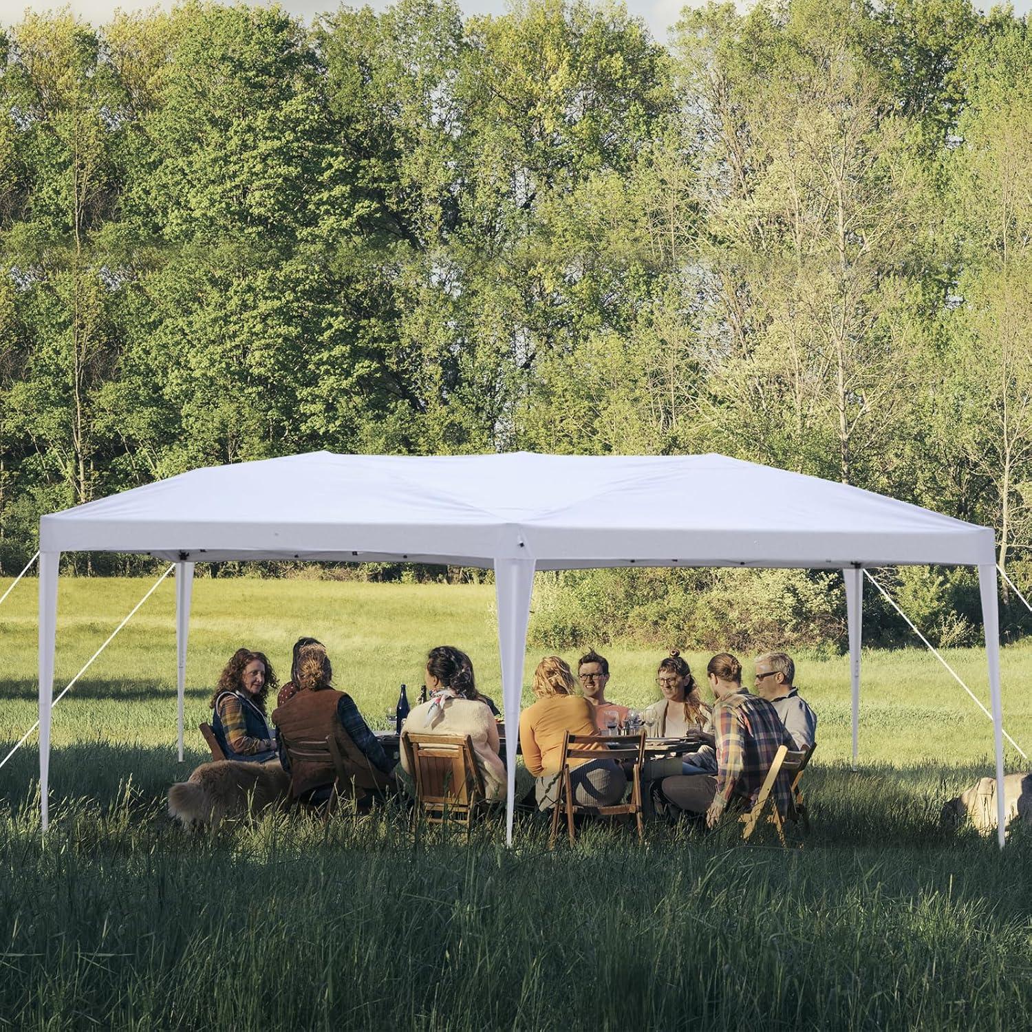 【WIDE USAGE】This party tent is perfect for commercial or recreational use like party, wedding, graduation, flea market, small business, outdoor events, patio leisure, backyard, camping, picnics, sporting events, trade shows, fairs, flea markets, yard sales, parties