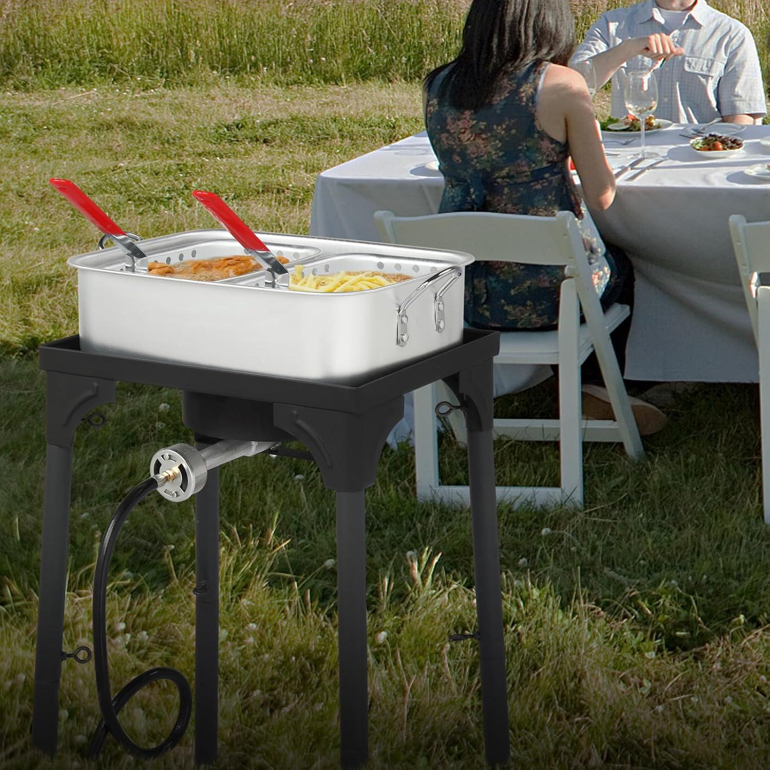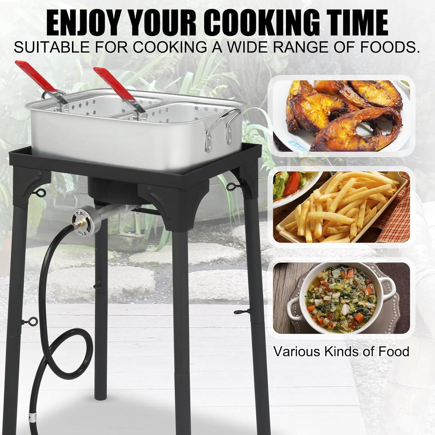 【HIGH QUALITY MATERIAL】 Heavy duty welded cast iron stand with powder coating, sturdy and has a long service life. The fryer is made of durable aluminum which is treated with high-temperature resistance for strength and optimum thermal conductivity
