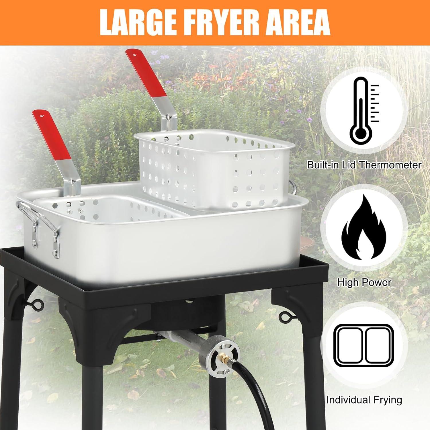【LARGE CAPACITY】This turkey fryer is a perfect tool for all types of outdoor cooking on Christmas and Thanksgiving. This deep fat fryer has a spacious 18-quart capacity. This fish fryer comes with two inner baskets for easy draining