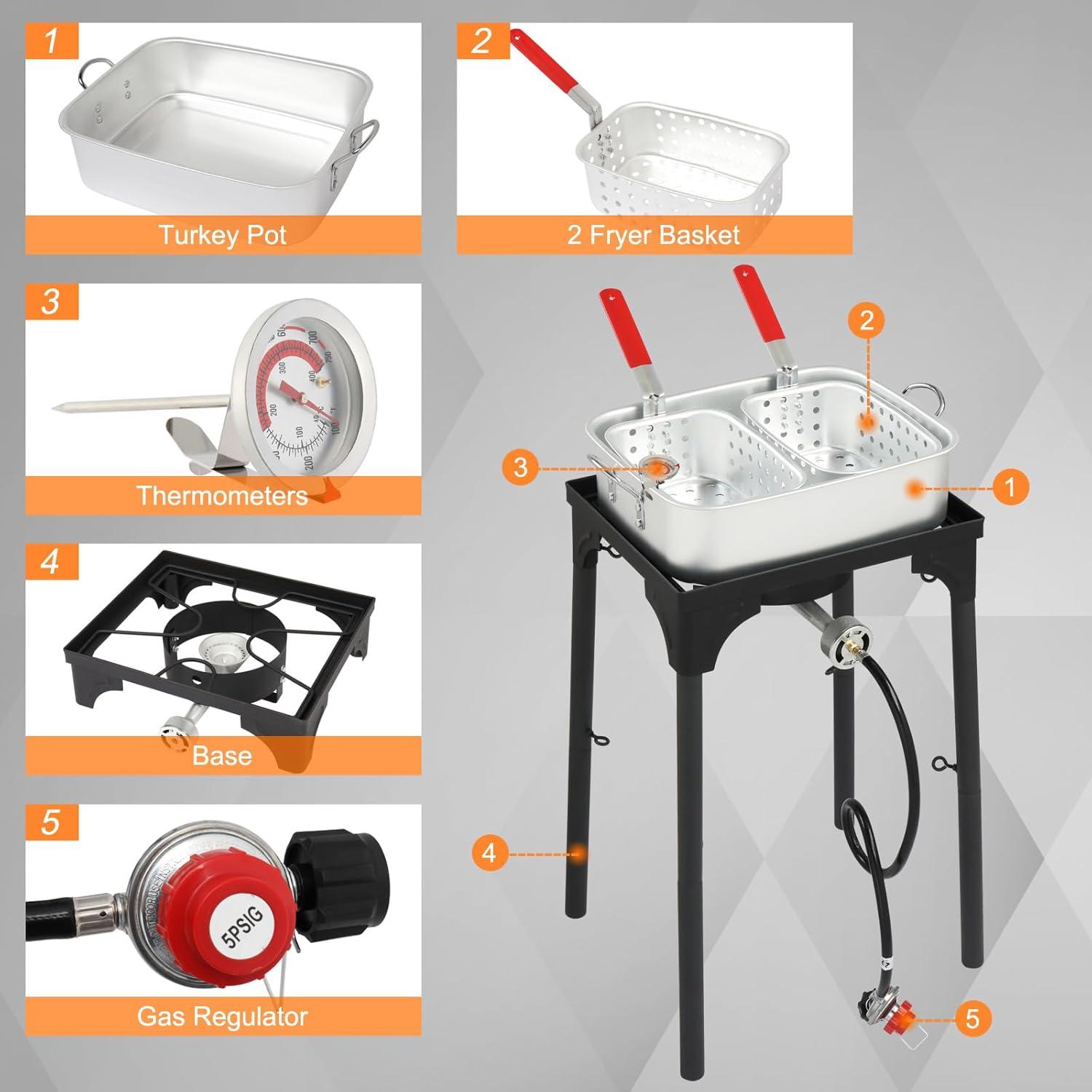 【COMPLETE ACCESSORIES】18QT Pot with strainer basket, 58,000 BTU Iron Frame Burner, CAS Certified Regulator with Hose and 12″ Deep Probe Thermometer. All these options make the outdoor cooking easier