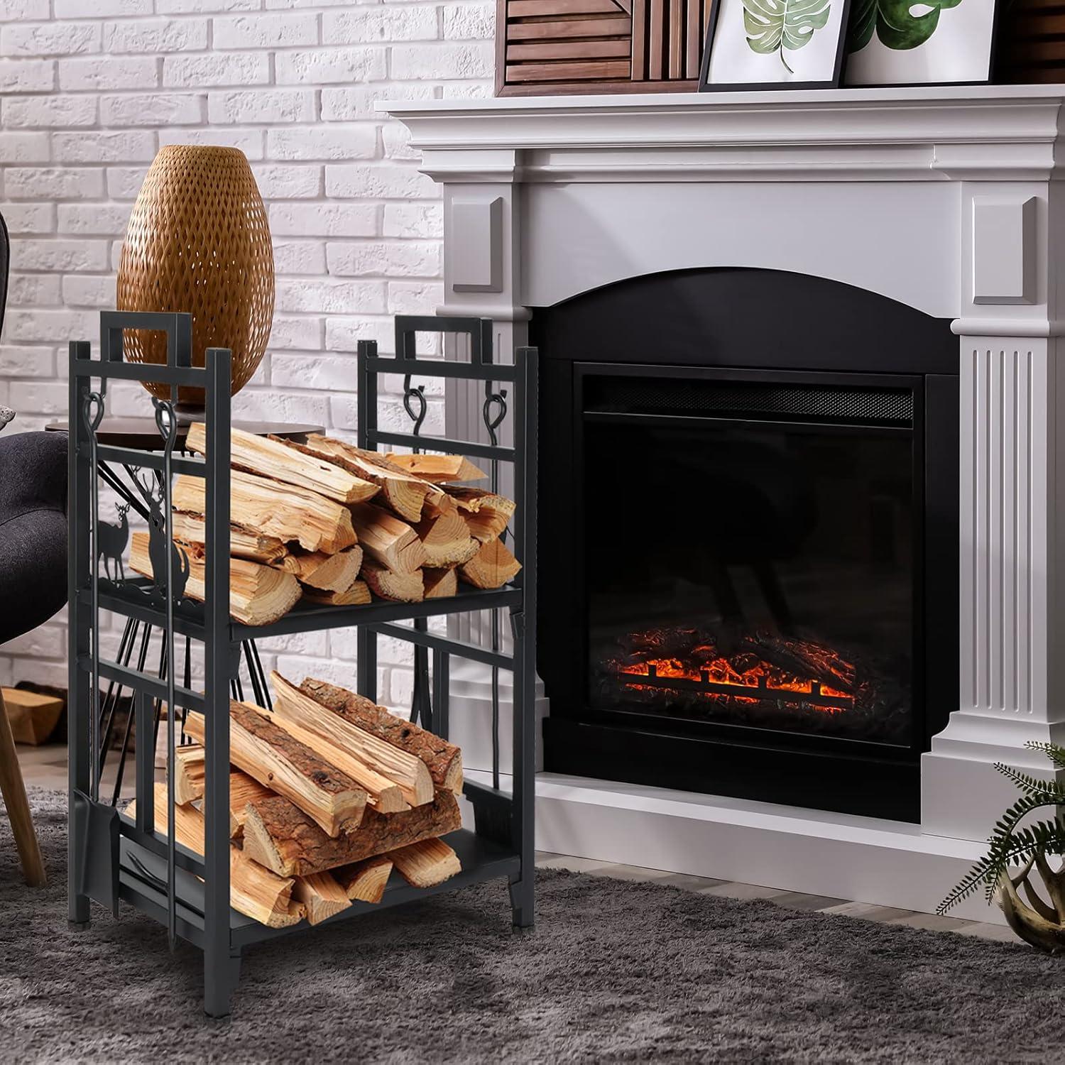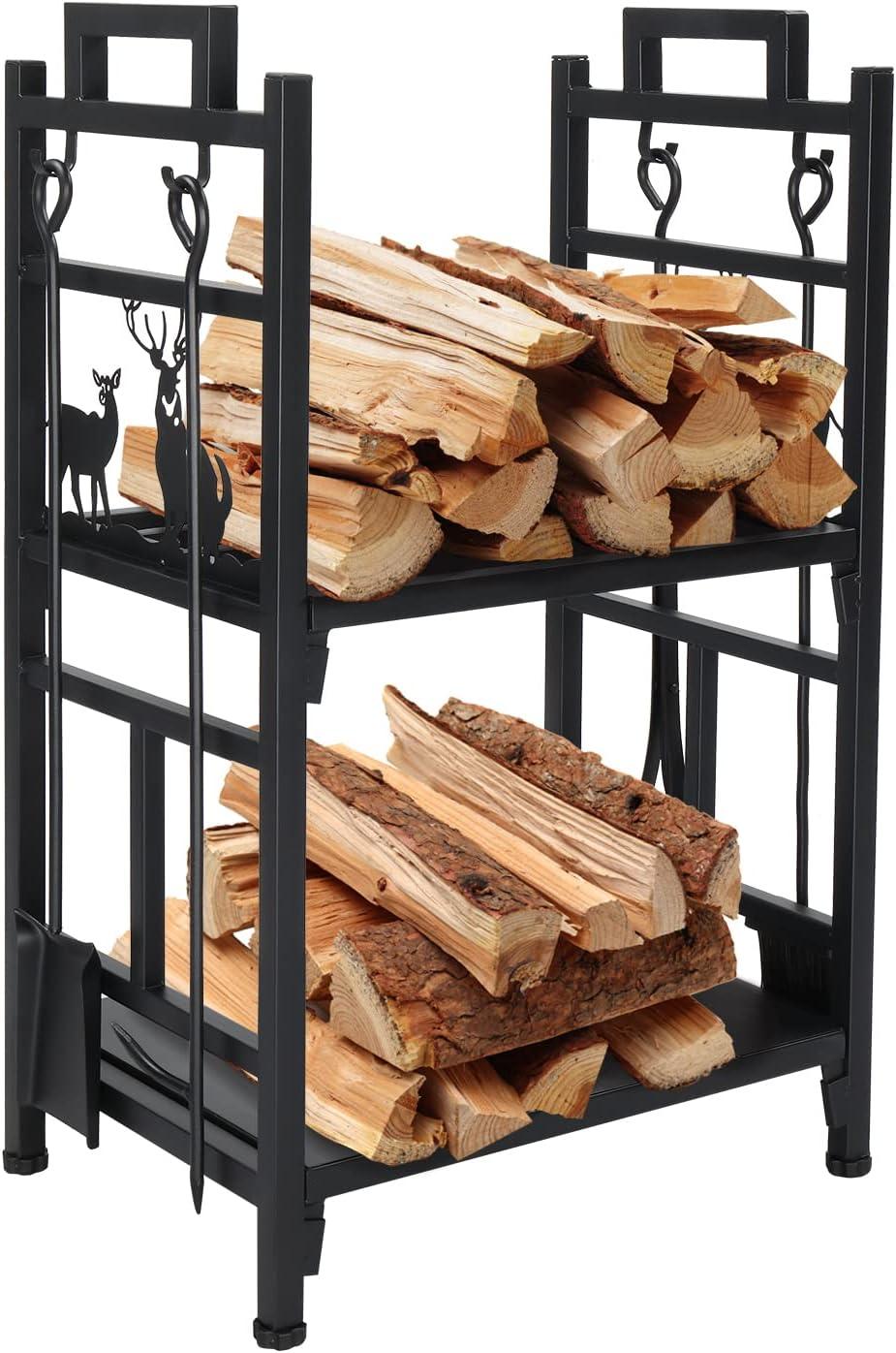Outvita 2 Tier Firewood Log Rack, Iron Lumber Storage Holder, Wood Pile Stacker Organizer for Indoor Outdoor Fireplace Fire Stove Pit With 4 Fire Tools Hanging Hooks Christmas Elements Black(13"D x 17.9"W x 29.7"H)