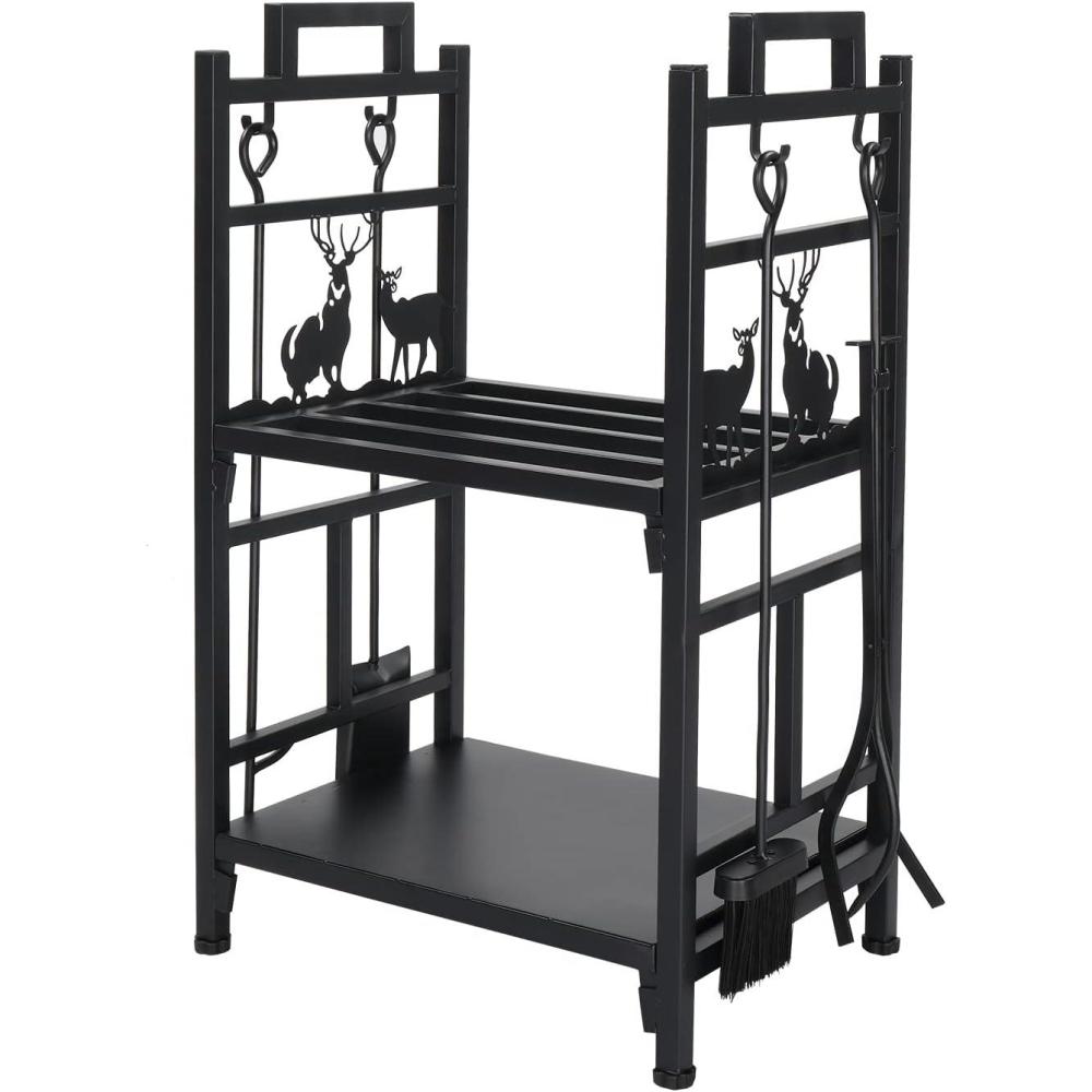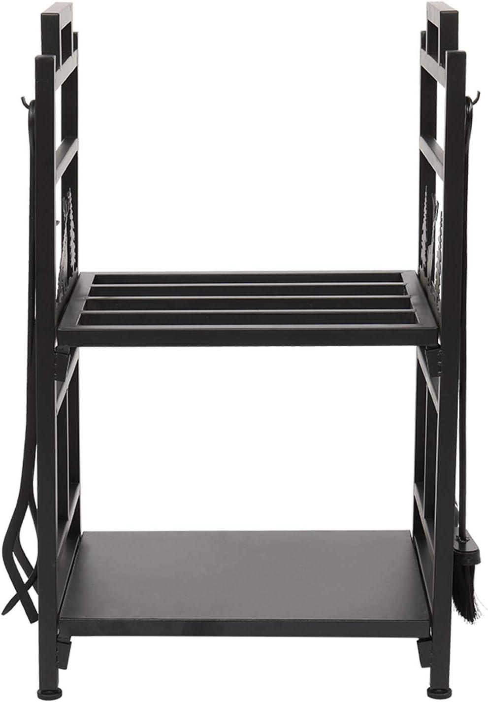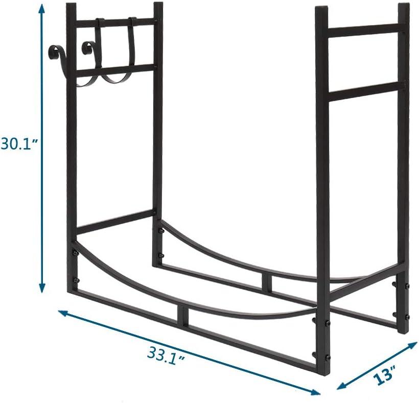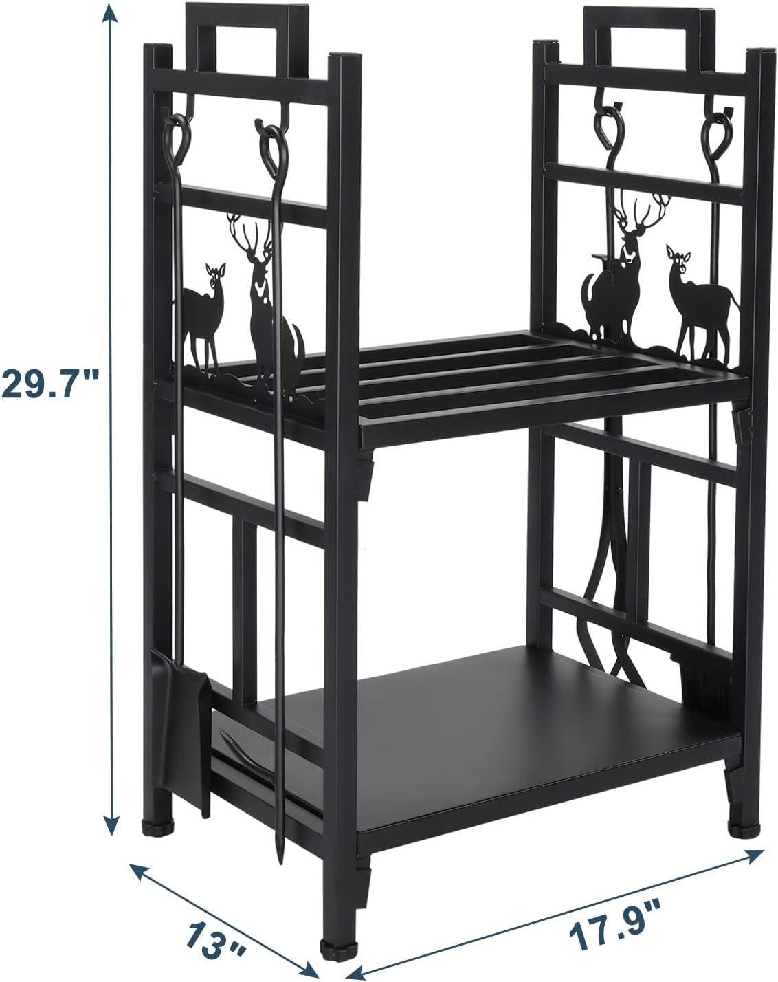 Outvita 2 Tier Firewood Log Rack, Iron Lumber Storage Holder, Wood Pile Stacker Organizer for Indoor Outdoor Fireplace Fire Stove Pit With 4 Fire Tools Hanging Hooks Christmas Elements Brown(Black)