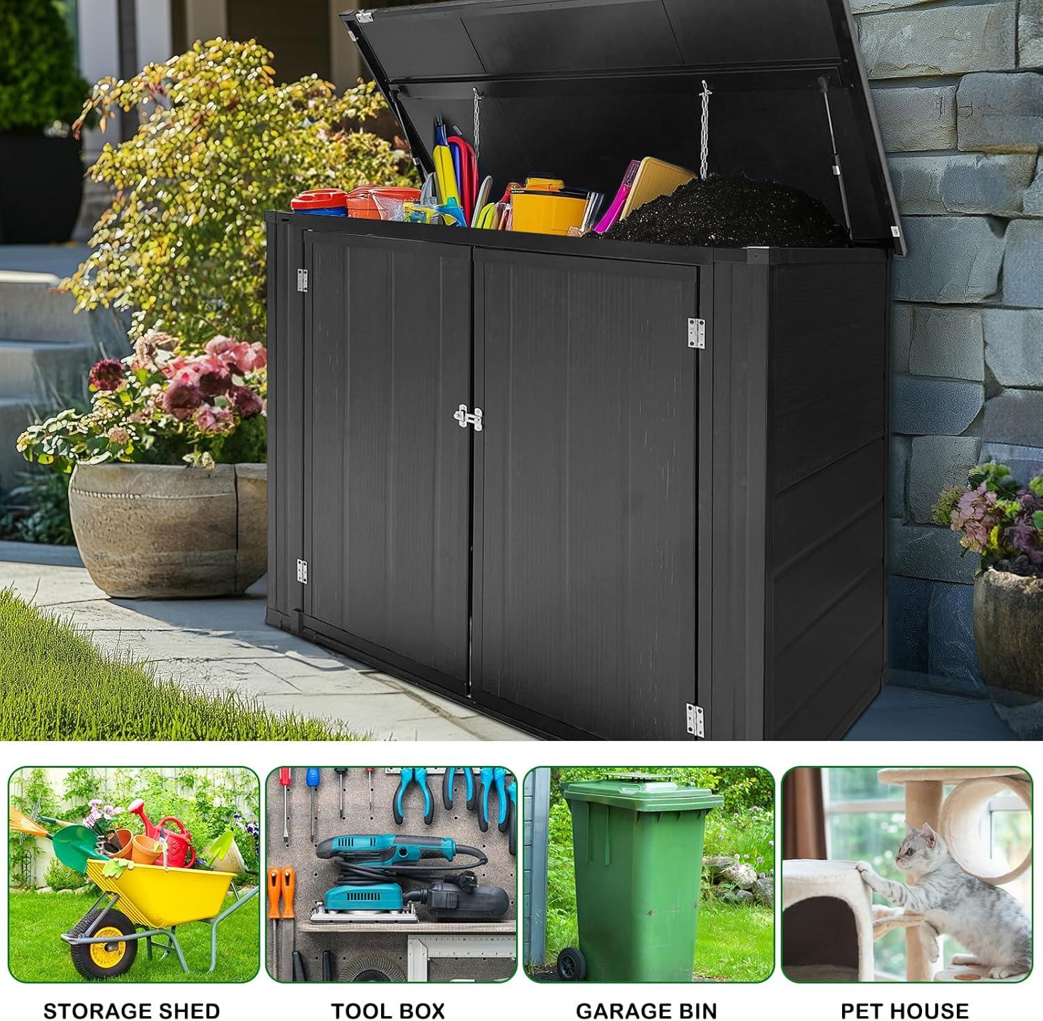 【Multifunctional】:This Storage Container is highly versatile, suitable for storing various items like pool essentials, seasonal decor, gardening tools, courtyard trash cans, and more. Its sleek black finish blends well with any courtyard style, adding both function and style.