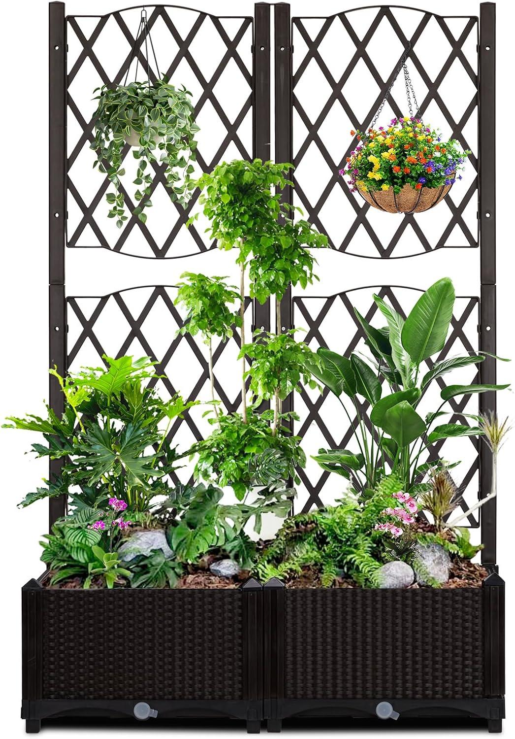 A multi-functional garden artifact: The tall trellis serves as a privacy screen, a unique garden decor, and a practical elevated flower bed for climbing plants.The integrated lattice frame helps the plants climb vertically, making it easy to create an eye-catching green wall. You can also hang ornaments or hanging baskets on it to add a special charm to any environment.