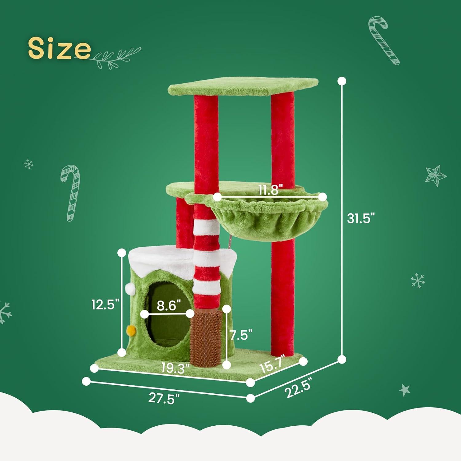 Give your feline friend a festive retreat with this 32in Christmas-themed cat scratching post tower. Not only does it provide an exciting play and relaxation area for your cat, but it also doubles as a charming holiday decoration for your home. Equipped with a spacious cat condo and three levels of boards, this cat tree offers everything your pet needs for fun and comfort. Whether it's lounging in the hammock or curling up in the condo, your cat will love being part of the holiday festivities!