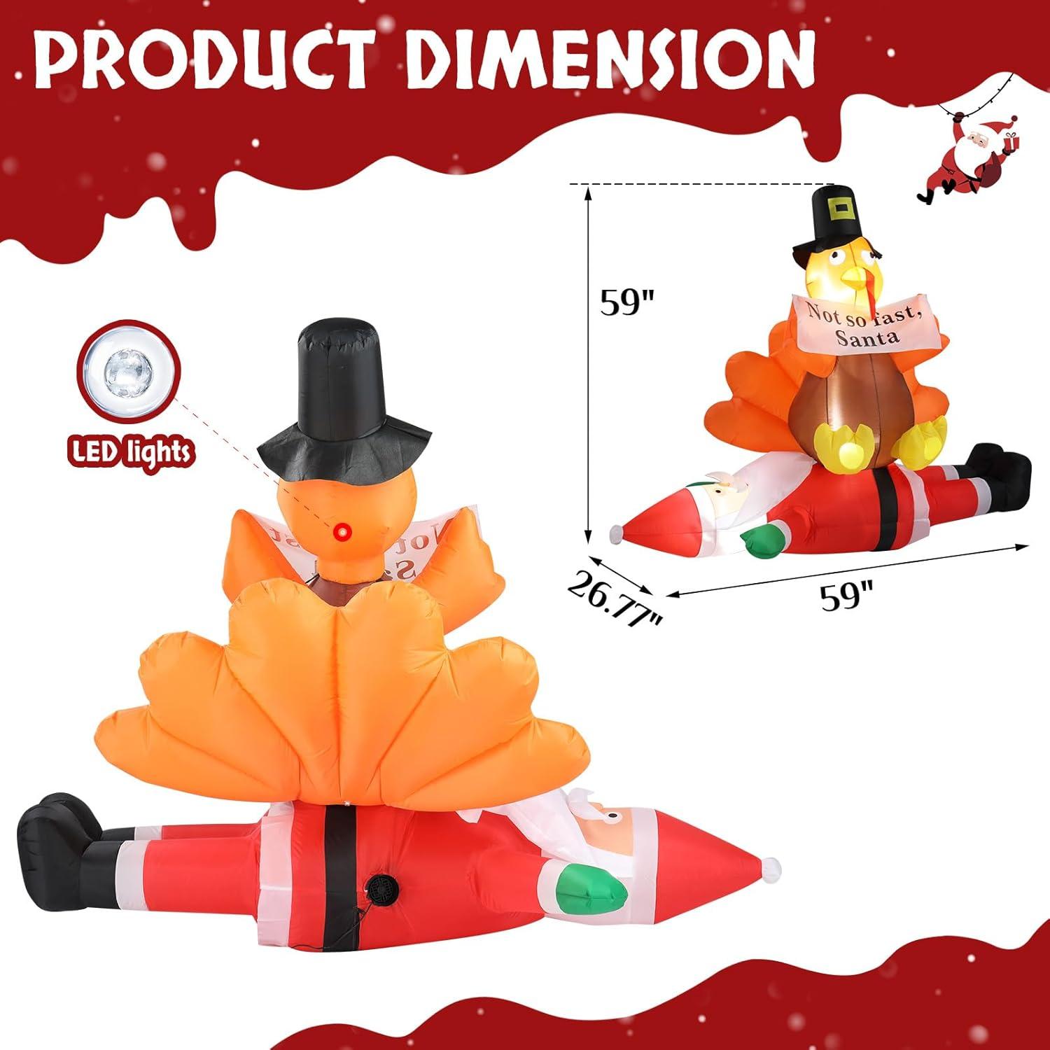 Outvita 4.9 FT Thanksgiving Turkey Inflatables Outdoor Decorations, Blow Up Turkey with Pilgrim Hat Sitting on Santa Decor, Built-in 3 LED Lights Thanksgiving & Christmas Inflatable for Yard Garden(Turkey)