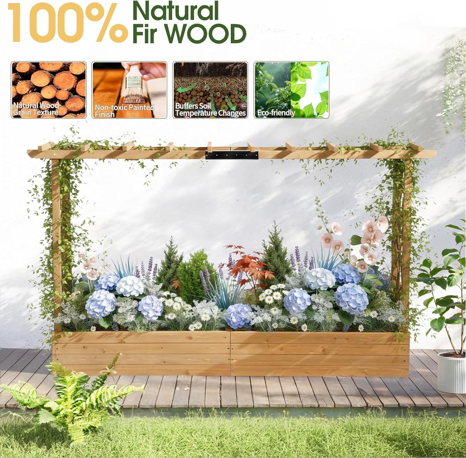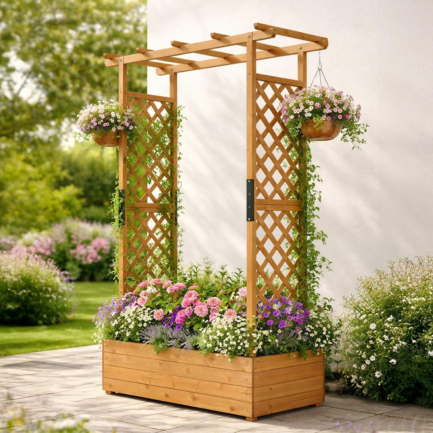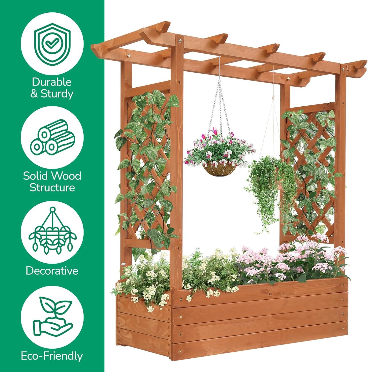 Outvita 45" Raised Garden Bed with Trellis, Wood Planter Box with Hanging Roof, Side Trellis and Drainage Holes, Above Ground Elevated Garden Bed for Outdoor Climbing Plants Vegetables(Teak Color)(Teak Color)