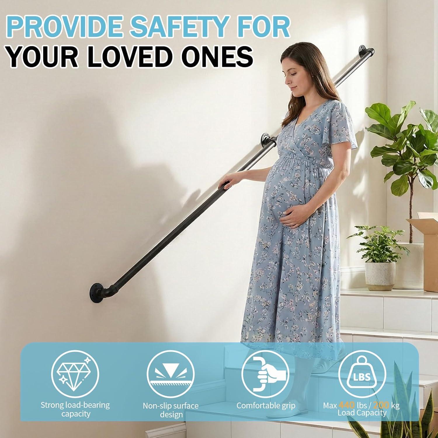 Enhanced Safety–Designed to support up to 440lbs, this stair handrail is perfect for families with kids, elderly, pregnant women, or anyone needing extra safety. The non-slip surface ensures a firm, safe grip, making it an essential feature in various settings. They help prevent falls and accidents, making spaces safer for everyone