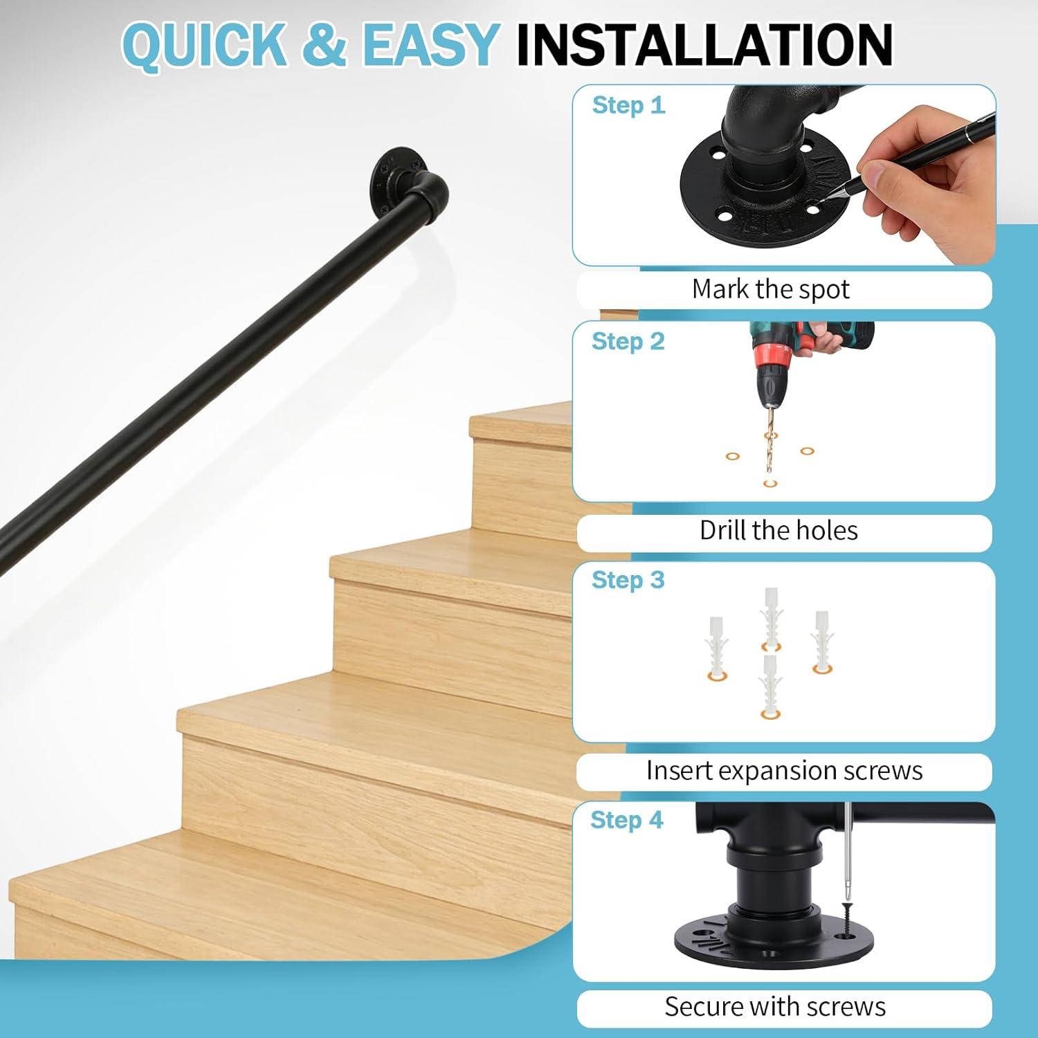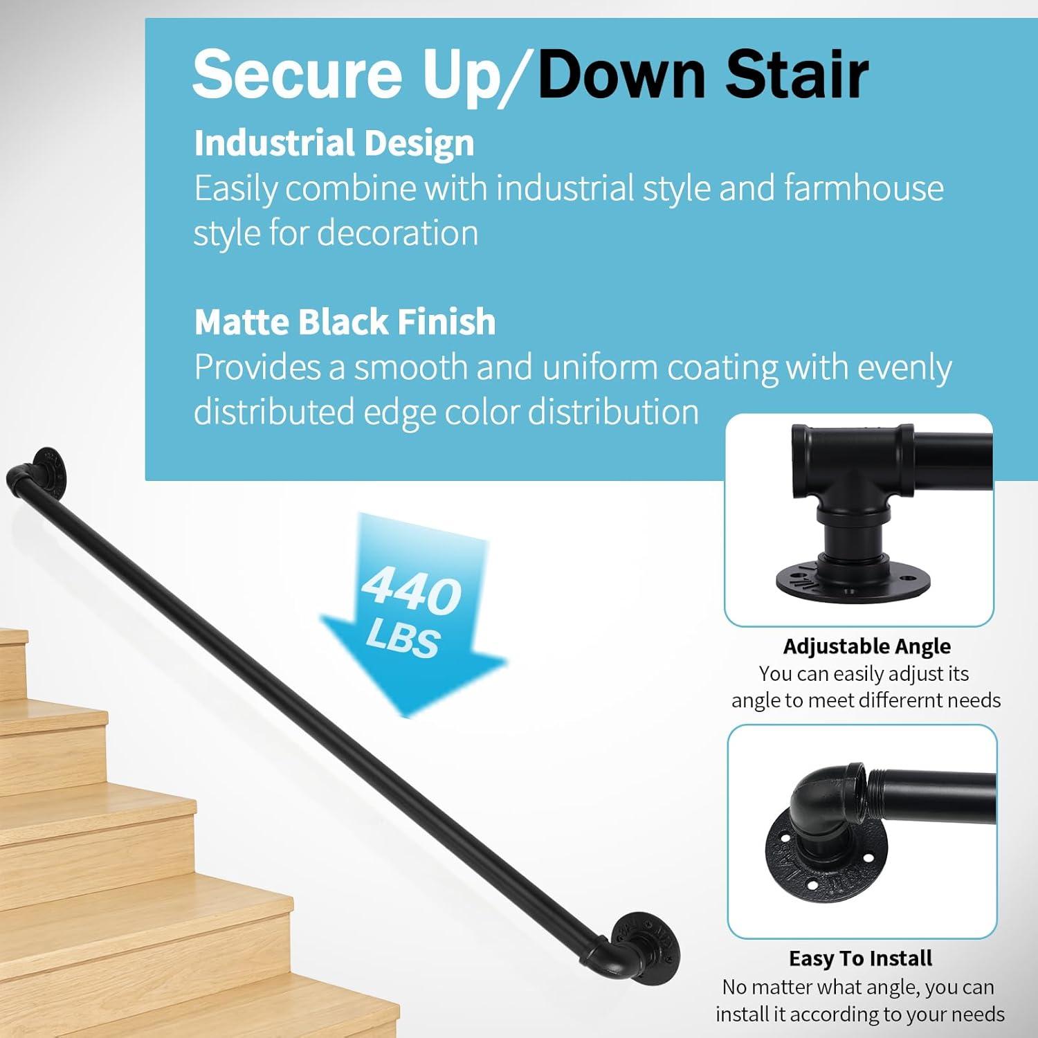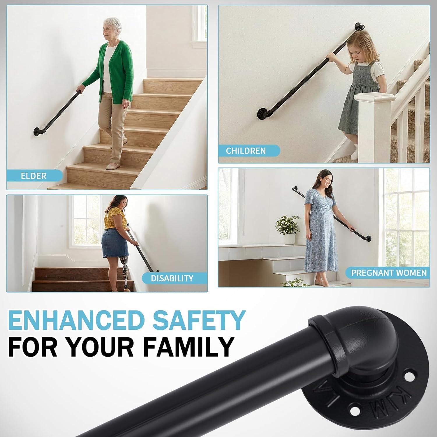 Sturdy & Safe Support — Constructed from premium metal with a black powder-coated finish, this durable handrail offers long-lasting protection against rust. This stair railing adds a modern industrial touch that blends perfectly with farmhouse, contemporary, or vintage décor. Ideal for both indoor and outdoor stairs