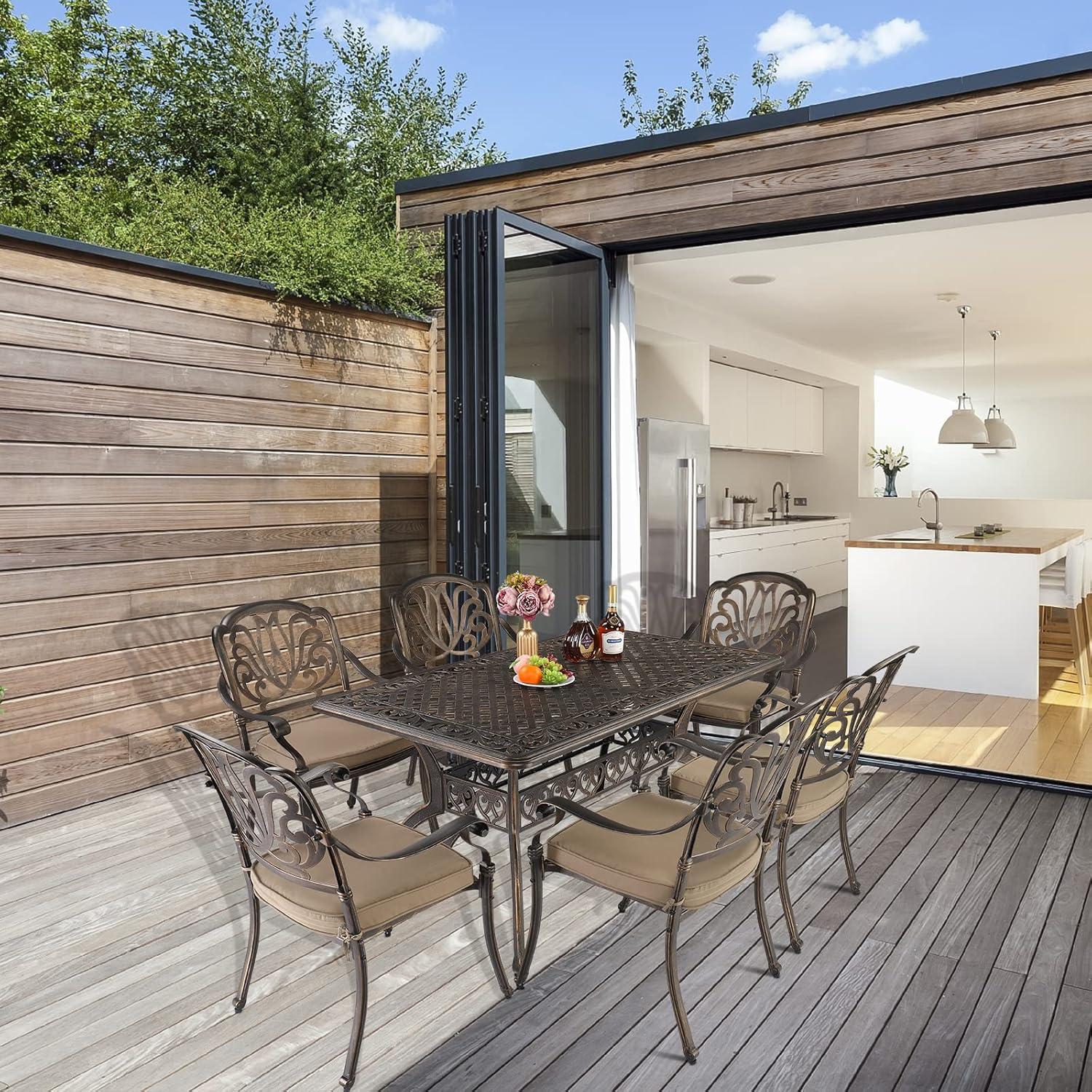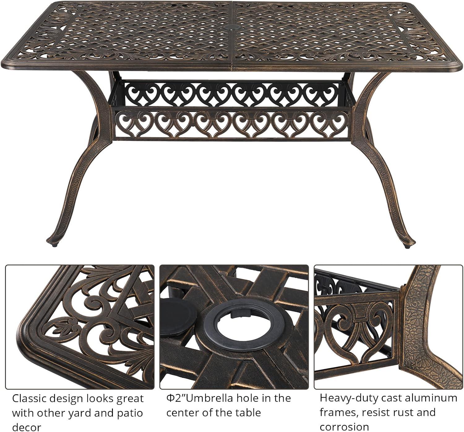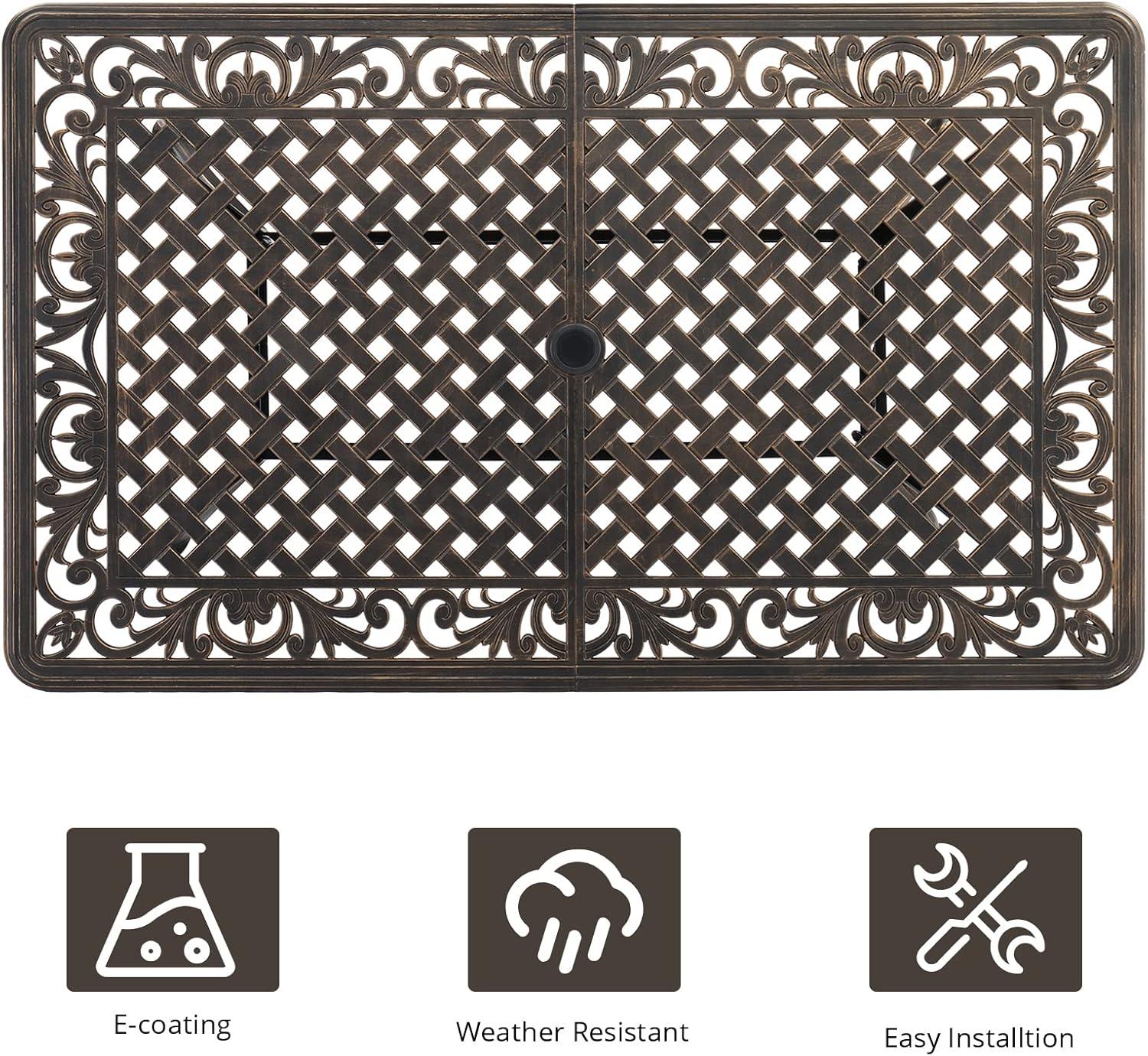 Spacious and Durable: This cast aluminum dining table measures 35.4″ x 59″, offering ample tabletop space to comfortably seat 4-6 people. It is an ideal choice for outdoor dining, family gatherings, and summer barbecues. The sturdy cast aluminum construction ensures long-lasting durability, capable of withstanding various weather conditions
