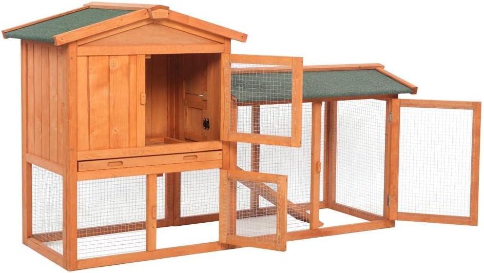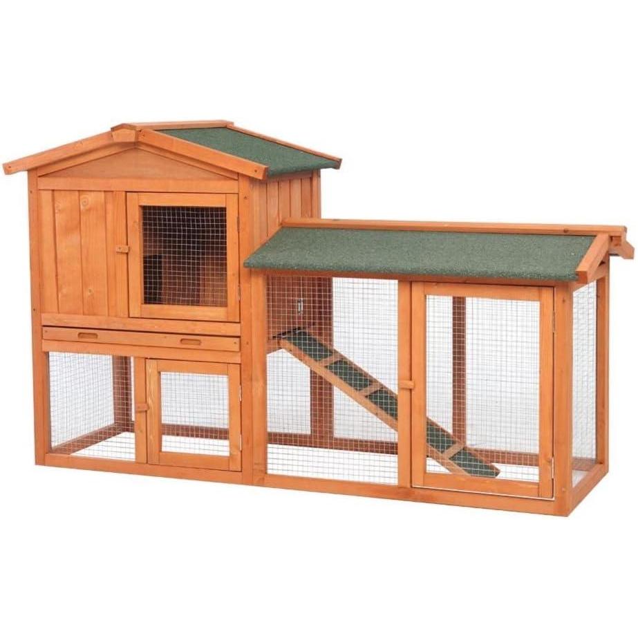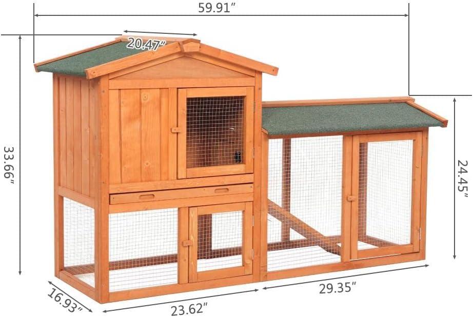 RABBIT HUTCH INFORMATION – Overall Dimension: 61.42″L x 20.47″W x 26.77″H, Right Cage Dimensions: 30.71″L x 16.73″W x 19.69″H, Left Bottom Cage Dimensions: 28.74″L x 16.73″W x 8.27″H . Suitable for 2-5 rabbits.
