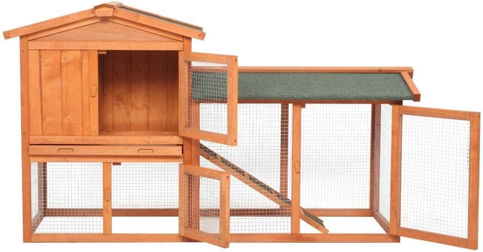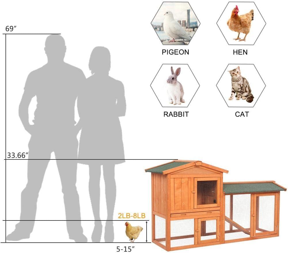 DURABLE AND WEATHERPROOF – The chicken coop made of solid rain-resistant fir wood with environmental painted keep the poultry hutch waterproof and not afraid of sun anymore. Green asphalt sloping roof to protect from water penetration.