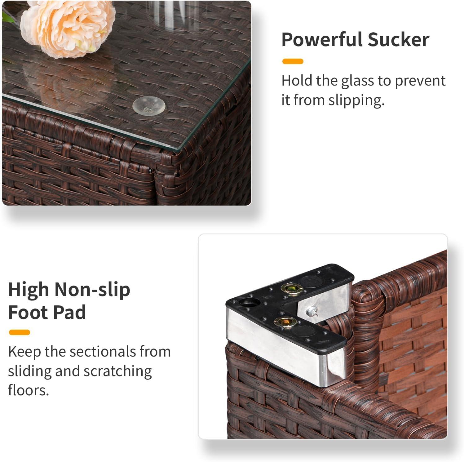【Strong and safe】 : The patio rattan table is equipped with a movable toughened glass table with high hardness, and the table has a powerful suction cup to fix the glass table to ensure stability. The set has non-slip foot pads to prevent the chair and sofa from sliding and scratching the floor, which is safe and reliable. The suit has good load-bearing capacity and is solid overall.