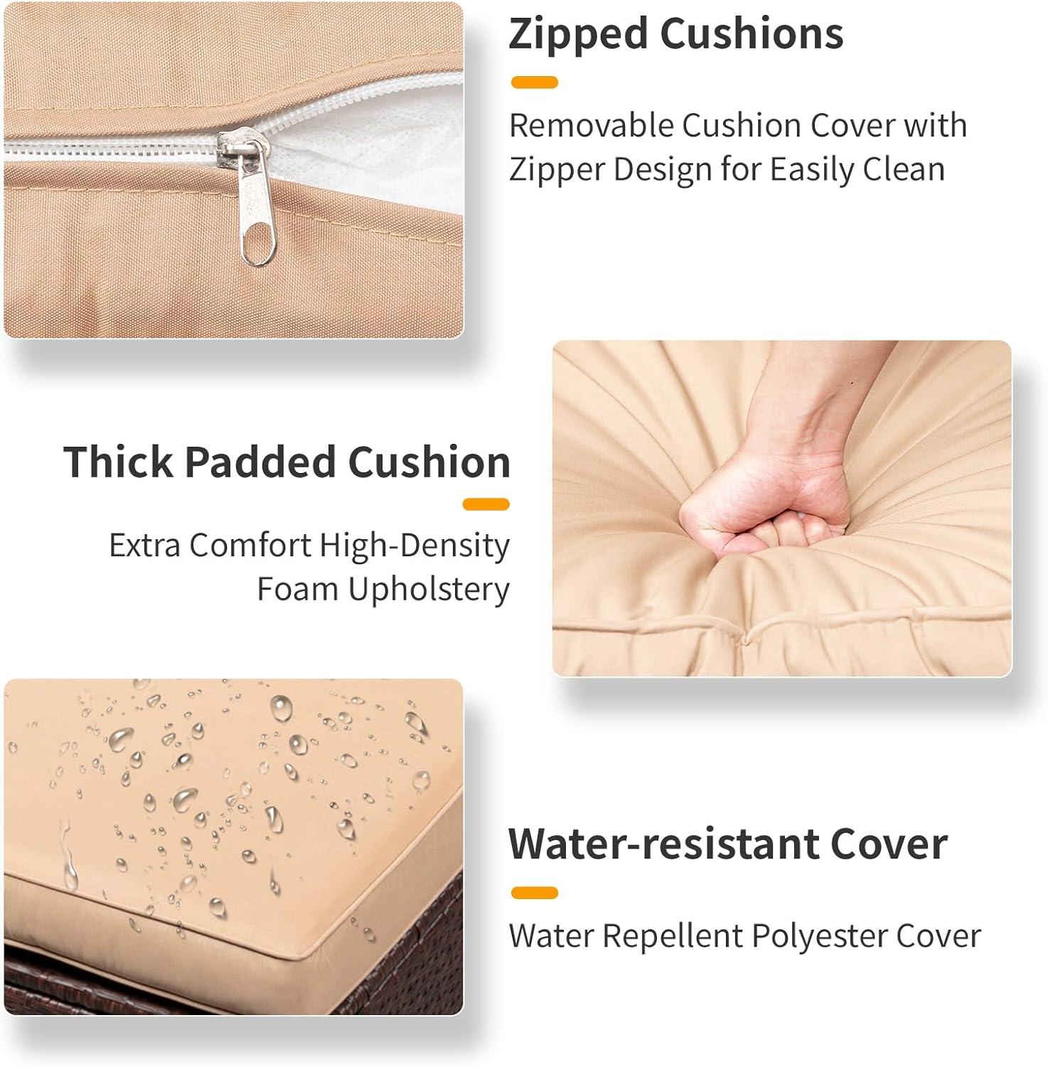 【Easy maintenance】 : All cushions can be moved, cushions cover can be removed, and waterproof, no water seepage, easy to clean. The wicker outdoor furniture setset is not easy to dirty, even if dirty with a dry cloth or wet cloth wipe can be clean as new, very convenient, ottoman can prevent in the sofa chair when not in use to save space under the chair.