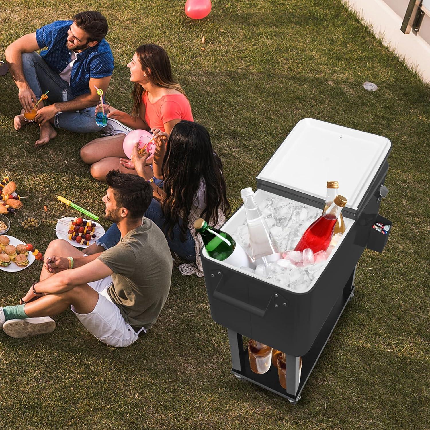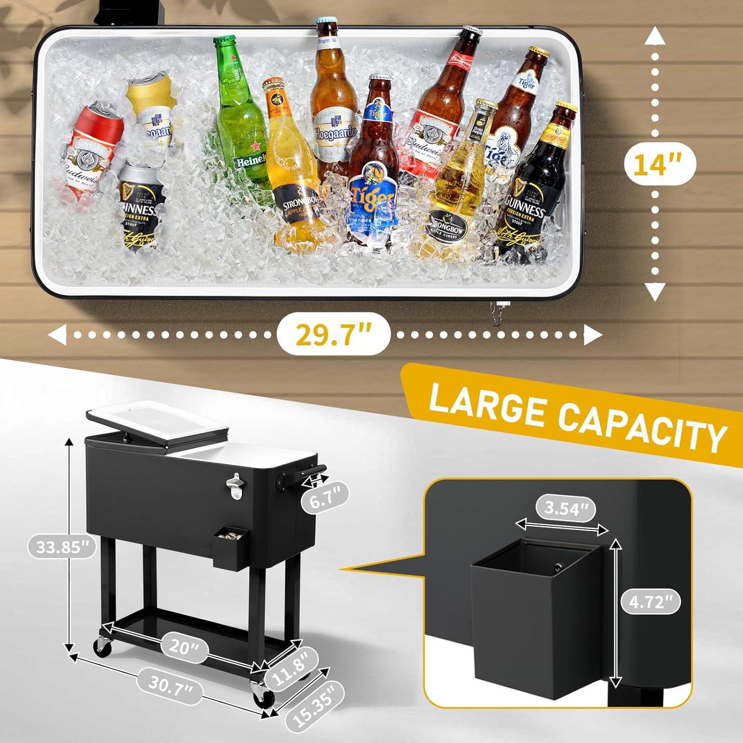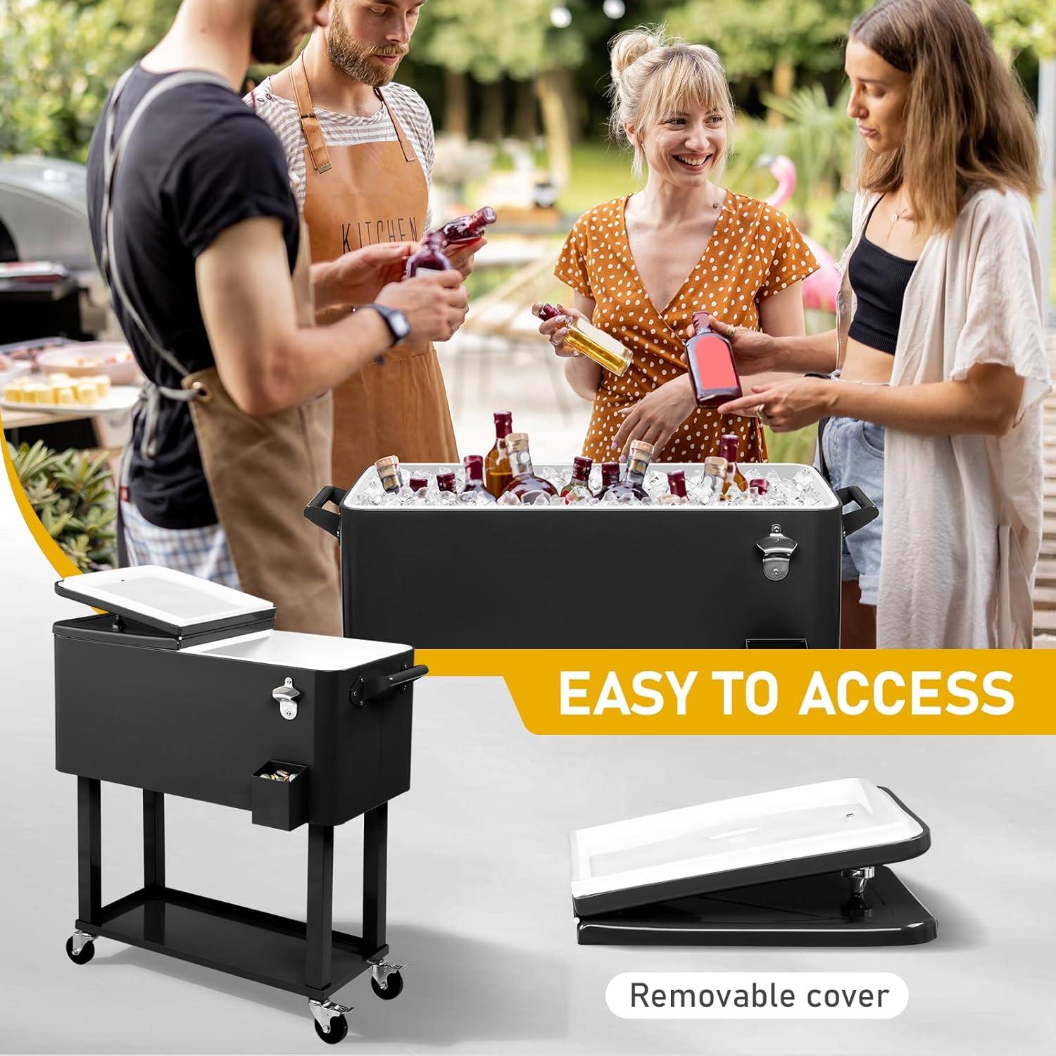 Outvita 80 Quart Rolling Ice Chest, Portable Bar Drink Cooler with Catch Basin, Bottom Storage Tray and Bottle Opener for Patio Party BBQ Beach Activities(Black)