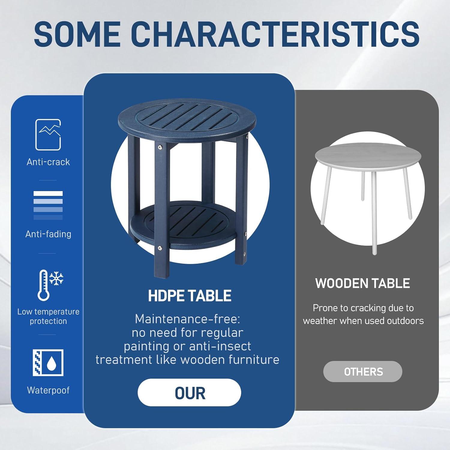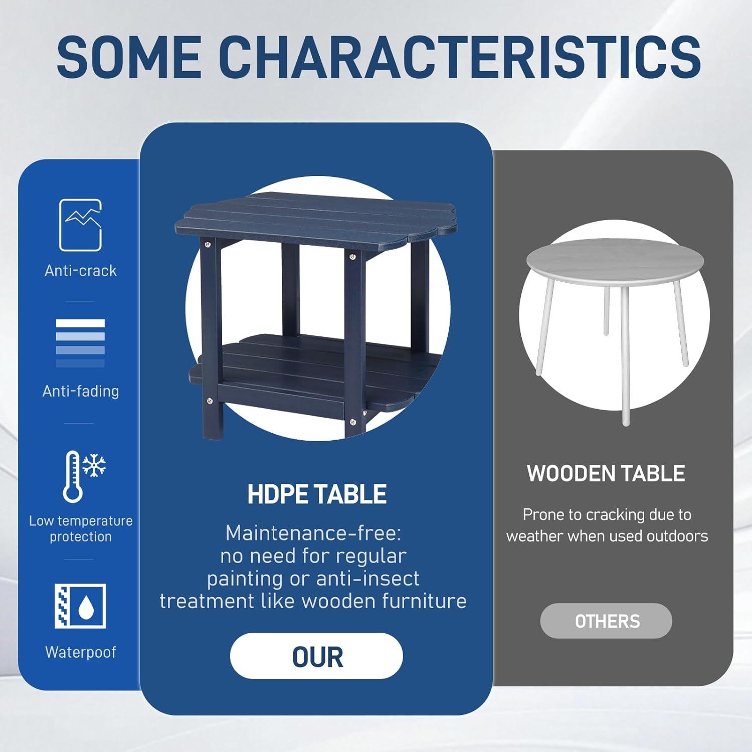 【WEATHER RESISTANT MATERIAL】The porch table is made of HDPE material with a beautiful touch of wood and realistic wood look. Compare with wood, HDPE material with strong durability and strength that is not easy to crack and rot. Featuring strong UV resistance, ensuring long-term color retention even in outdoor areas