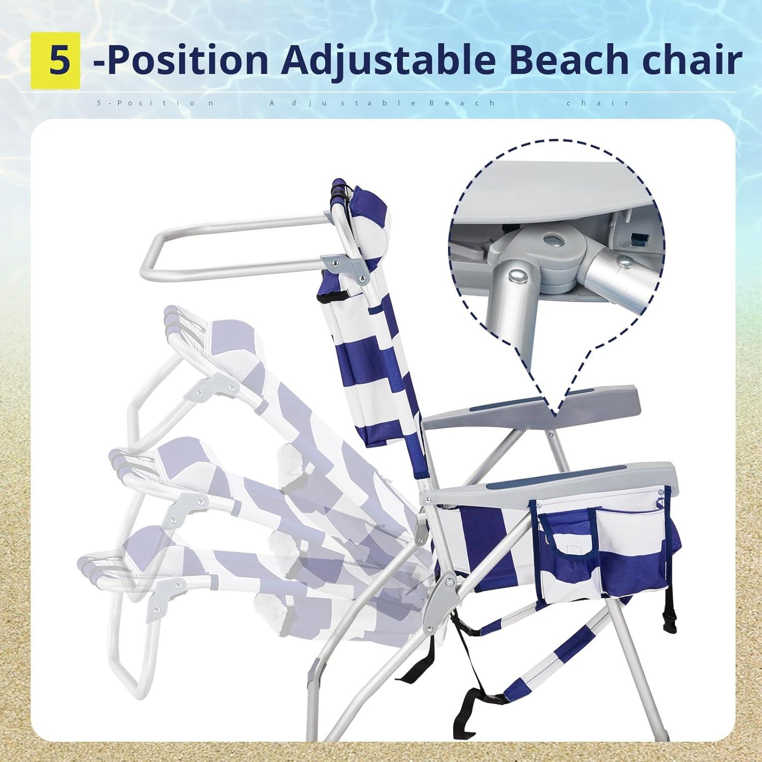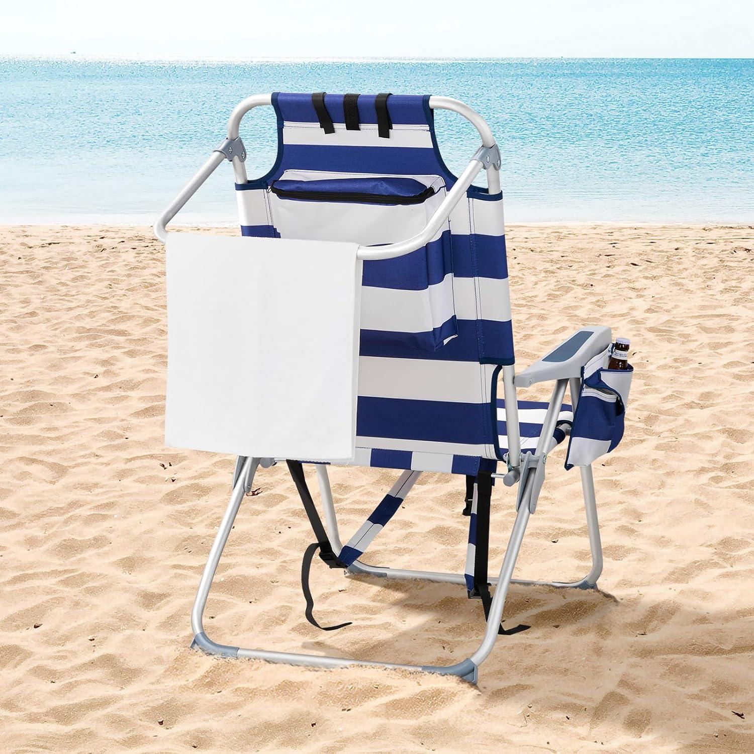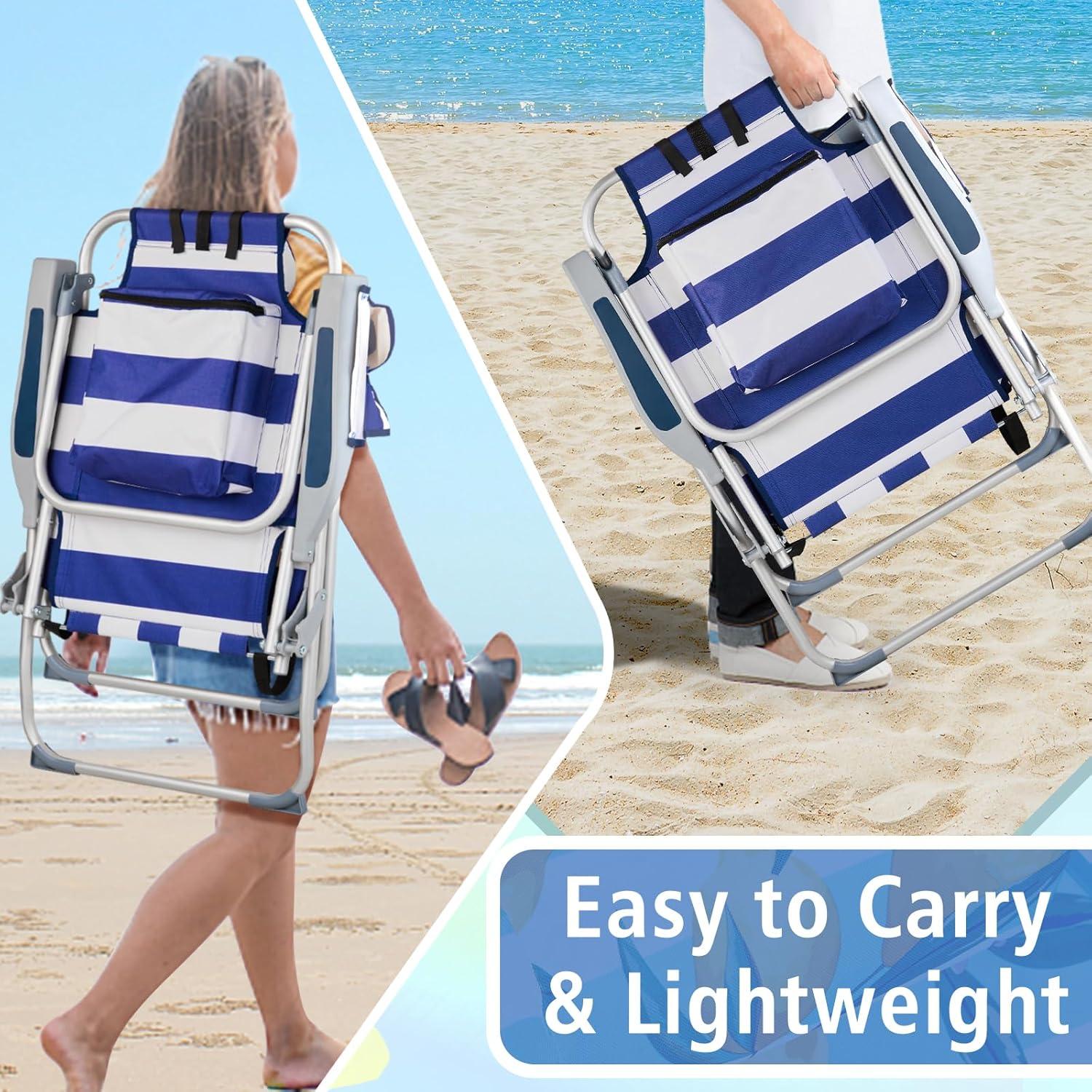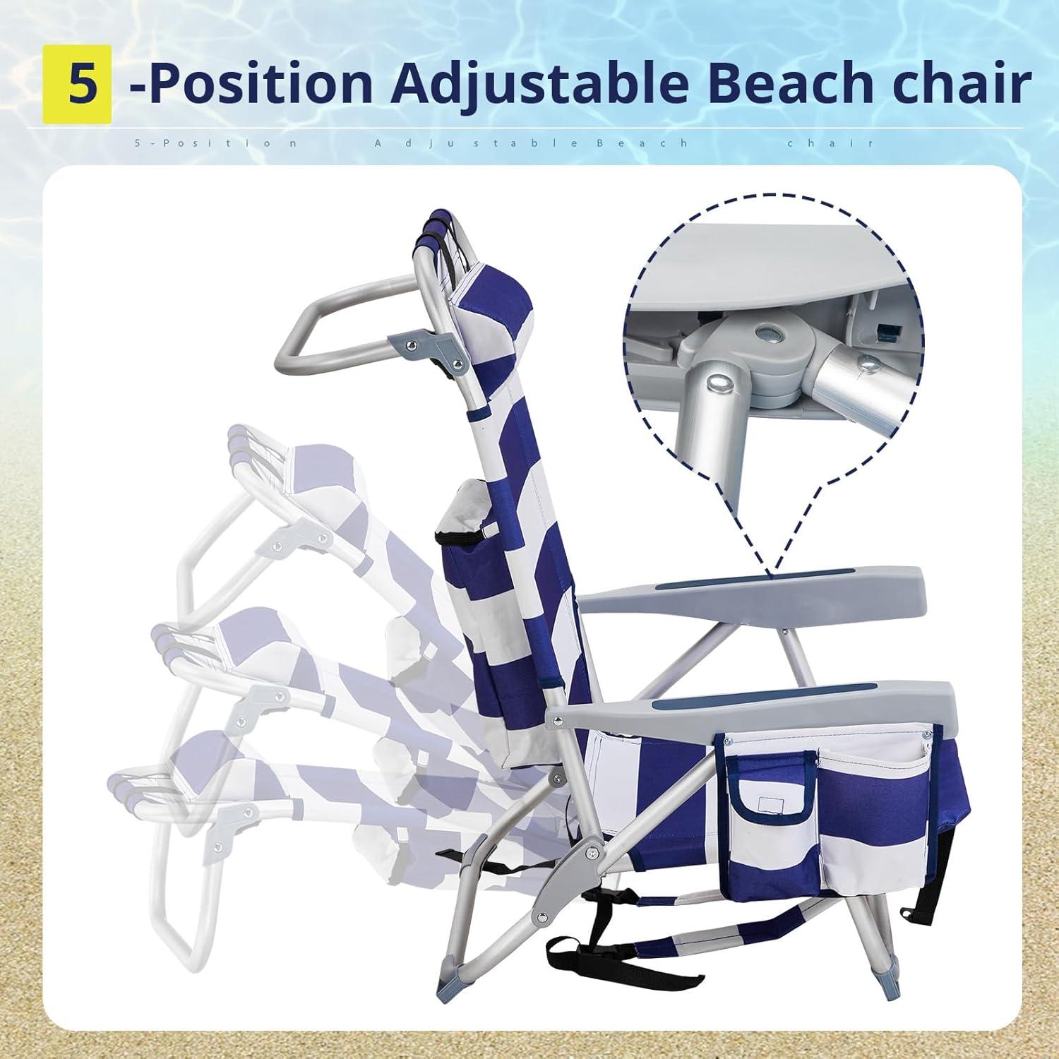 Outvita Backpack Beach Chair, 5 Level Adjustable Positions Beach Chair with Back Storage Bag, Cooler Pouch and Side Bags for Beach Poolside Lawn(Blue)