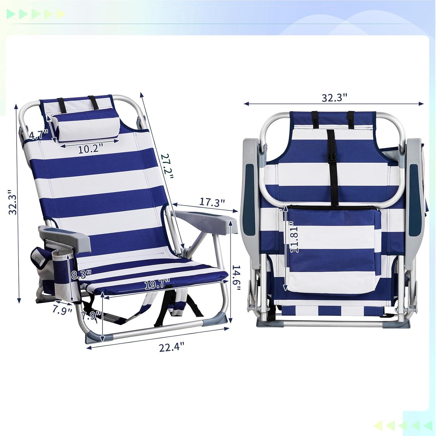 Outvita Backpack Beach Chair, 5 Level Adjustable Positions Beach Chair with Back Storage Bag, Cooler Pouch and Side Bags for Beach Poolside Lawn(Blue&white)