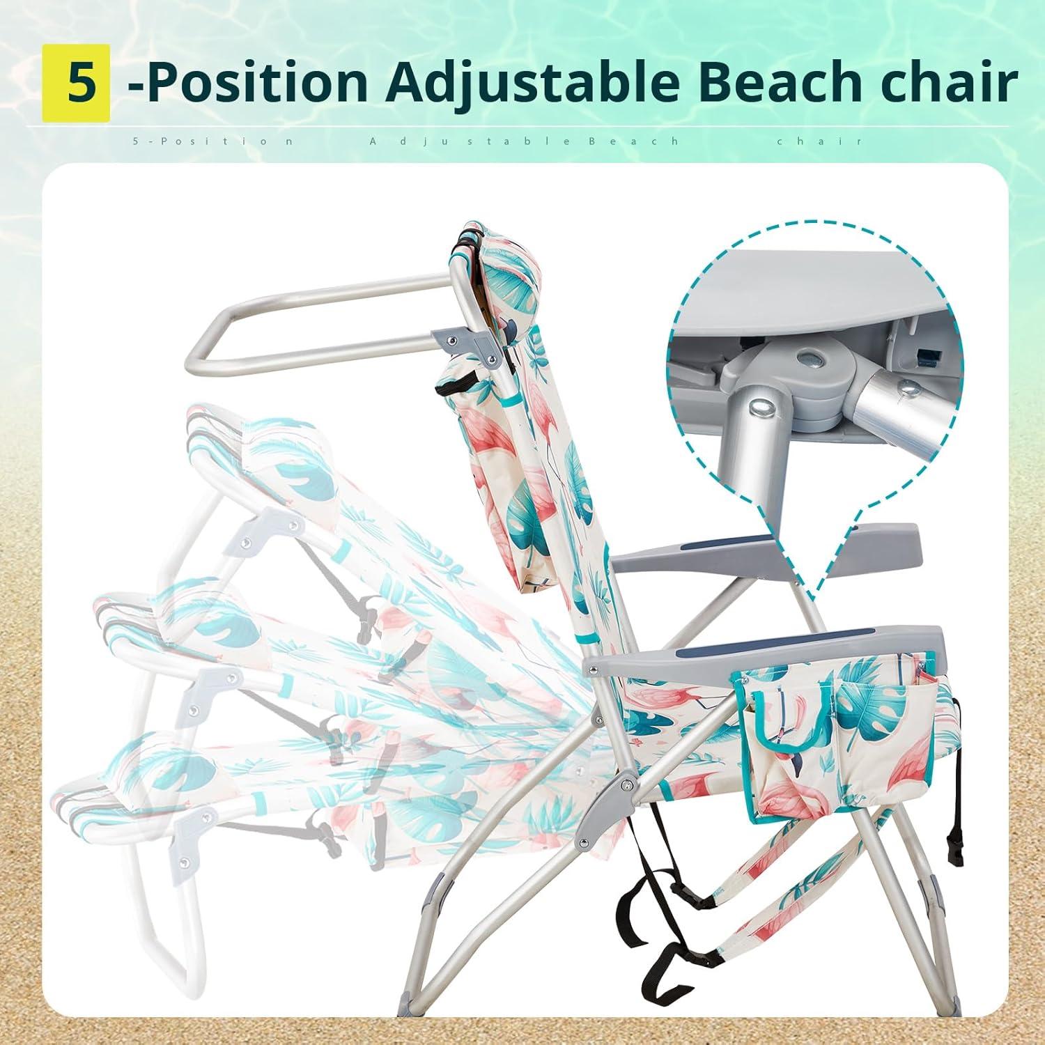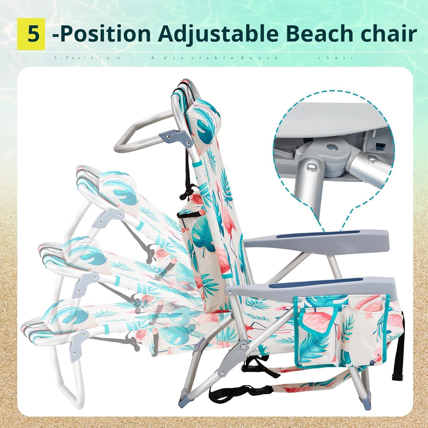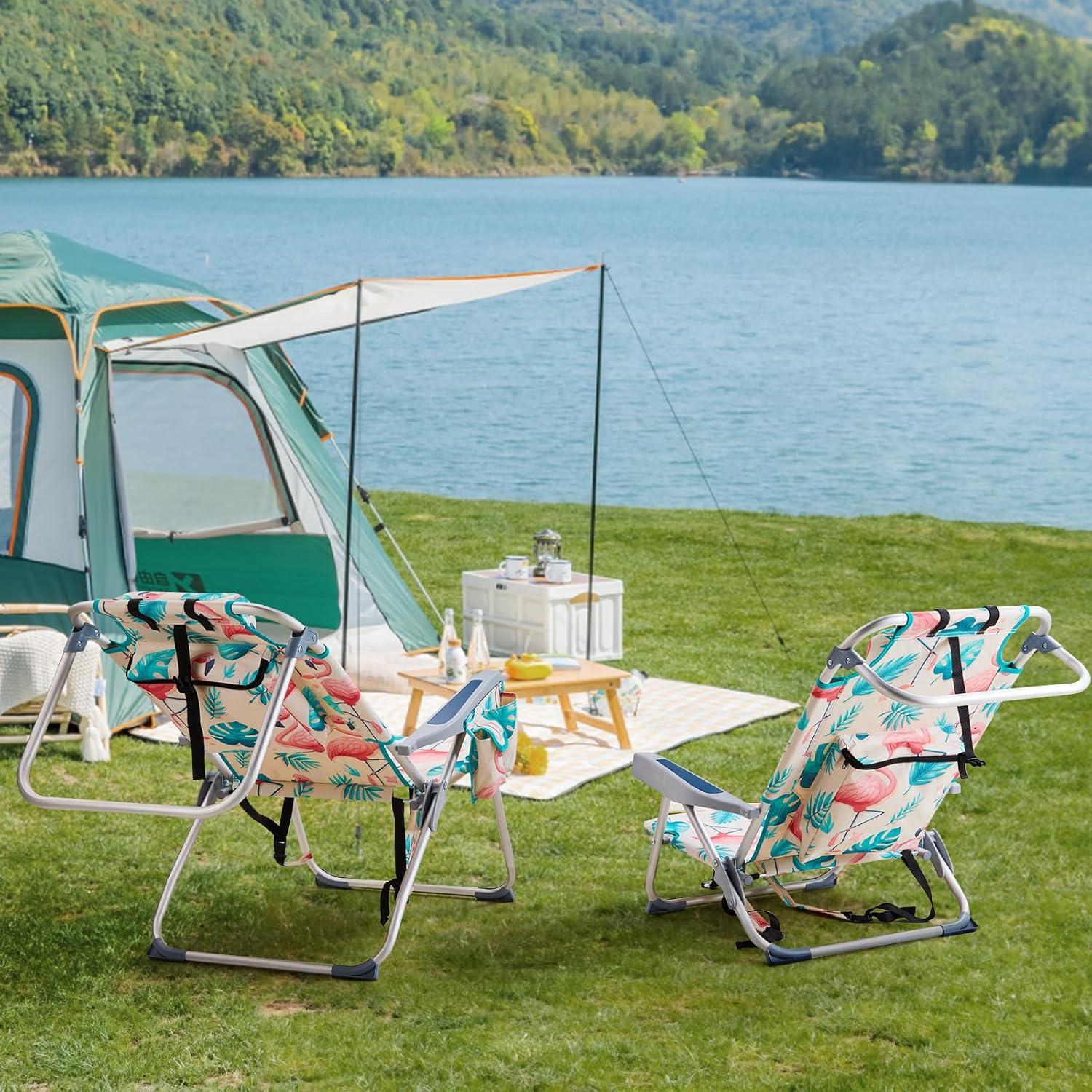 Outvita Backpack Beach Chair, 5 Level Adjustable Positions Beach Chair with Back Storage Bag, Cooler Pouch and Side Bags for Beach Poolside Lawn(Flamingo)
