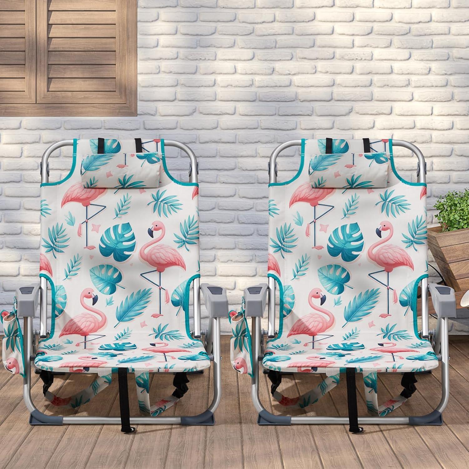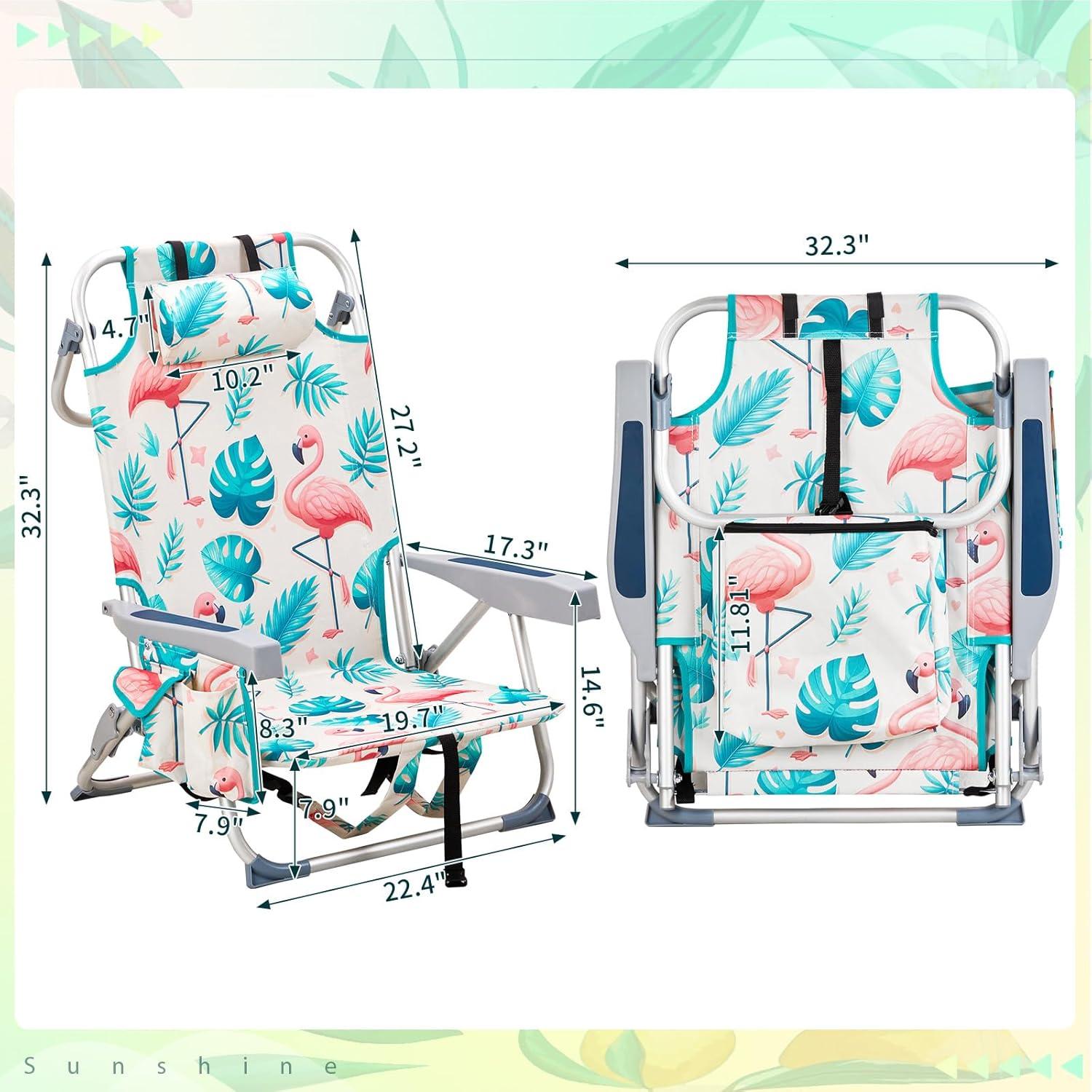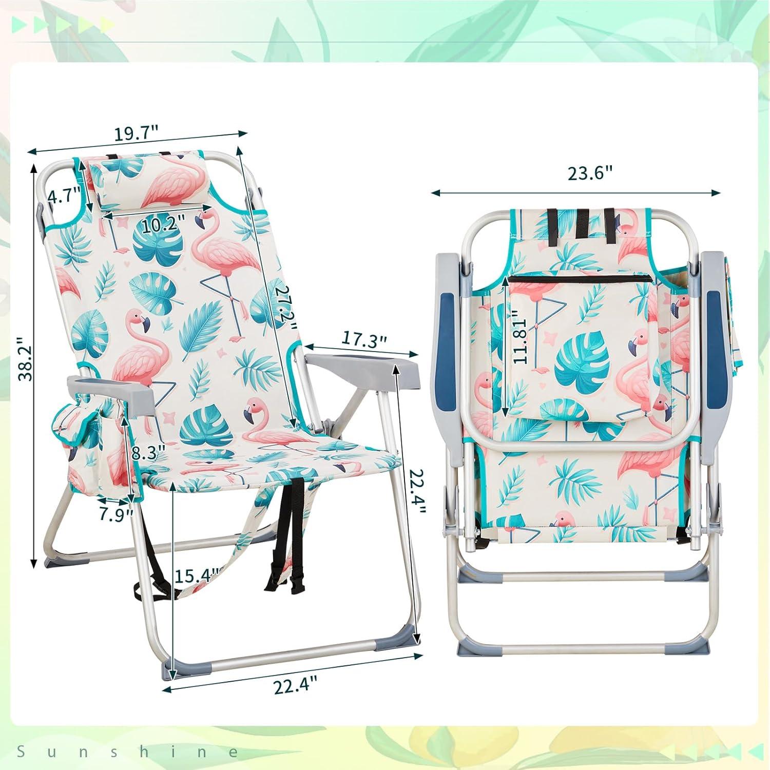 Outvita Backpack Beach Chair, 5 Level Adjustable Positions Beach Chair with Back Storage Bag, Cooler Pouch and Side Bags for Beach Poolside Lawn(Flamingo)