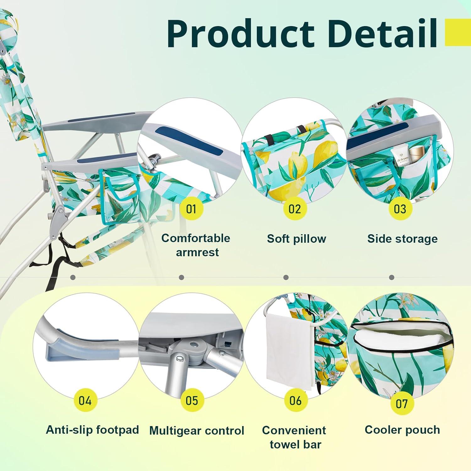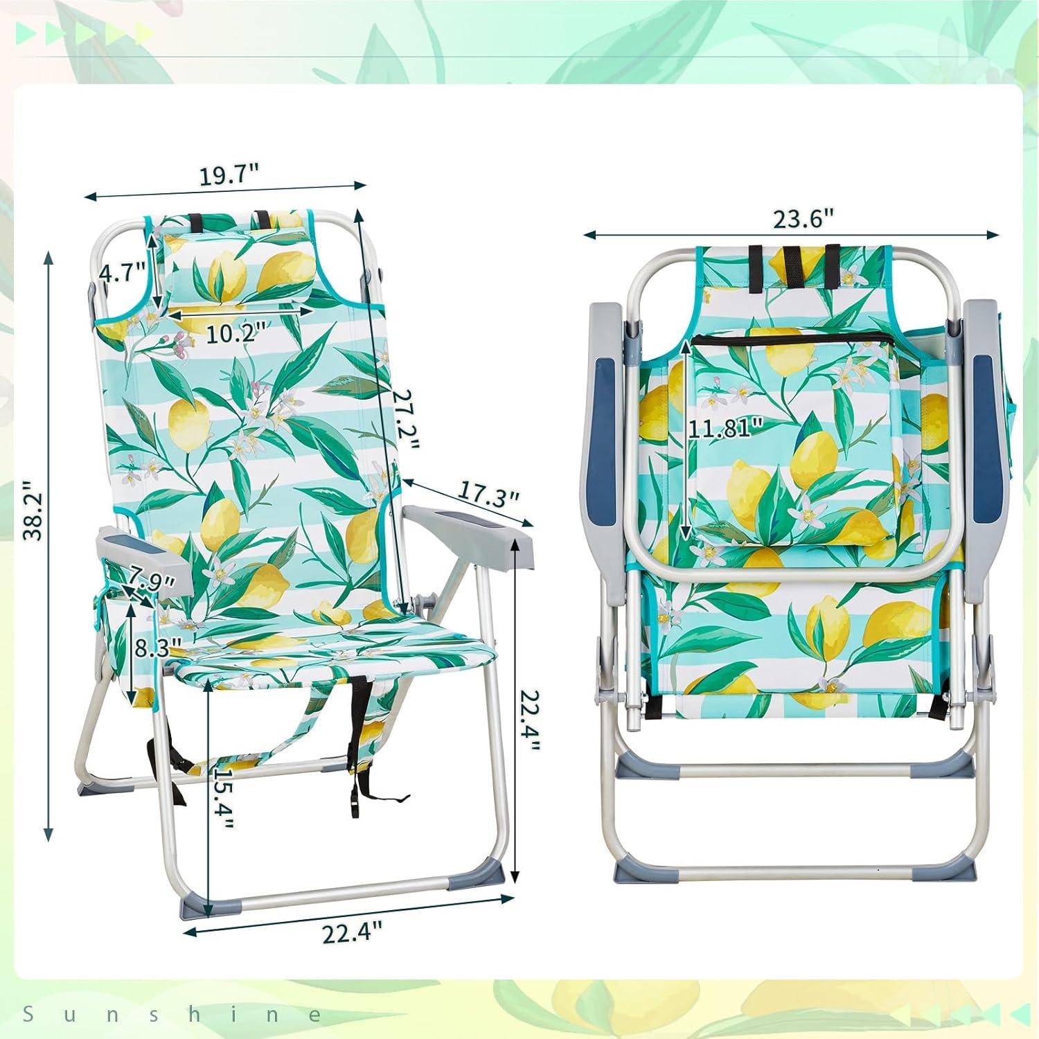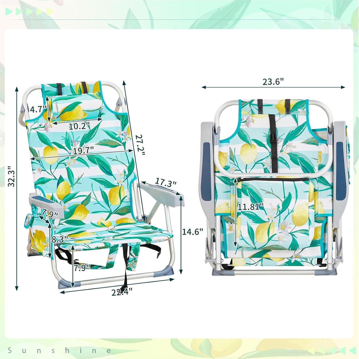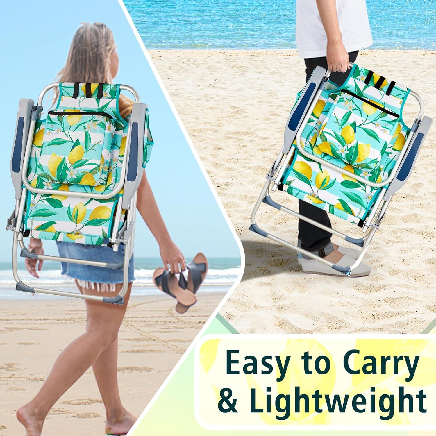 Outvita Backpack Beach Chair, 5 Level Adjustable Positions Beach Chair with Back Storage Bag, Cooler Pouch and Side Bags for Beach Poolside Lawn(Lemon)