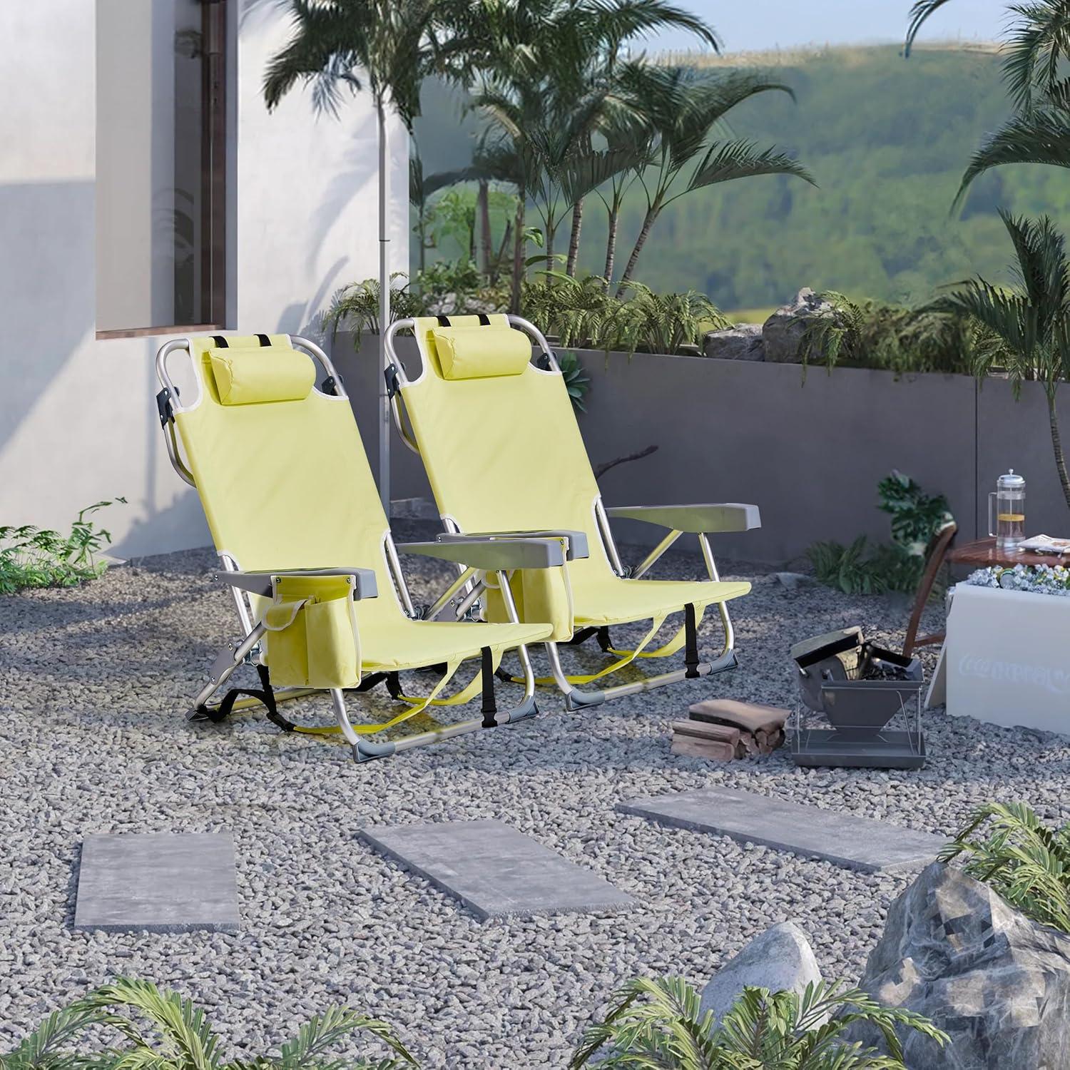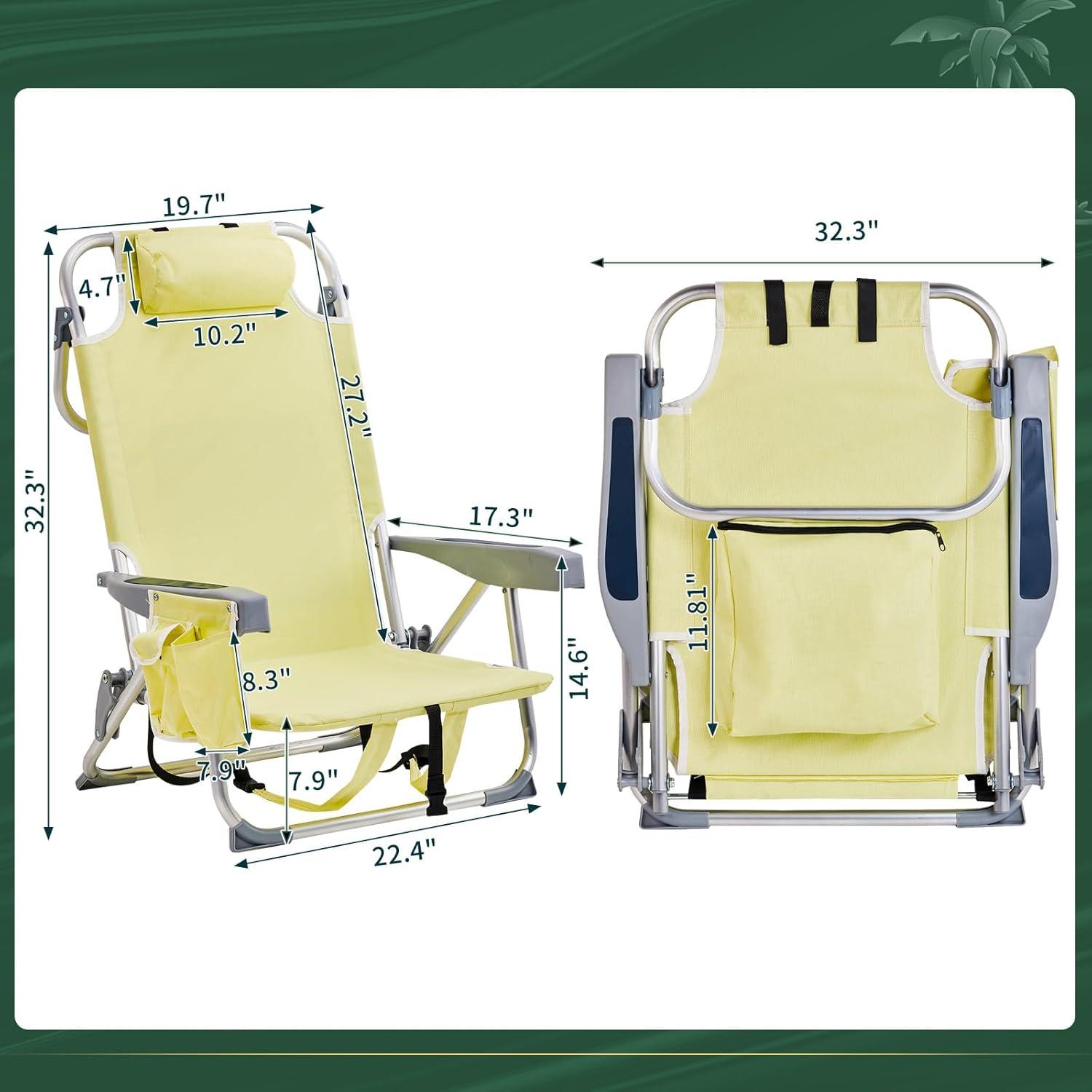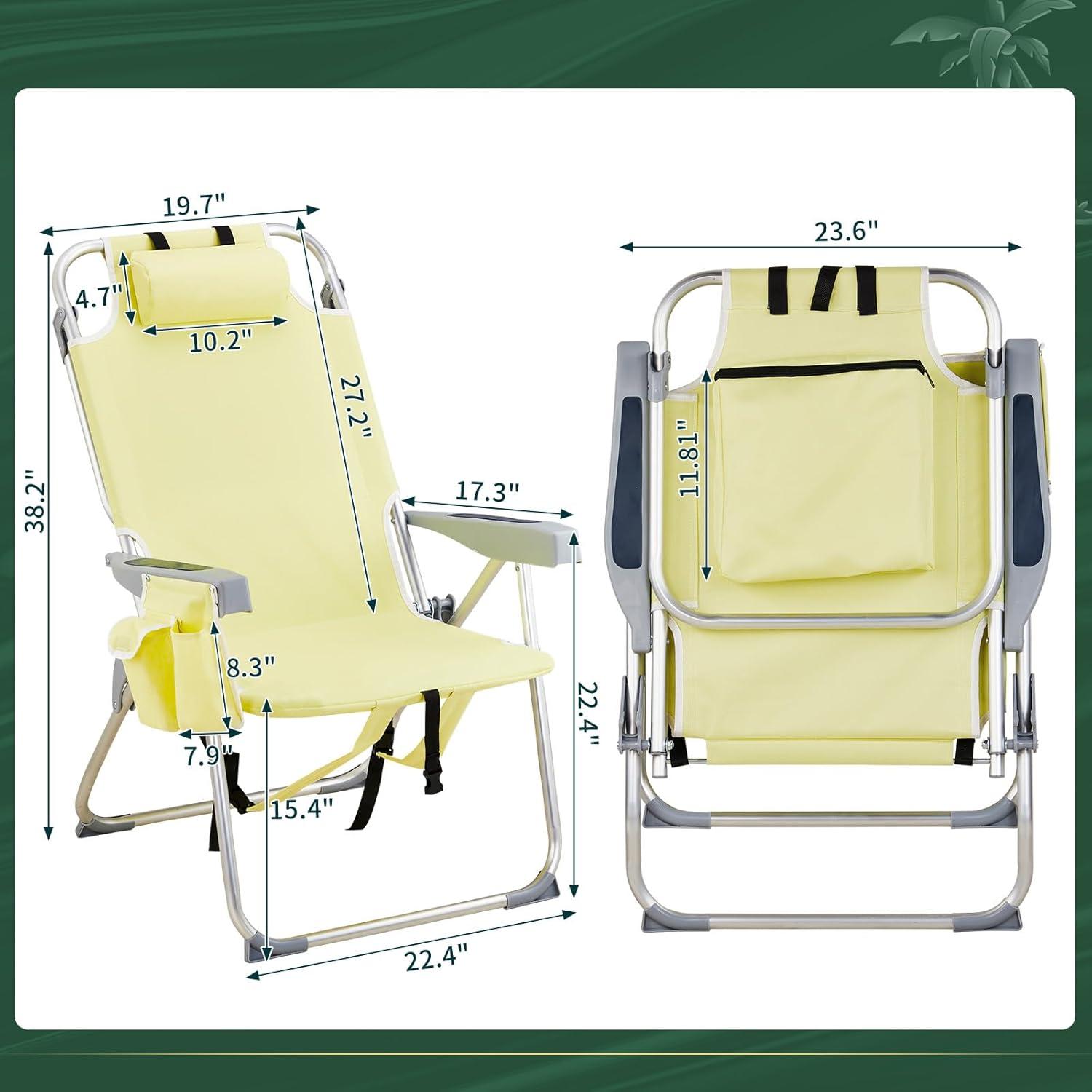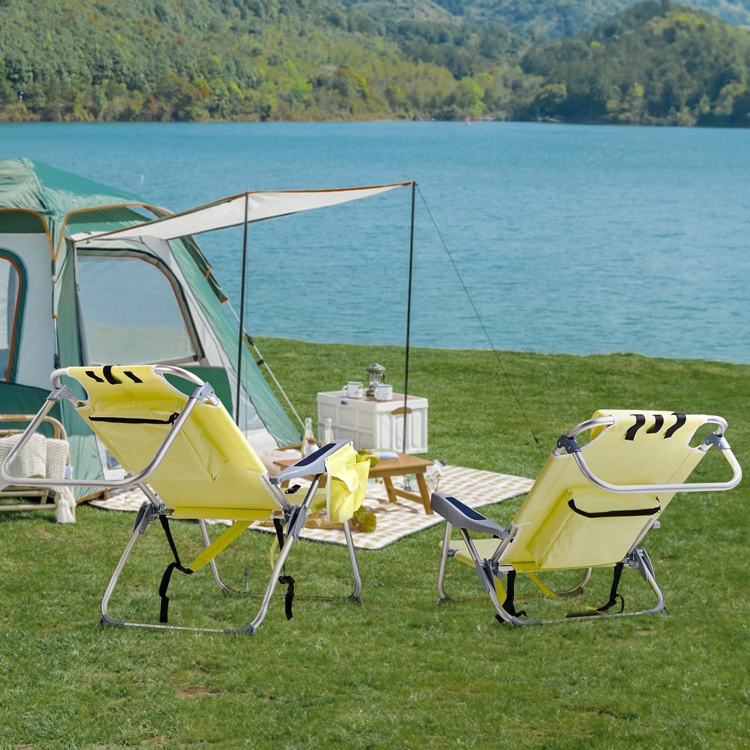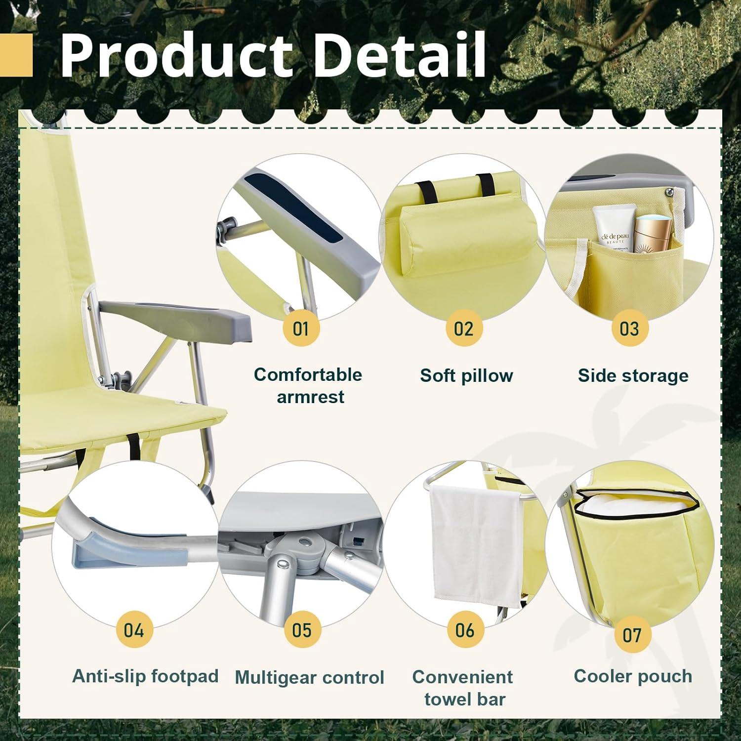 Outvita Backpack Beach Chair, 5 Level Adjustable Positions Beach Chair with Back Storage Bag, Cooler Pouch and Side Bags for Beach Poolside Lawn(Yellow)