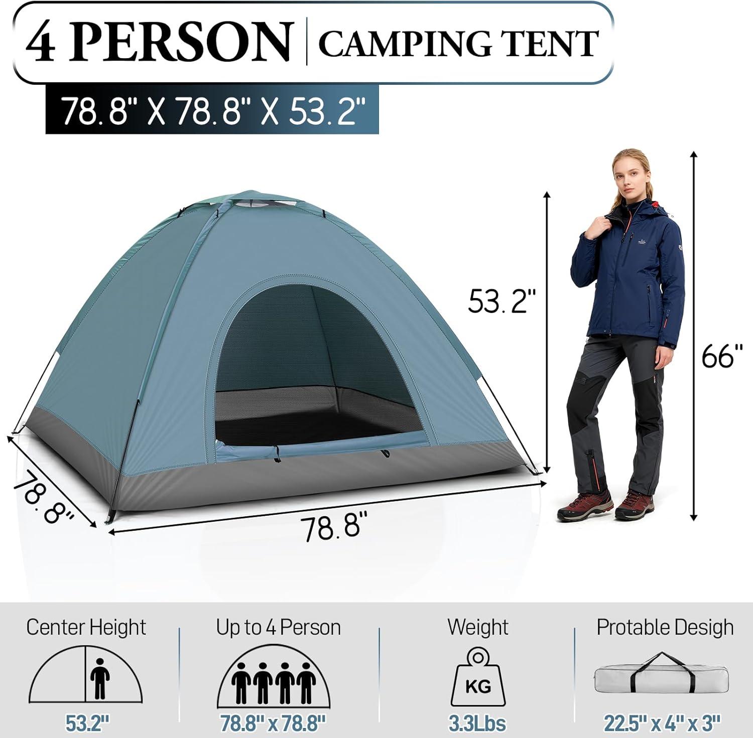 【SPACIOUS FOR 3-4 PERSON】This family camping tent with large size (6.56 x 6.56 x 4.43)' (L x W x H), designed for a roomy and overall cozy experience. The outdoor backpacking tent can be set up easily and quickly within 10 min, is an ideal choice for family trip at weekends