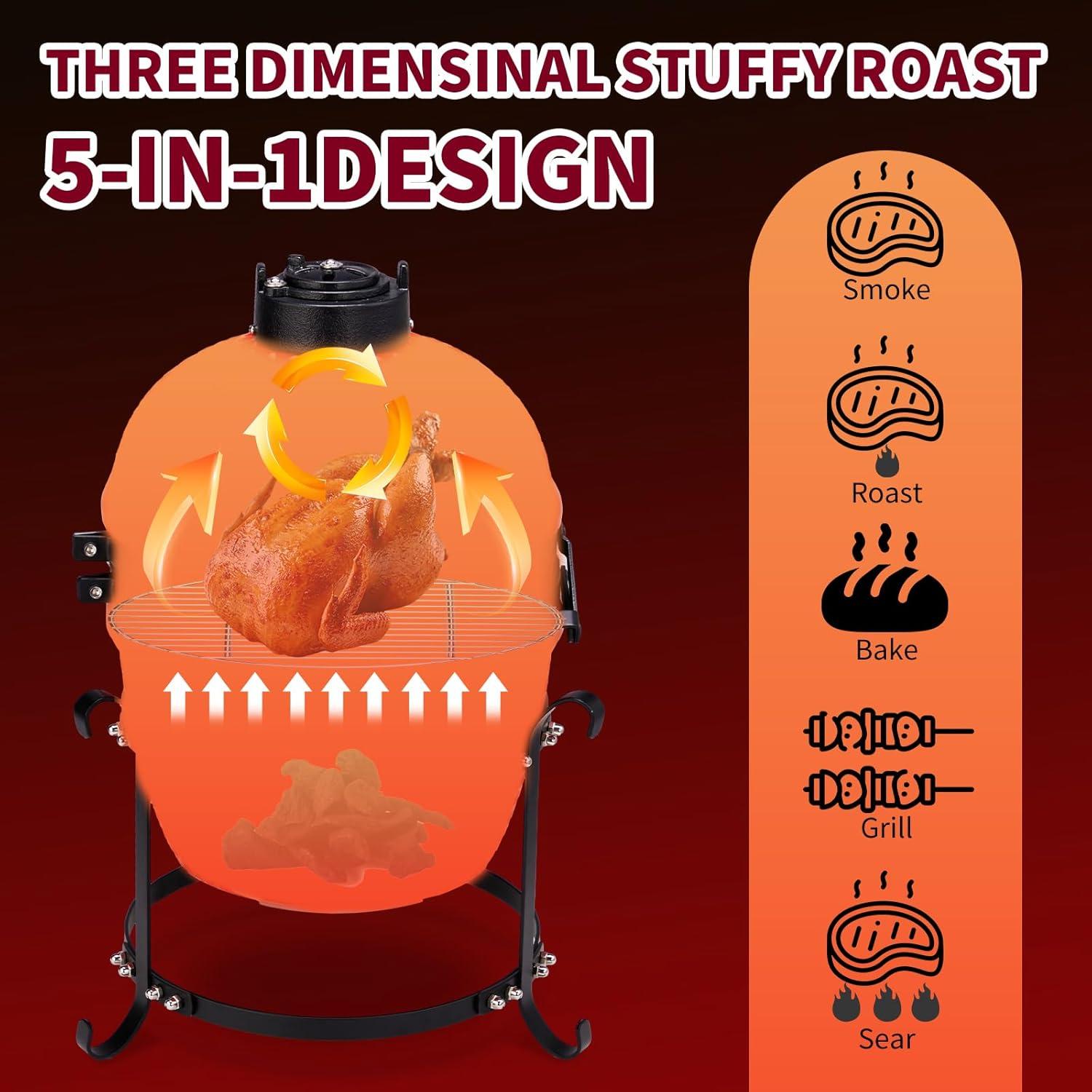 【Strong Support】The support legs of the patio grill are secured by 12 hardware screws, adding stability to the grill. The Kamado design makes it fuel-efficient so that you can use less charcoal when cooking.