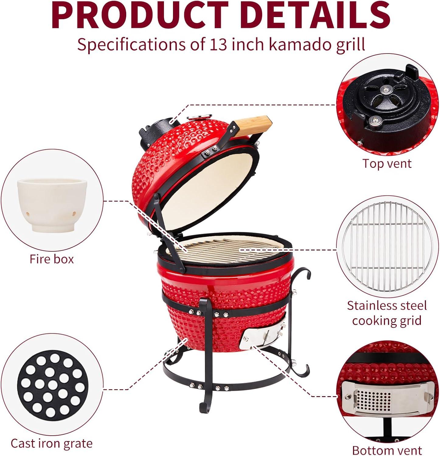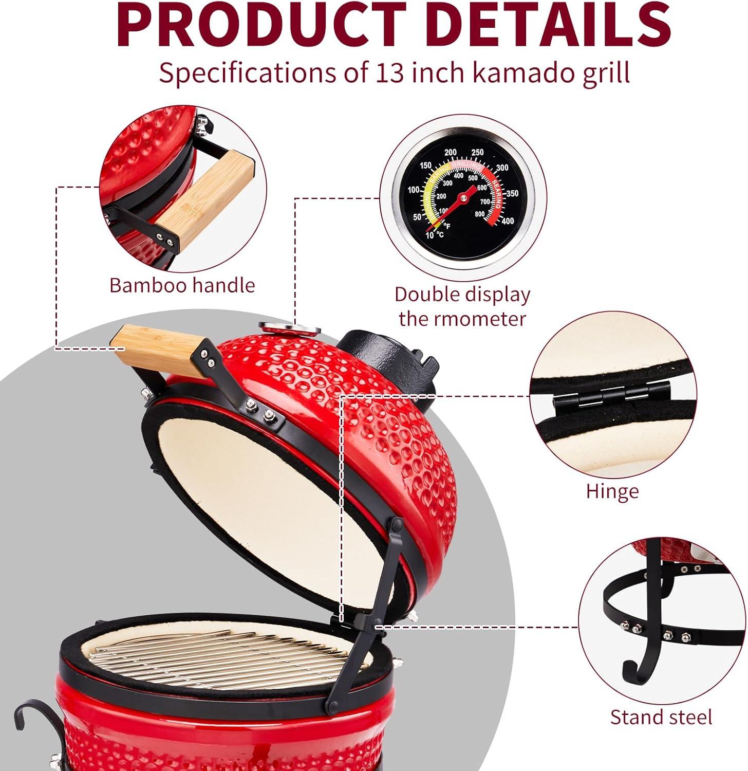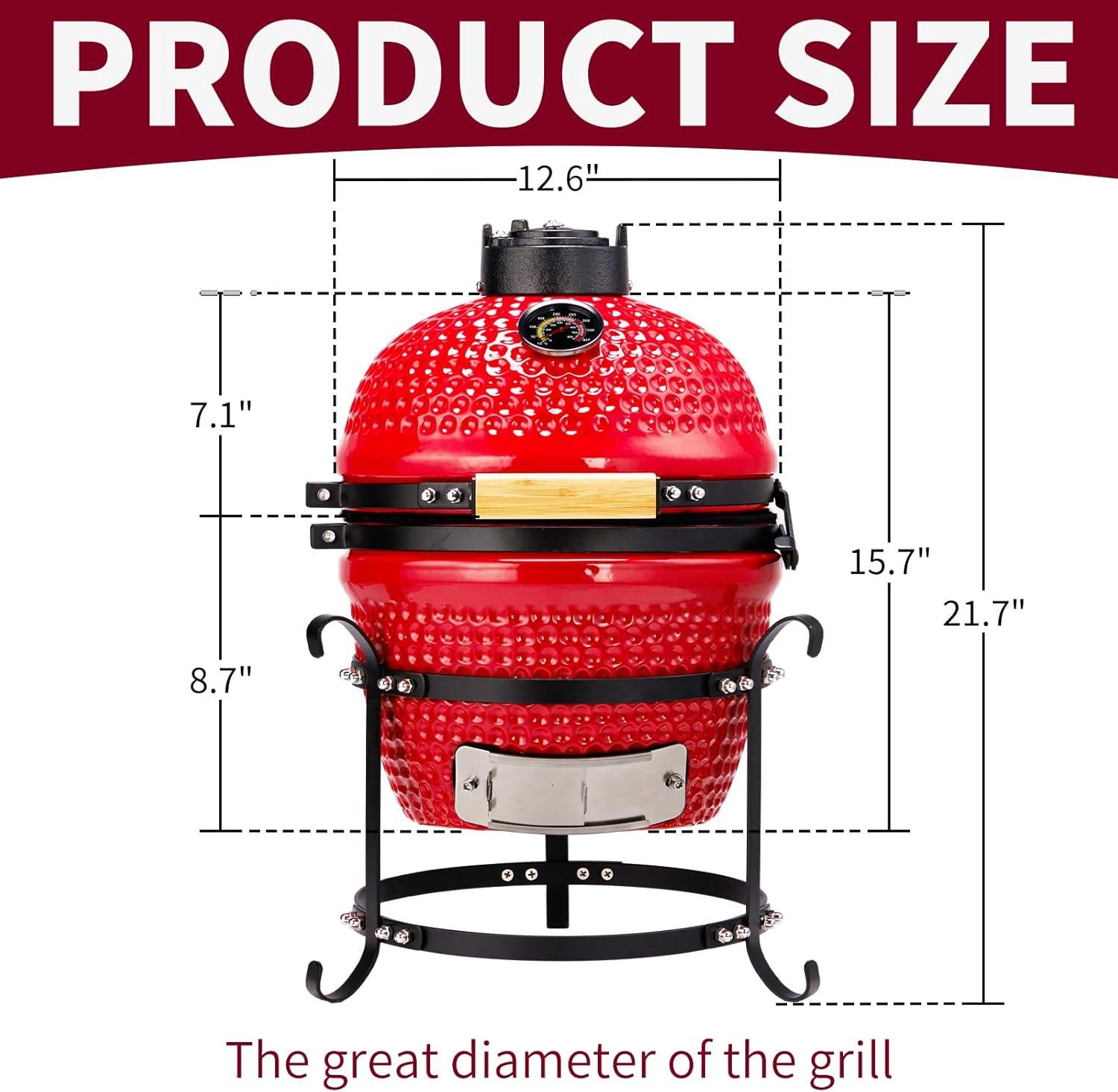Outvita Ceramic Grill, 13″ Round Kamado Charcoal Grill, Portable Barbecue Grill with Thermometer for Variations on Cooking Methods(Black)(Split bracket-Red)