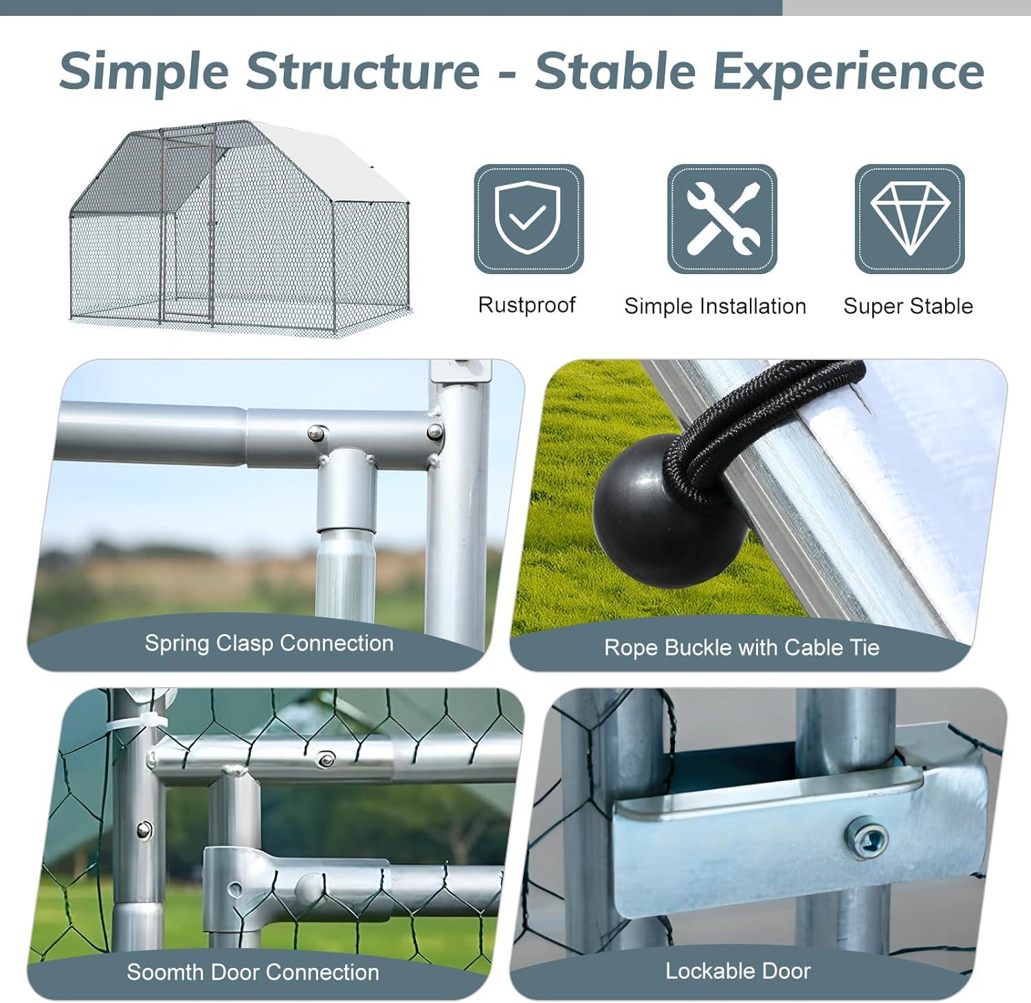 【Effortless Assembly】: Accompanied by comprehensive assembly instructions, the chicken house boasts a quick-connecting design that integrates spring bolt at every juncture of its frame. The bottom of the chicken coop features fixable metal feet, facilitating effortless installment and ensuring a durable and steadfast structure for the long haul
