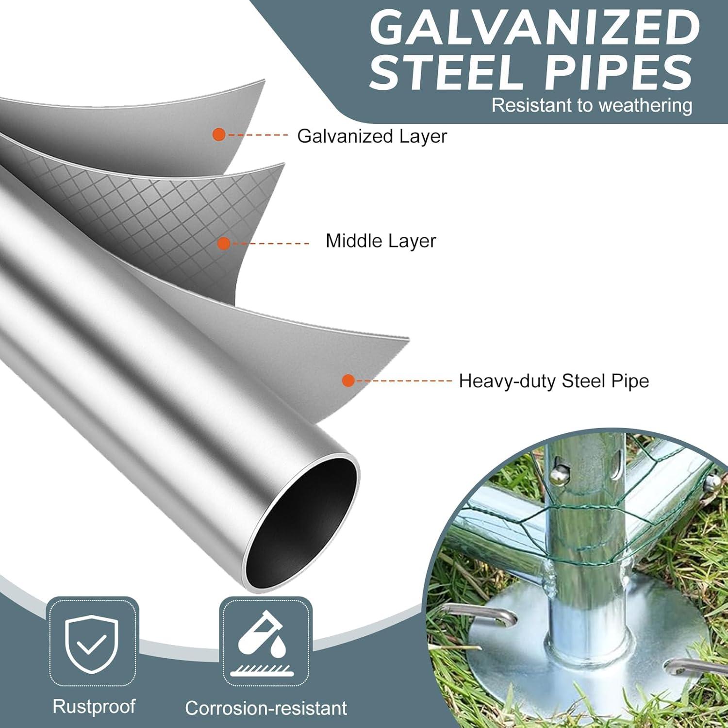 【Robust Construction】: The heavy-duty frame of the chicken coop features a 1-inch diameter, utilizing a galvanized coating process to ensure long-lasting stability and durability in outdoor spaces. The full-coverage hexagonal steel wire mesh of the chicken cage is coated with PVC, providing optimal ventilation, serves as a robust barrier that thwarting escape attempts and safeguarding your animals from potential predators