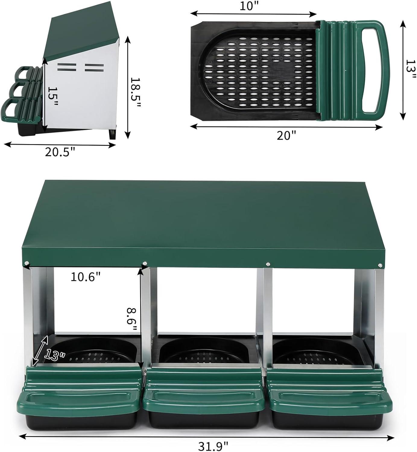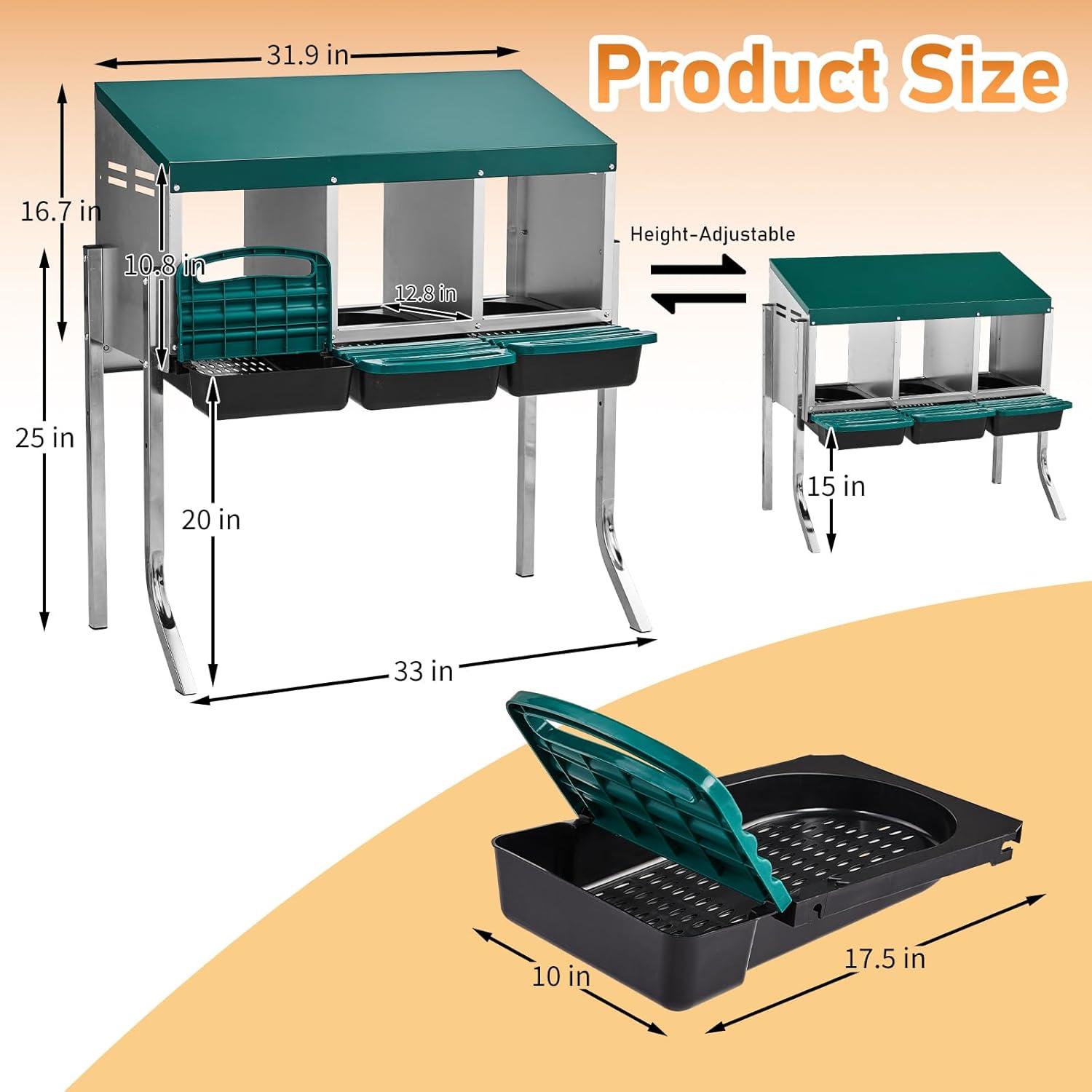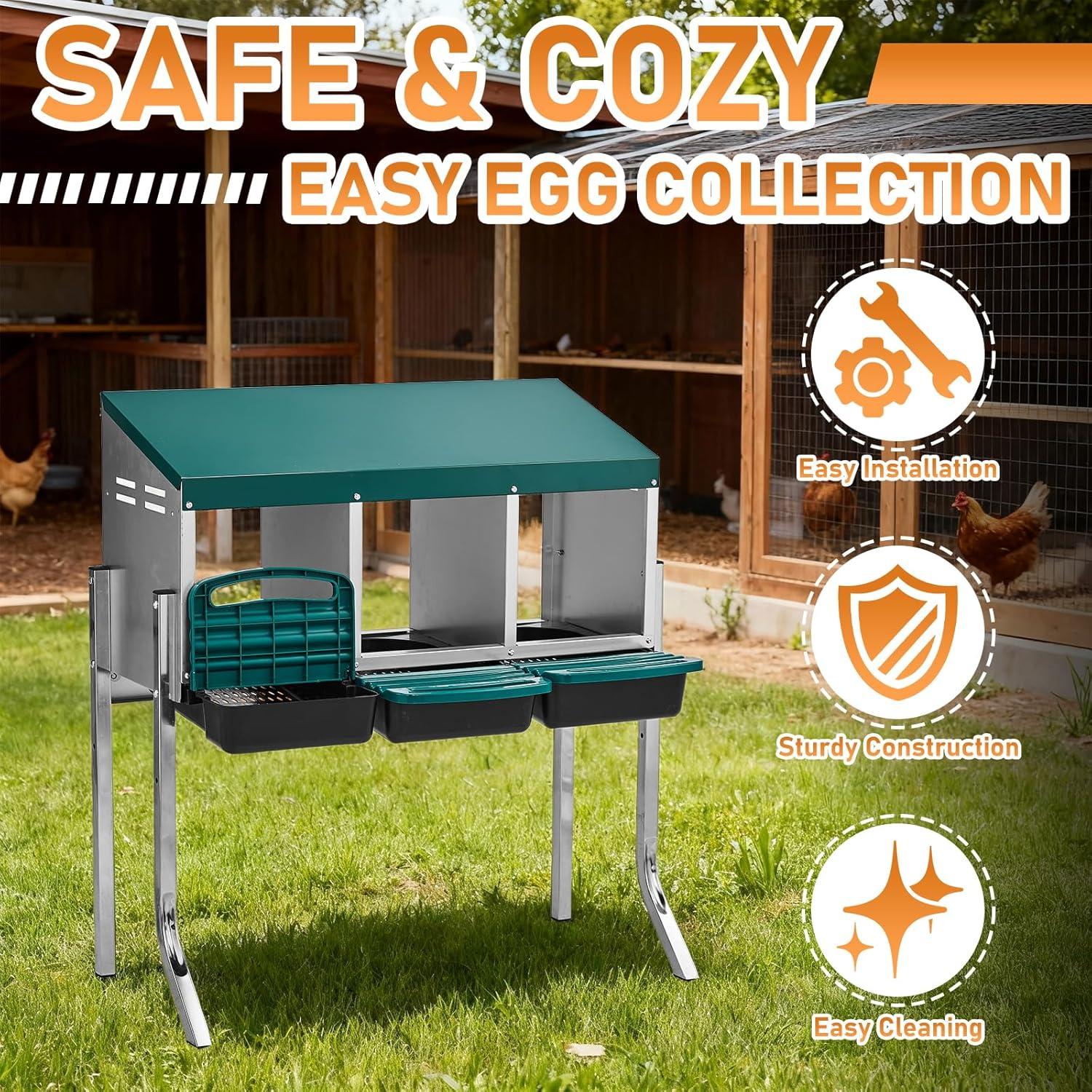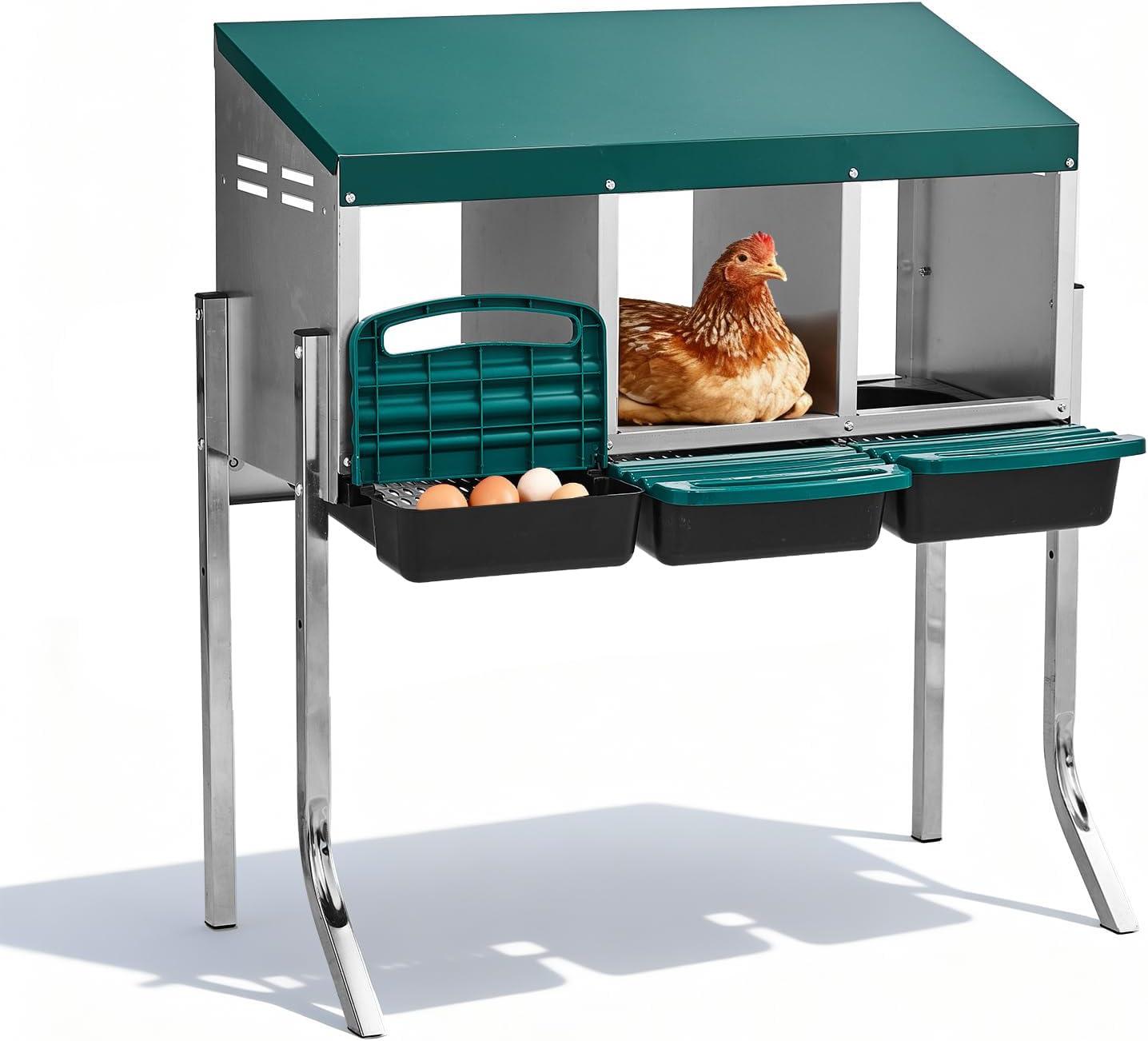 【Premium Quality】:Crafted with high-grade galvanized steel and plastic components, our nesting boxes for chickens are built to deliver long-lasting performance. This chicken nesting box boasts excellent resistance to harsh outdoor weather, rust, and wear, ensuring reliable use even in challenging farm or backyard conditions. The sturdy structural design guarantees stability, providing a secure nesting space for your hens for years to come.