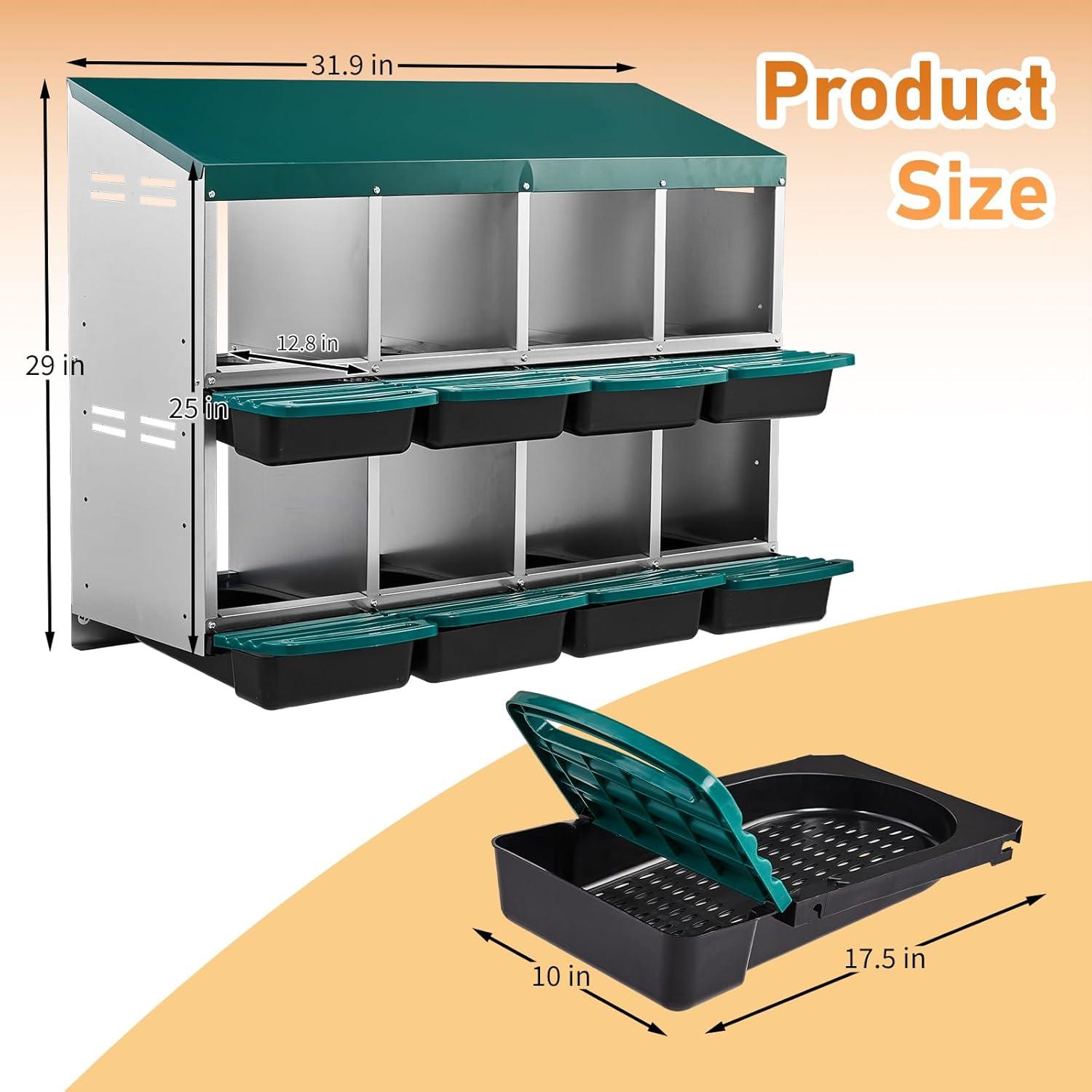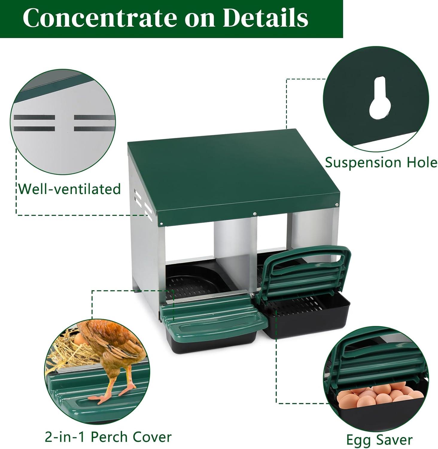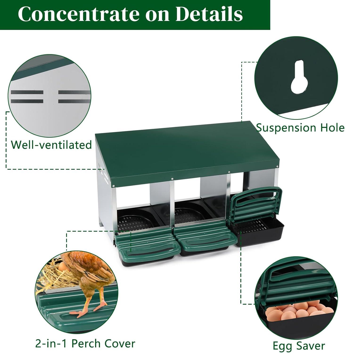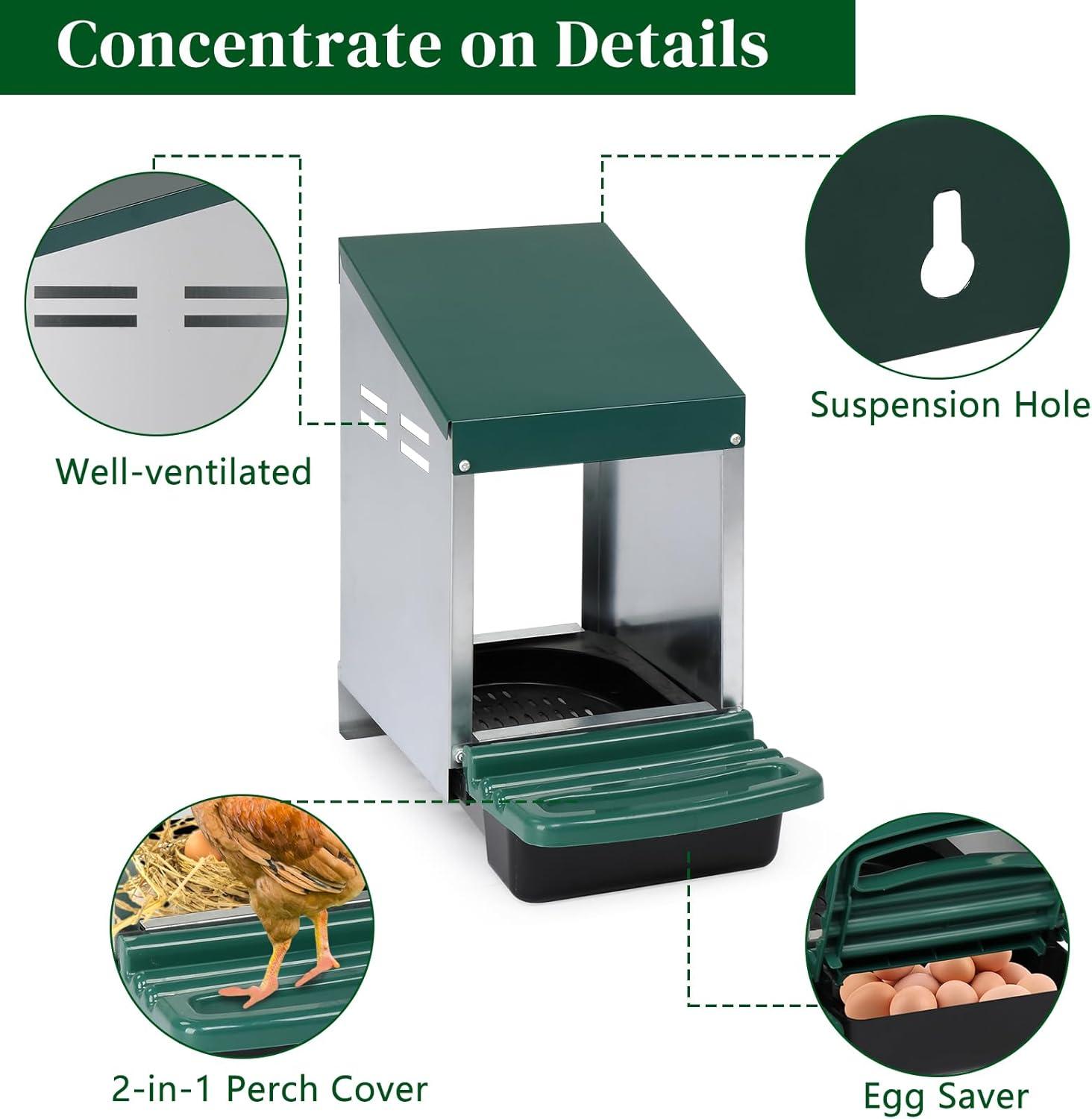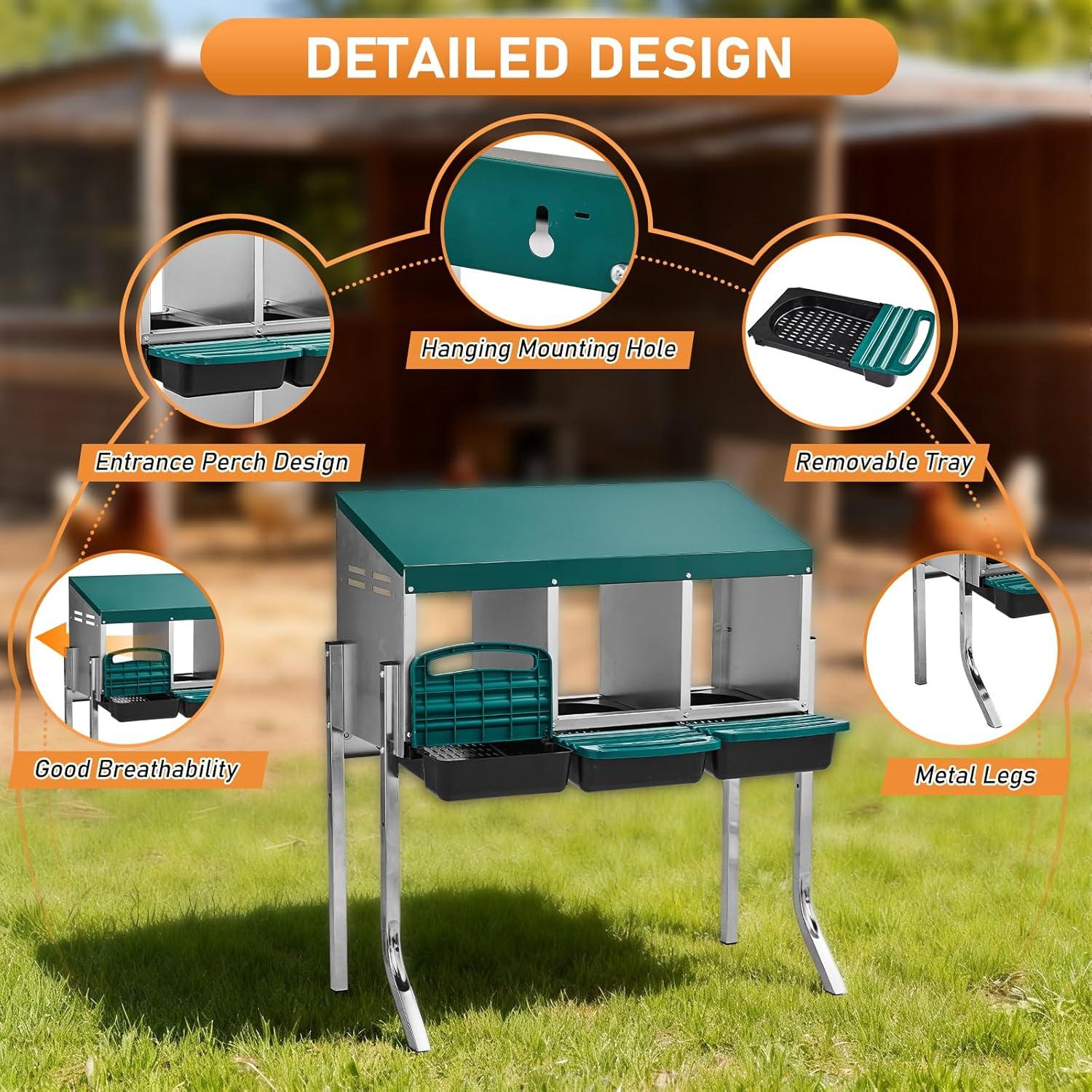 【Premium Quality】:Crafted with high-grade galvanized steel and plastic components, our nesting boxes for chickens are built to deliver long-lasting performance. This chicken nesting box boasts excellent resistance to harsh outdoor weather, rust, and wear, ensuring reliable use even in challenging farm or backyard conditions. The sturdy structural design guarantees stability, providing a secure nesting space for your hens for years to come.