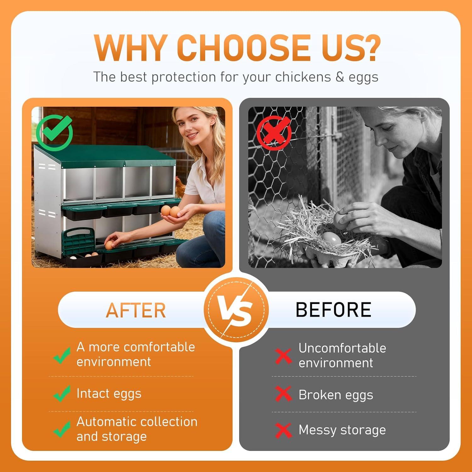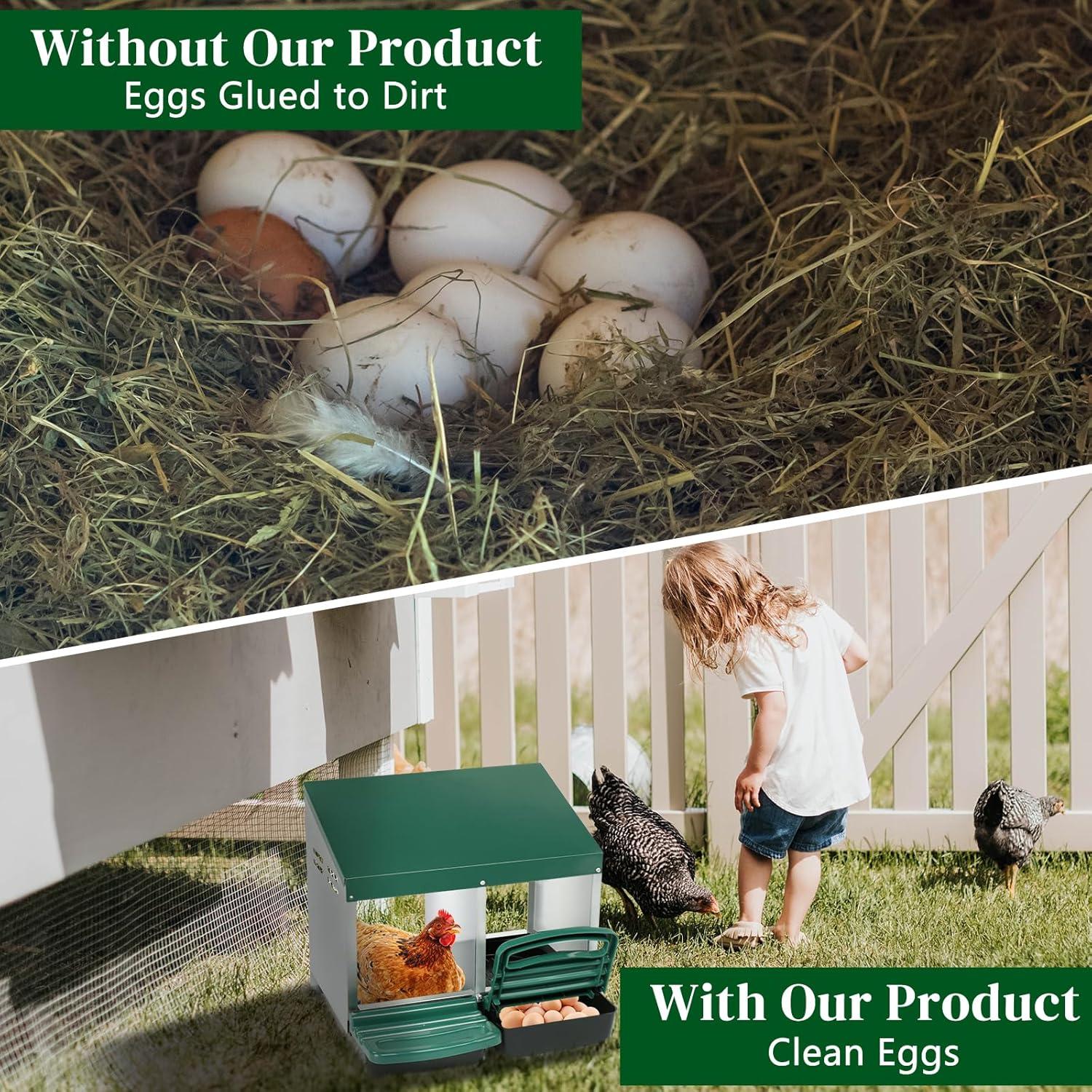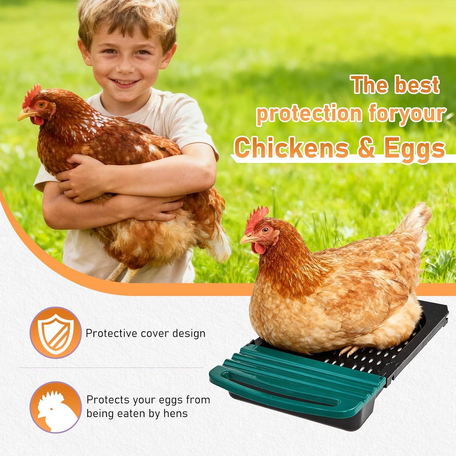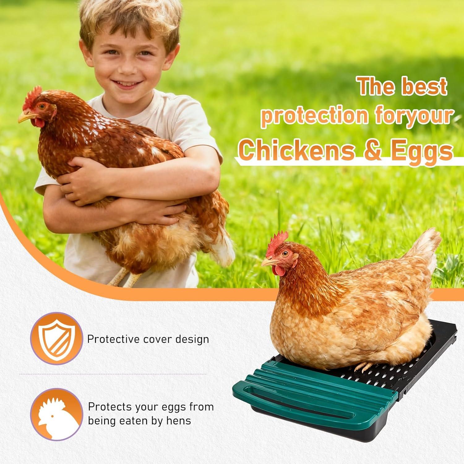 【Egg Collection System Reduces Hen Egg Pecking】: Our laying box is equipped with a slightly angled tray that guides eggs to smoothly roll into a dedicated front collection area. This design keeps eggs safely separated from hens, helping reduce egg pecking. The enclosed collection area also keeps eggs clean and intact, letting you gather fresh eggs without disturbing your flock.