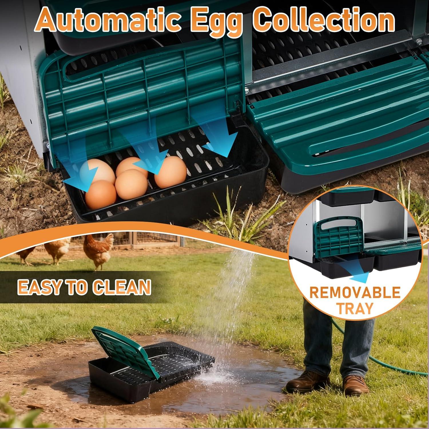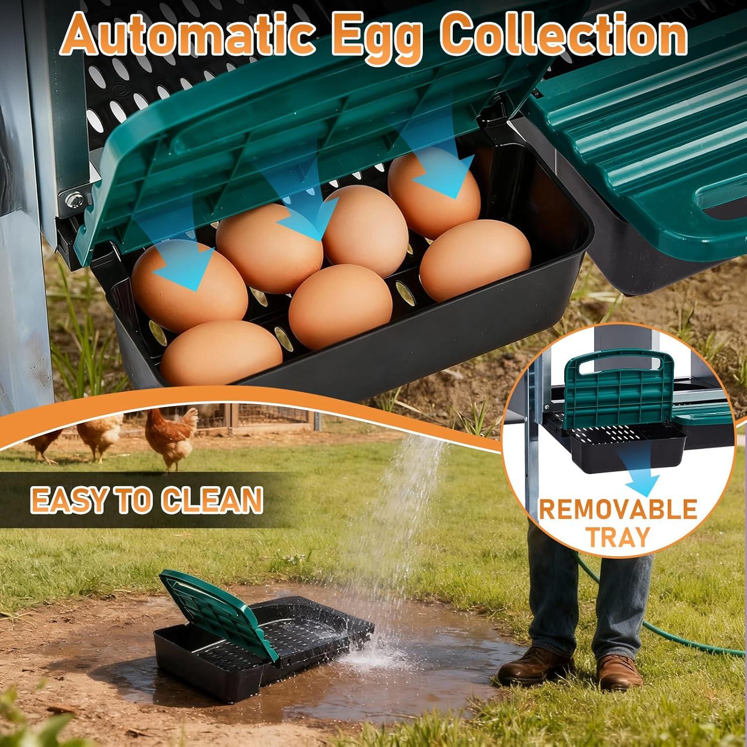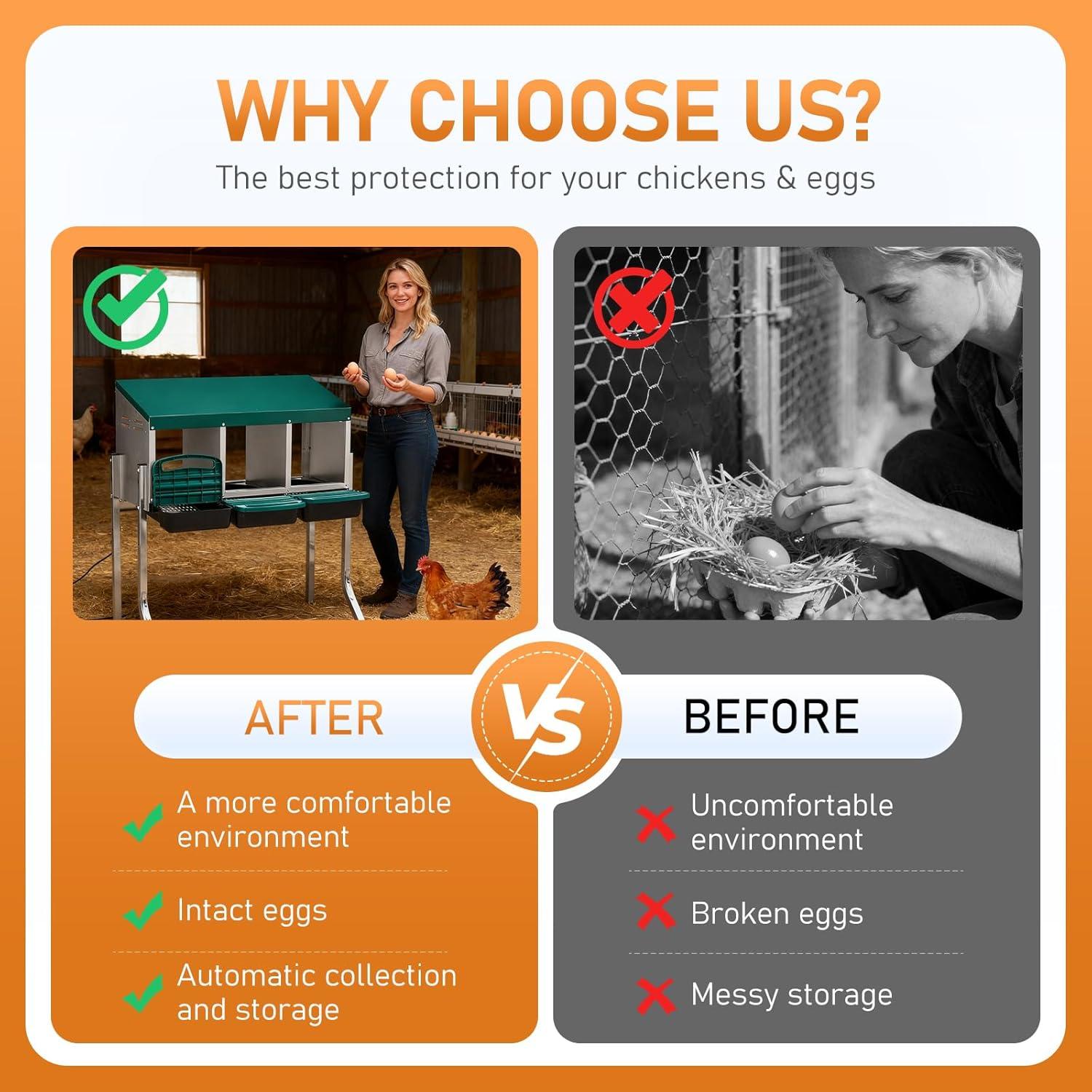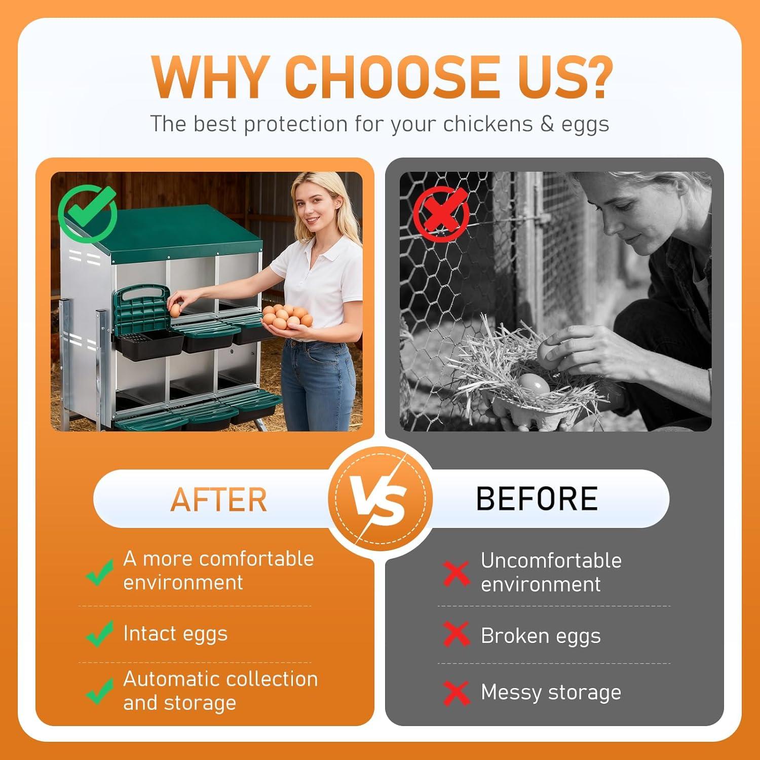 【Egg Collection System Reduces Hen Egg Pecking】: Our laying box is equipped with a slightly angled tray that guides eggs to smoothly roll into a dedicated front collection area. This design keeps eggs safely separated from hens, helping reduce egg pecking. The enclosed collection area also keeps eggs clean and intact, letting you gather fresh eggs without disturbing your flock.