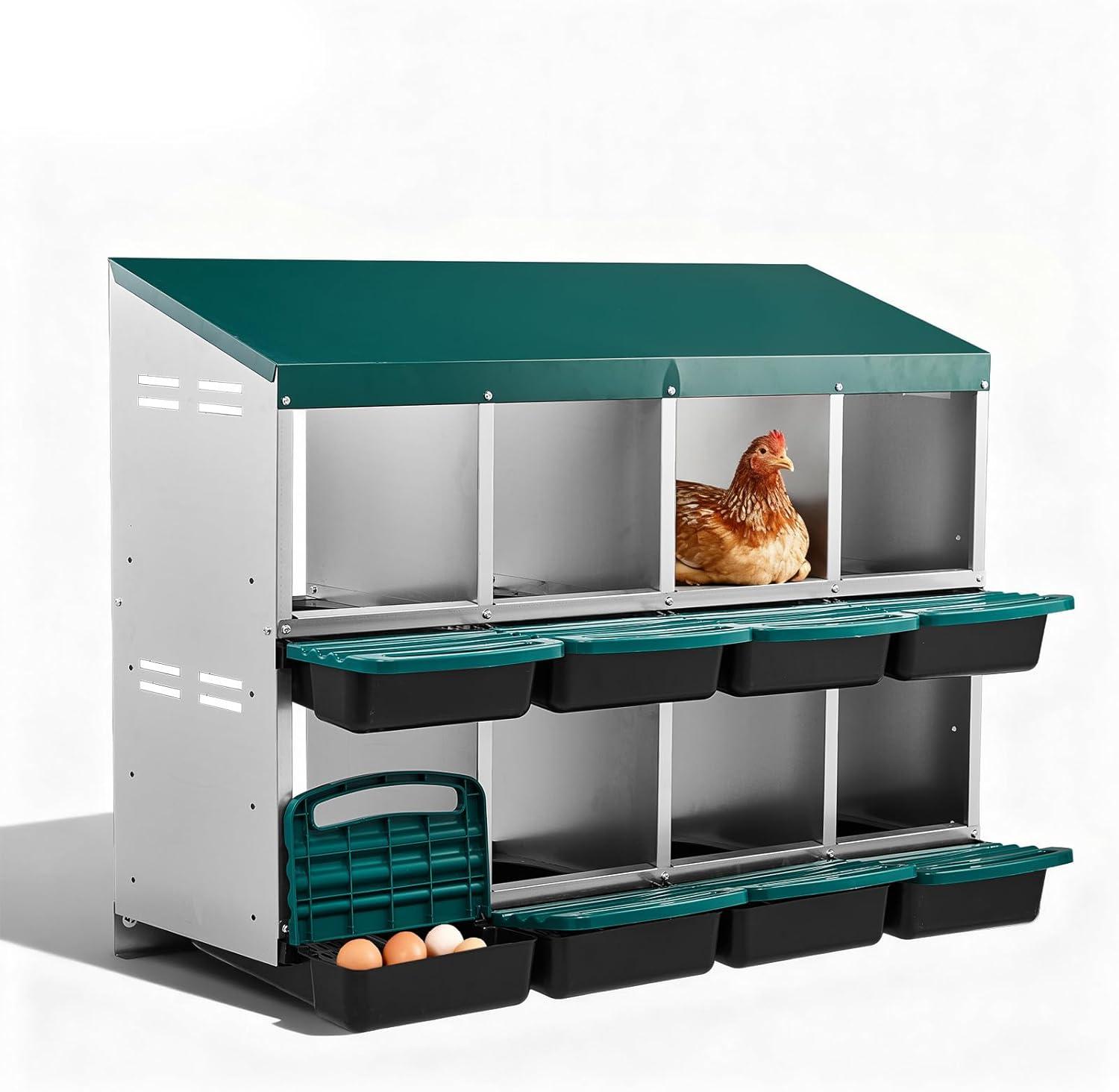 Outvita Chicken Nesting Boxes, 8 Compartments Metal Nesting Boxes for Chickens with Metal Legs, Wall Mount for Laying Eggs with Swing Perch and Roll Away Egg Collection for Chicken Coop, Red(Green)