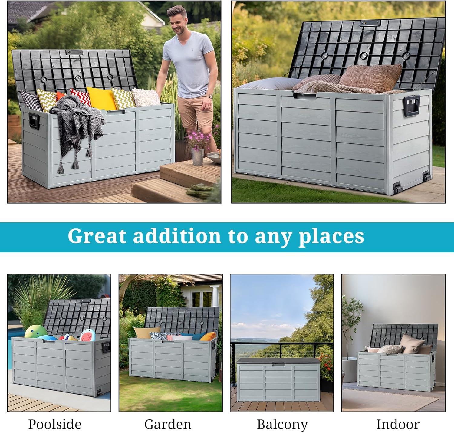 Outvita Deck Storage Box, 75 Gallon Plastic Durable Storage Container Bin with Lid Store Patio Cushions and Yard Stools Outdoor Patio Garden Pool(Brown)(Gray Body-Gray Lid)