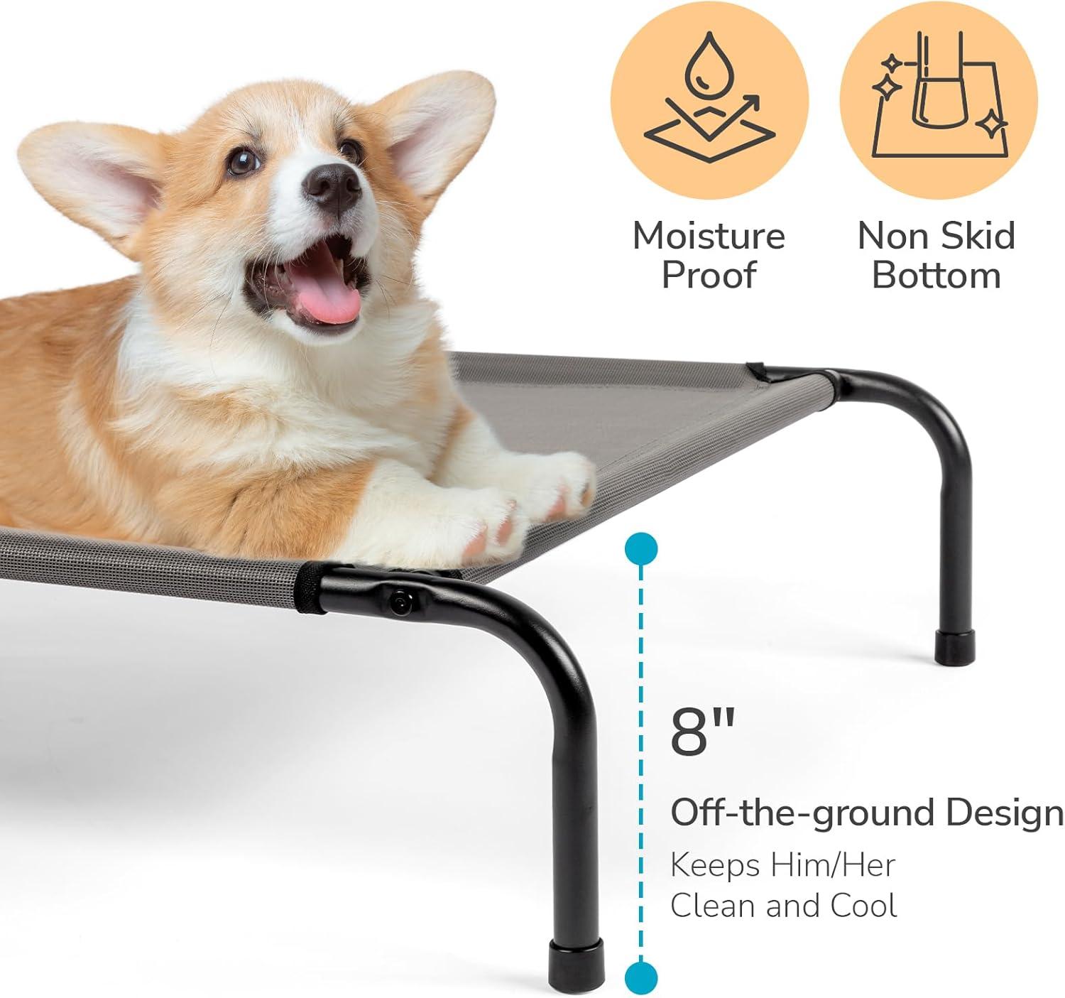 Cooling Haven: The frame of the raised dog bed expansively supports the Textilene fabric, offering substantial reinforcement for the joints and muscles of the dog. Elevated at a height of 8 inches above the ground, the cooling dog bed facilitates air circulation. The Textilene material, characterized by its cooling attributes, ensures that your dog basks in a state of coolness and dryness.