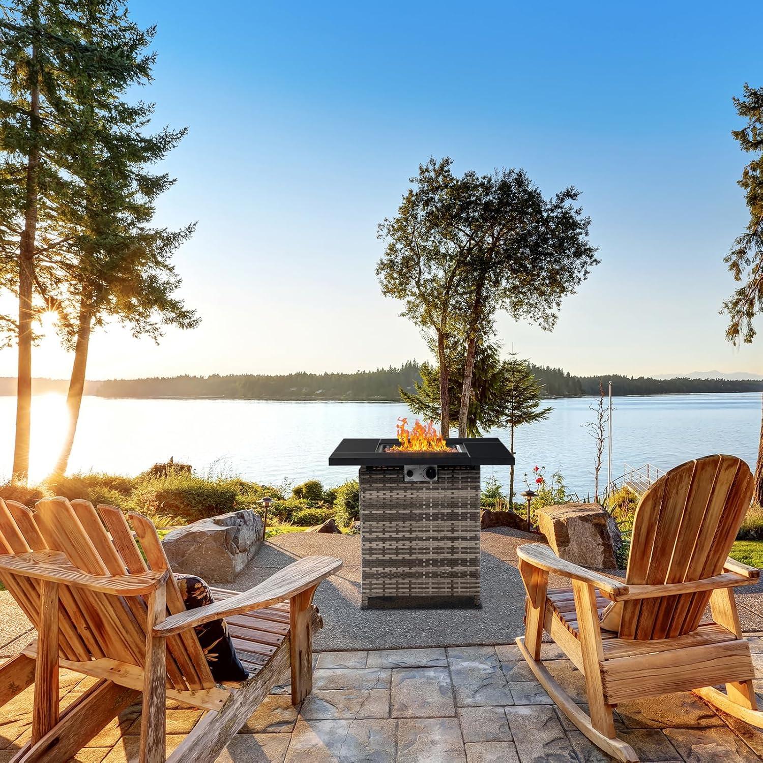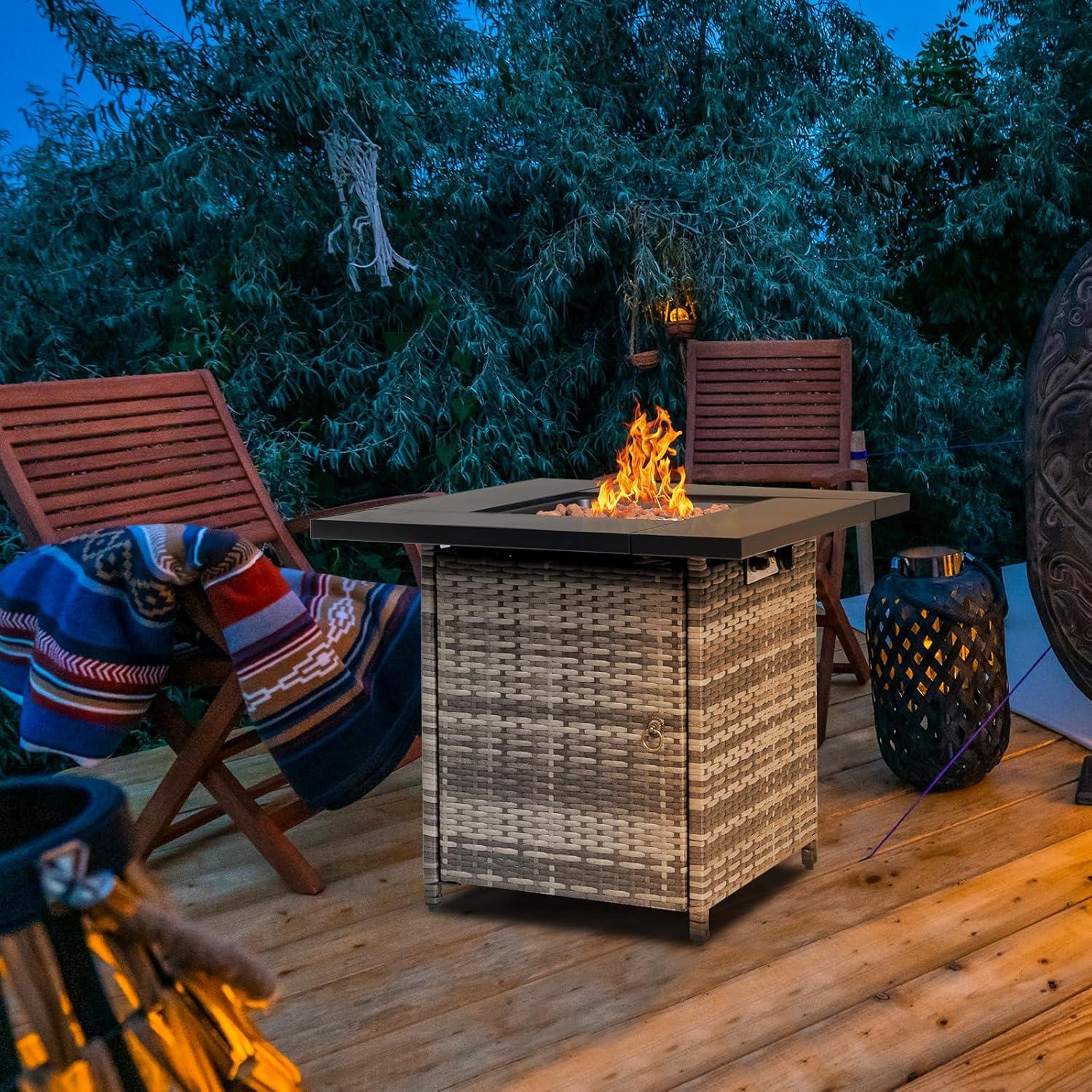 【Hidden Storage Design】The outdoor fire pit table's body is a hidden storage design, which can be used for 20 lbs propane tanks and table rain cover. Enough space underneath to store a propane tank. And there is a ring inside the fire pit table to fix 20lbs propane tank