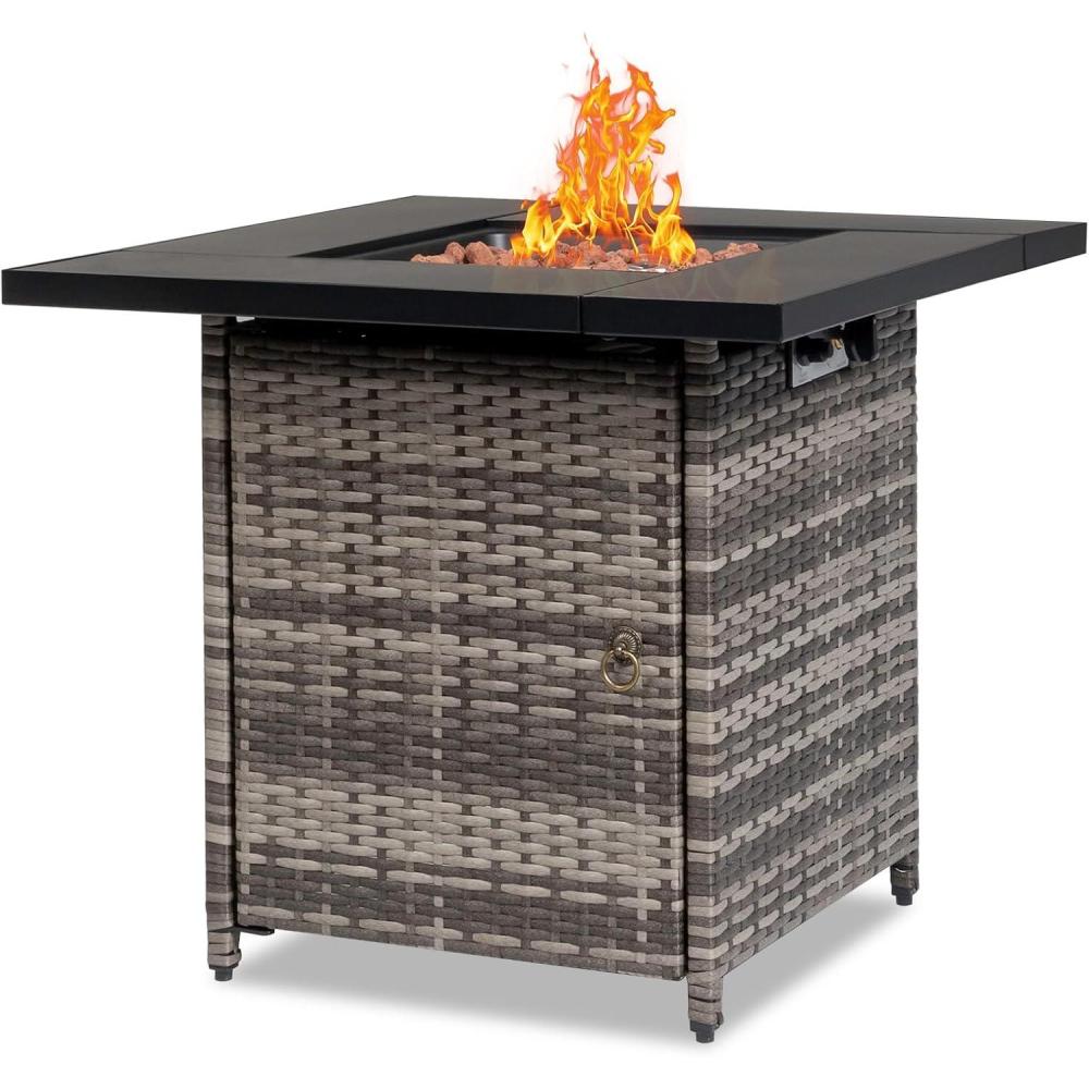 【Dimensions&2-in-1 Design】Square tabletop: 28″Lx28″Wx26.8″H. Combustion zone: 14.4″Lx14.4″W. And 6.8″ wide table side is enough for holding drinks and foods. This propane fire pit table is perfect to place in patio to match with most furniture. When no use, the cover lid can make the fire pit table to be dining table, coffee table and bar table