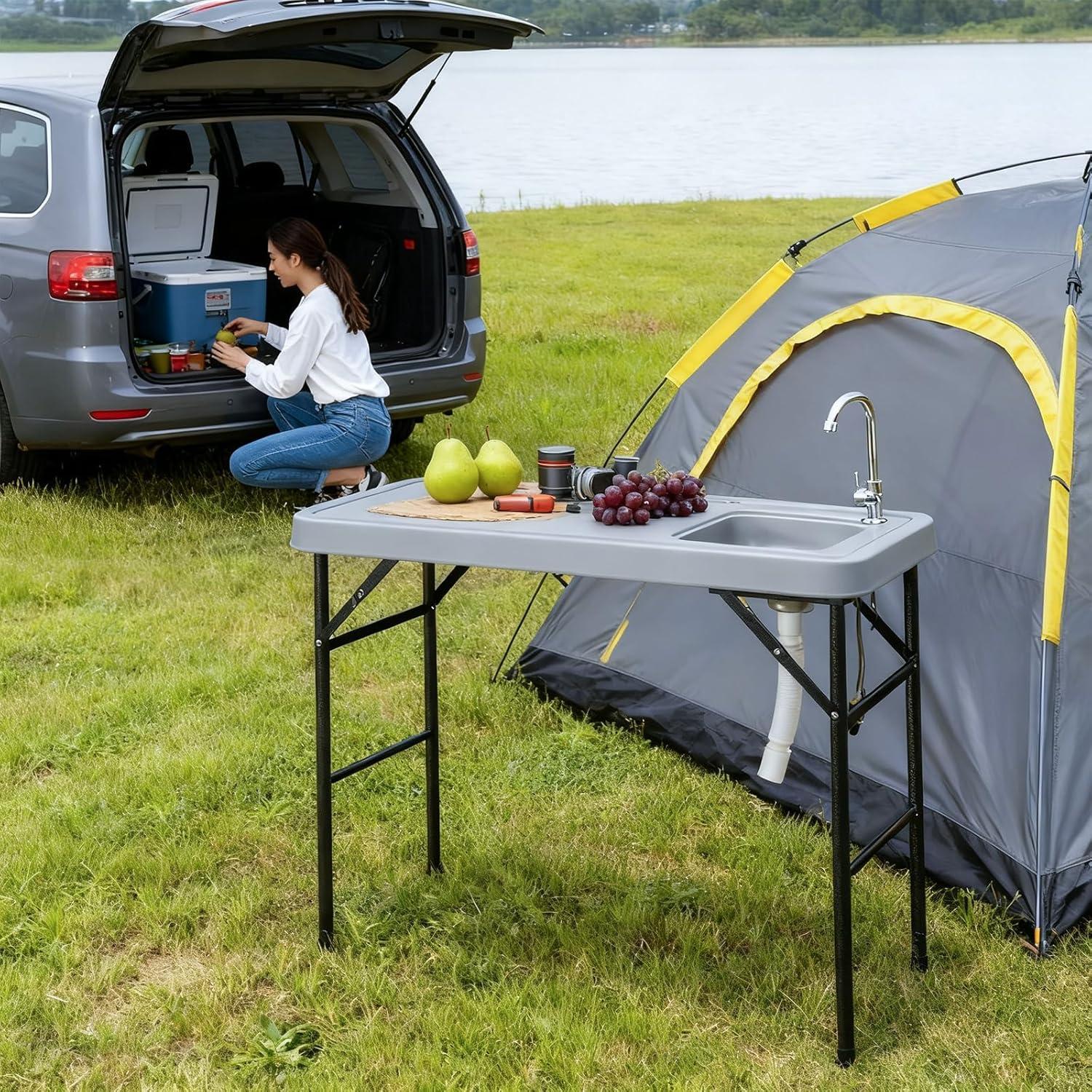 Outvita Fish Cleaning Table, Portable Folding Camping Table, 45" HDPE Outdoor Fish Cleaning Station with Sink, 360° Stainless Steel Faucet, Drainage Hose, Working Platform for Camping, Food Handling(Basic Table-Gray)