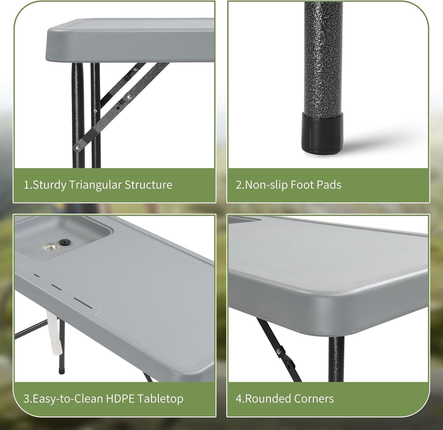 PREMIUM MATERIAL: The tabletop of camping washing station made of food grade HDPE, which features durable, water resistance and easy to clean. High strength steel frame adds the stability and firmness of outdoor sink station to make sure it can be used for a very long time.