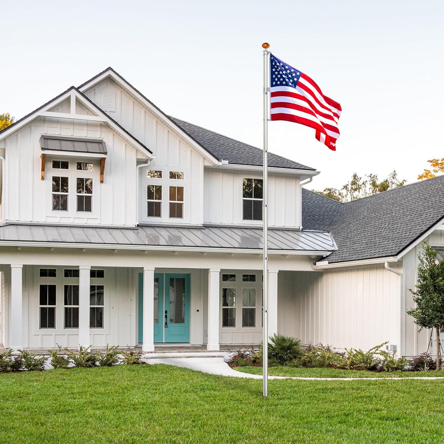 【COMPLETE FLAG POLE KIT】Sectional Flag Pole Kit can solve all the accessories you need to install. 3' x 5' high quality polyester USA flag and handcrafted golden ball finial will be as a gift, which features anti-fading and ultraviolet that can keep bright for a long time. You can fly two flags or one flag at half-mast for meeting your needs