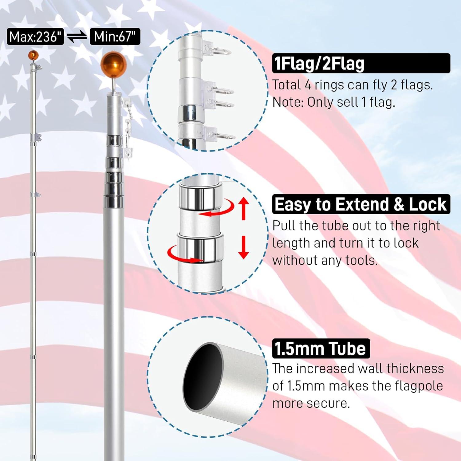 【UPGRADED MATERIAL & STABILITY】The 25' flag pole is made of 16 gauge aluminum tube with 1.2mm extra thick wall design, which features strong rust resistance and sturdiness to withstand the all-weather outdoor environment, durable enough and last longer. PVC sleeve to insert the pole into the ground makes the bottom stable and wind-resistant