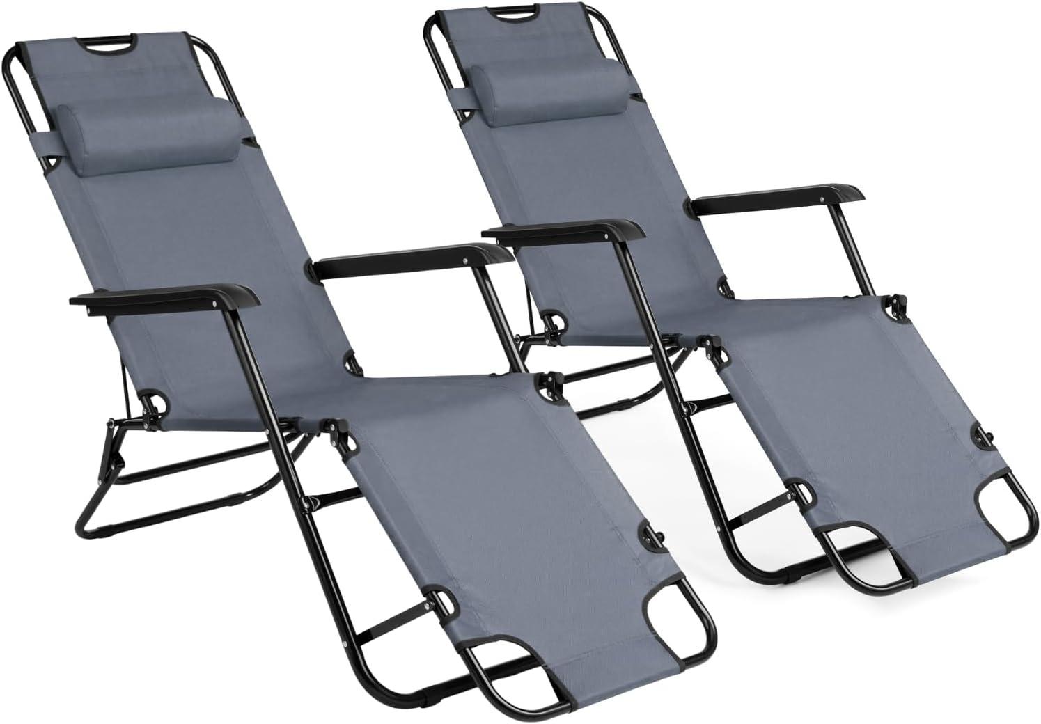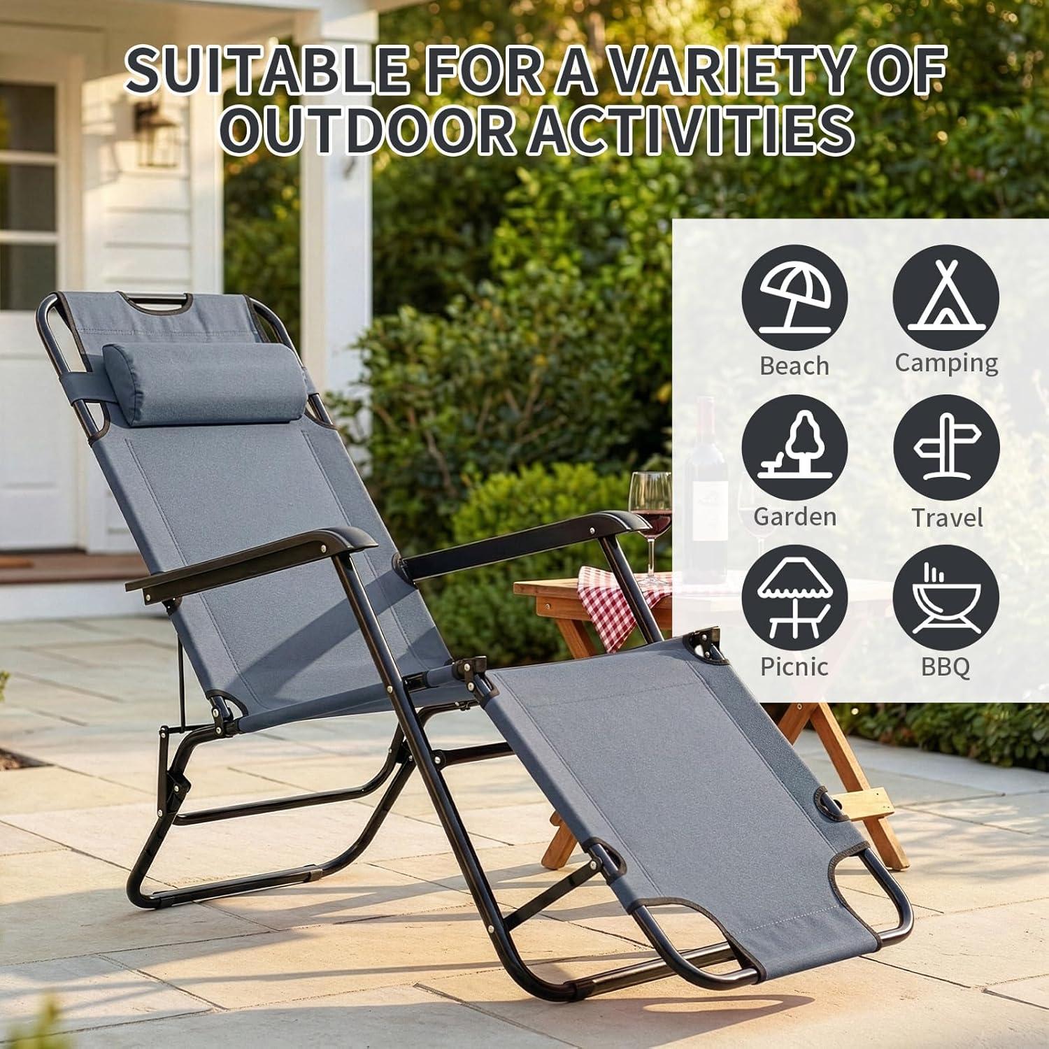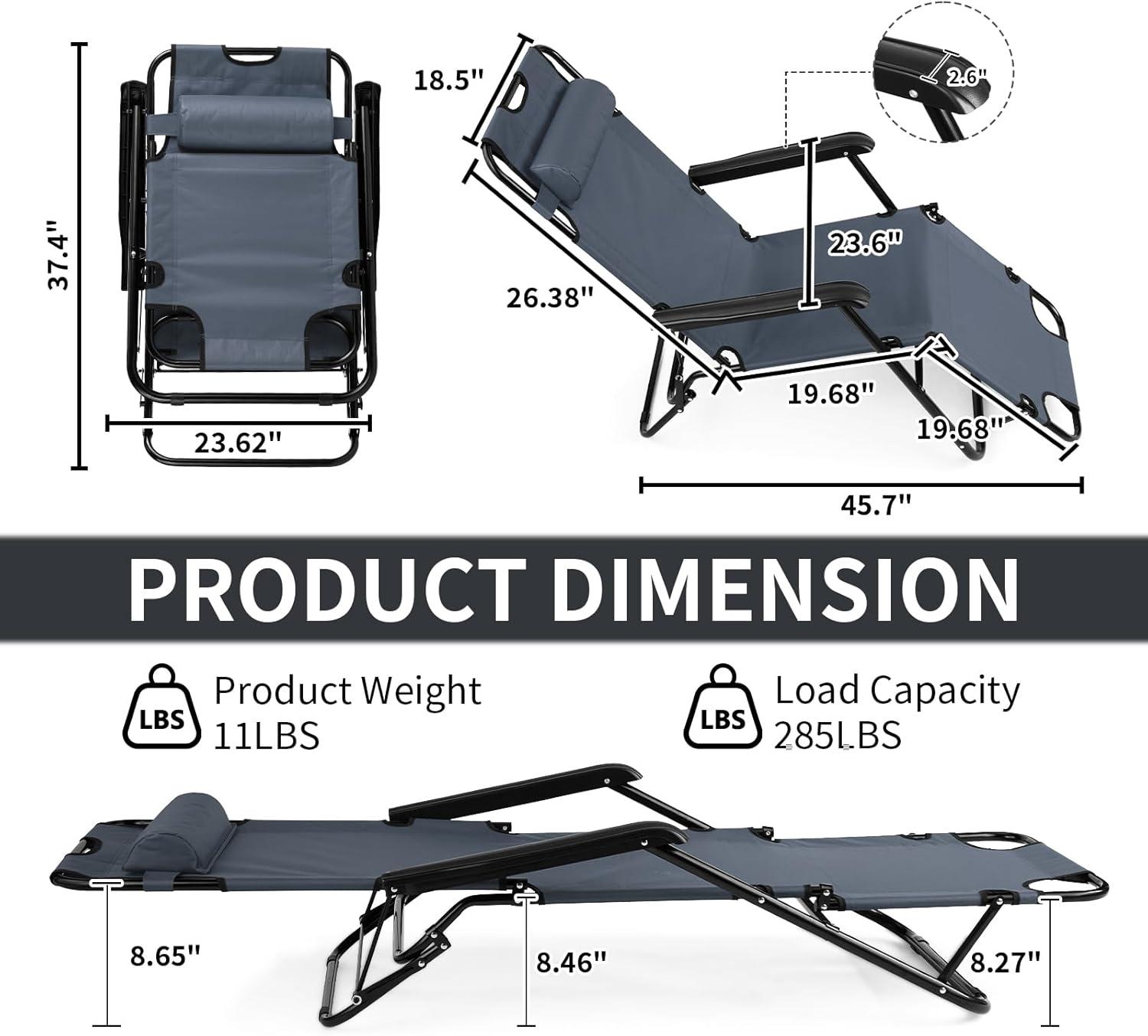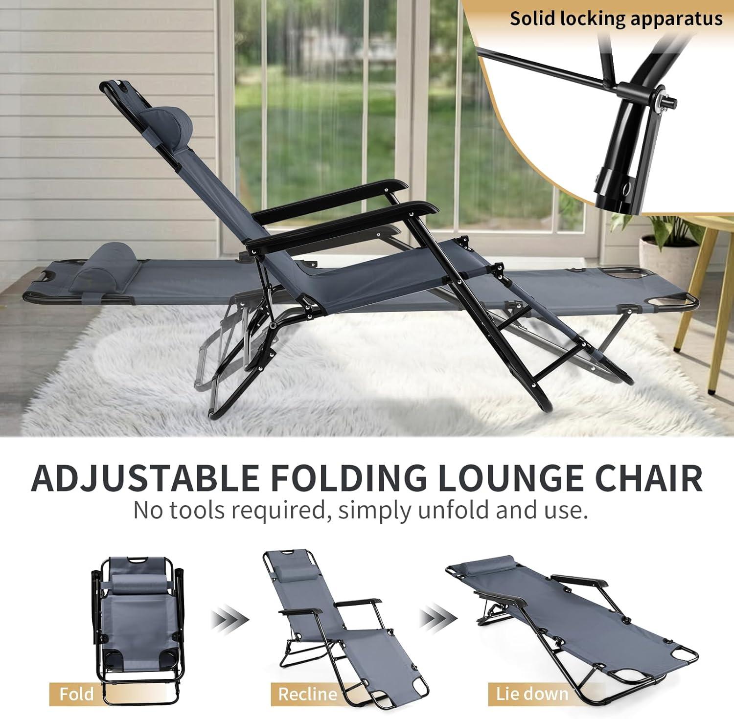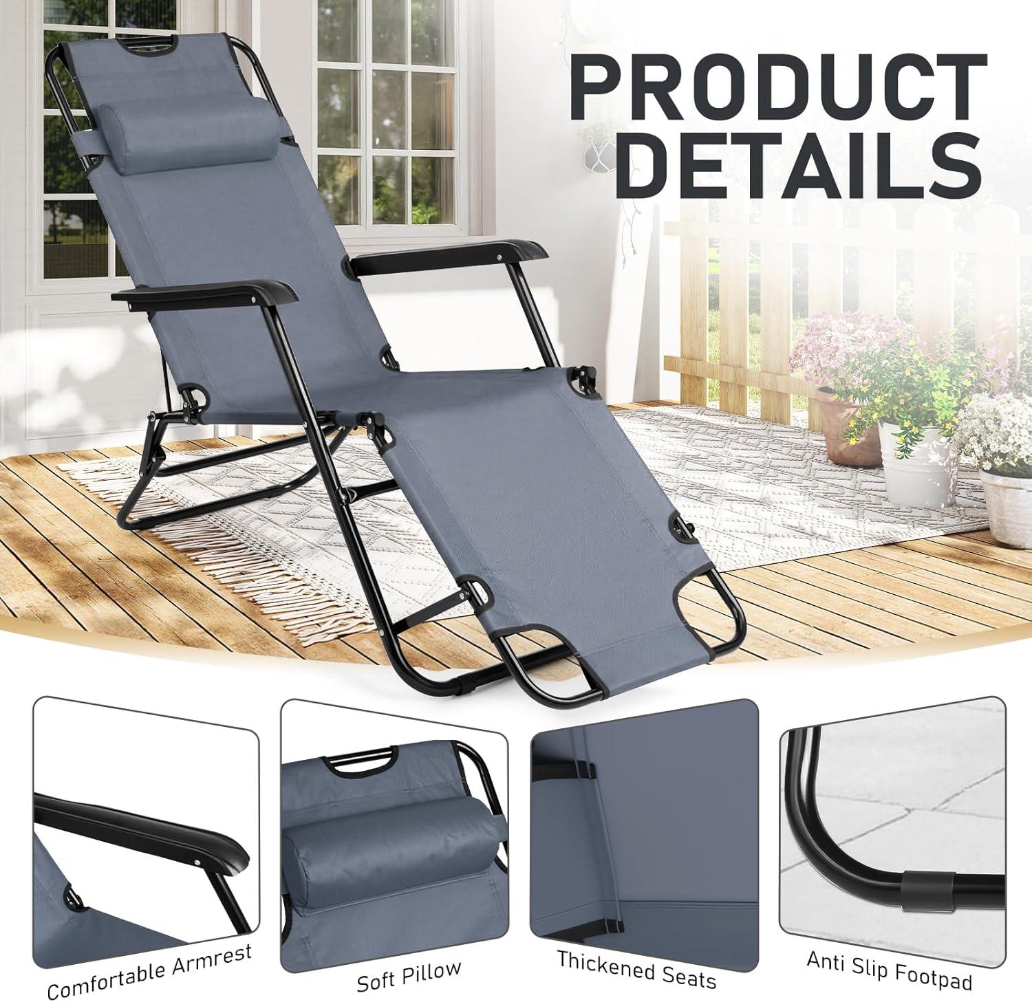 Outvita Folding Chaise Lounge Chair, Outdoor Adjustable Recliner Chair with Pillow for Camping, Beach, Poolside, Garden, Backyard, Lawn(Grey)