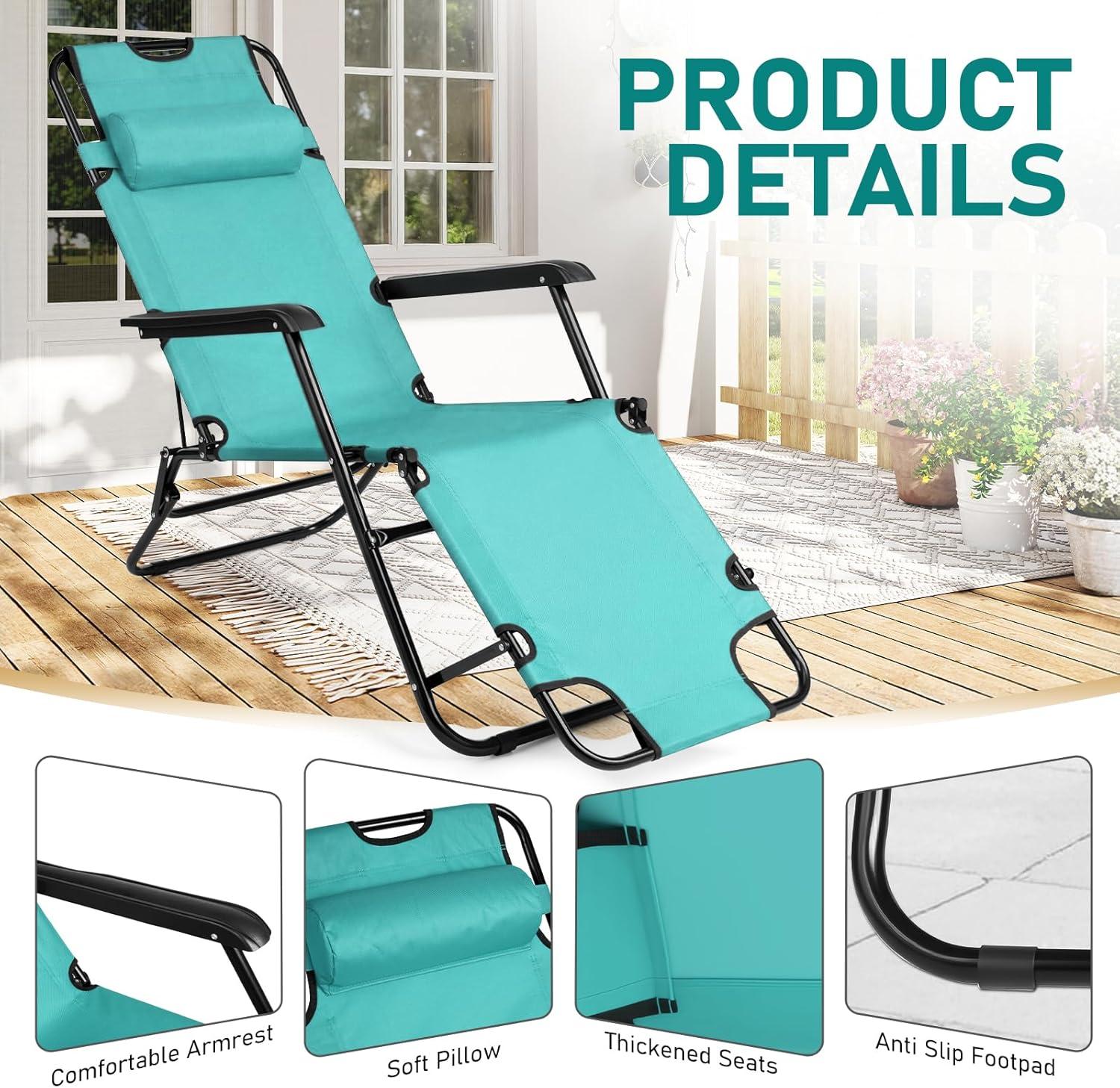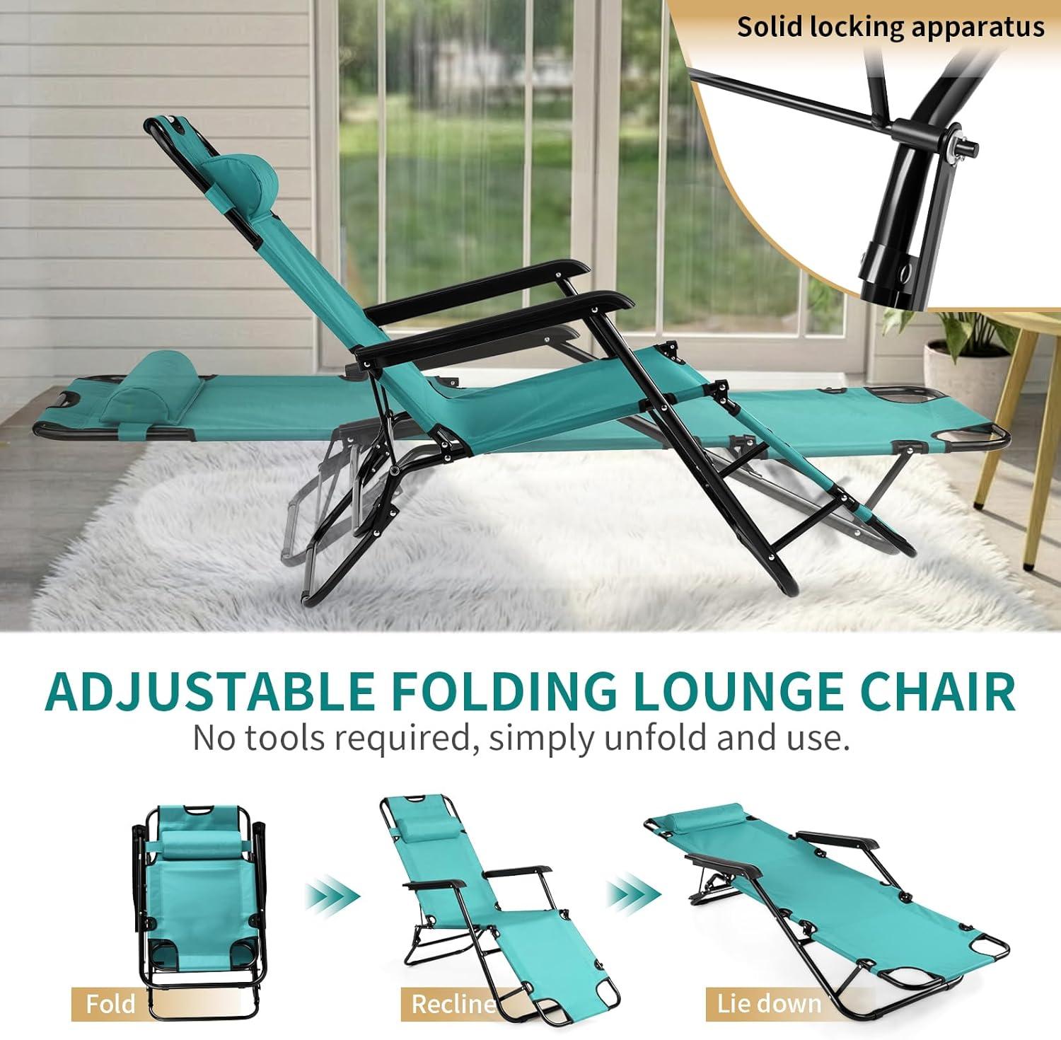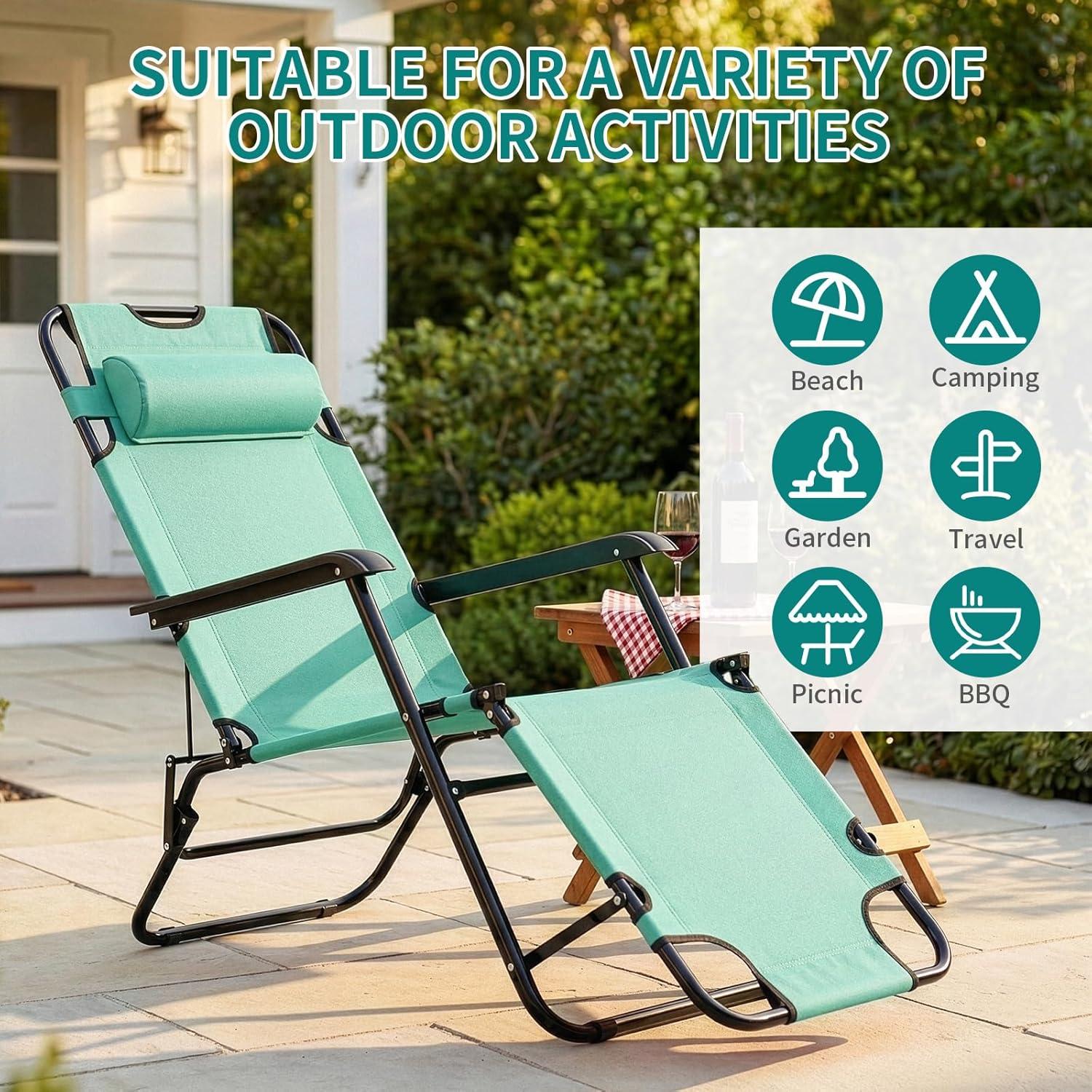 Outvita Folding Chaise Lounge Chair, Outdoor Adjustable Recliner Chair with Pillow for Camping, Beach, Poolside, Garden, Backyard, Lawn(Mint Green)