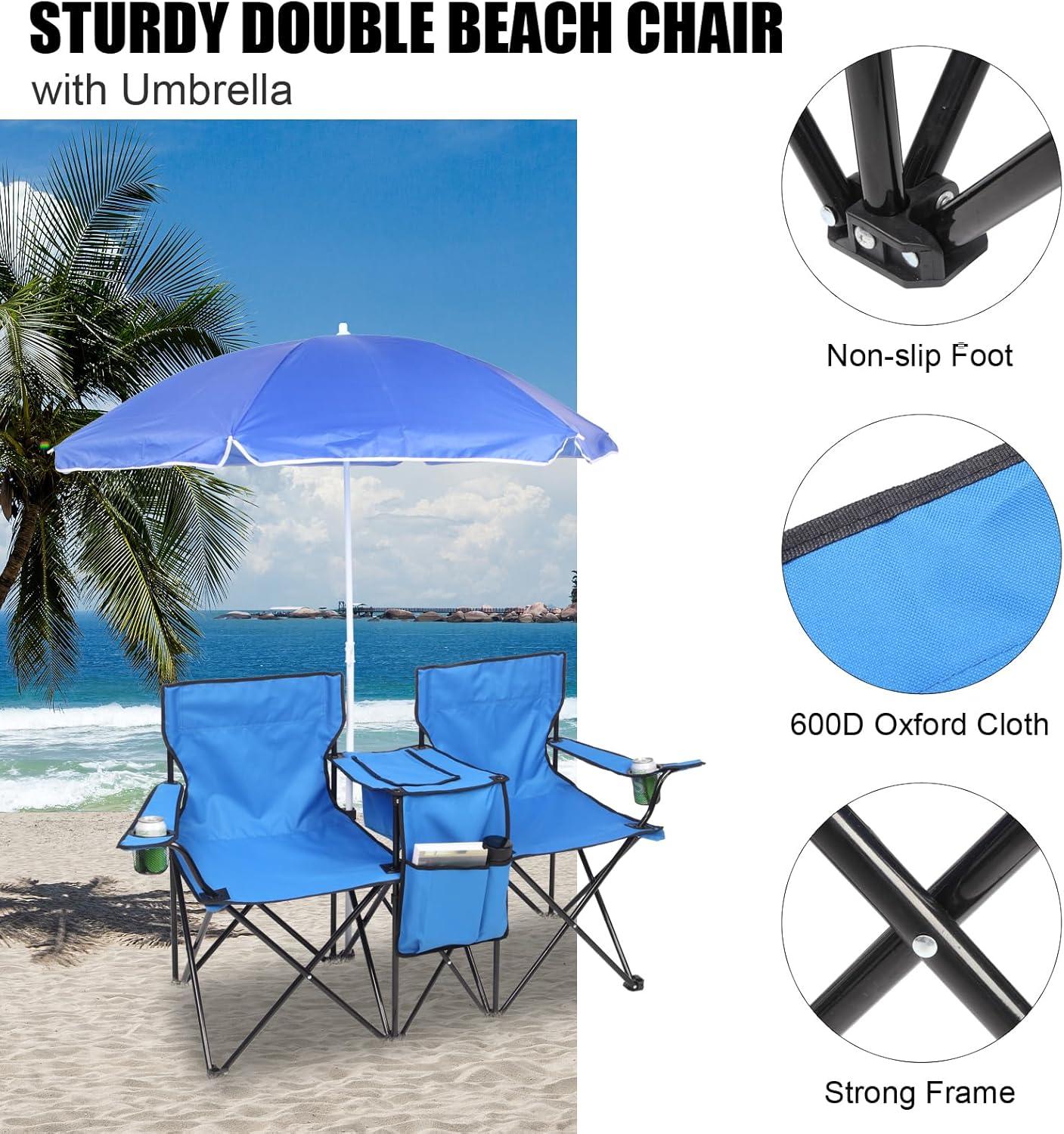 Outvita Folding Double Camping Chair w/Umbrella Beverage Holder Carrying Bag Cooler Fold Up Table, Large Bearing Capacity for Beach Patio Pool Park Outdoor Blue(Blue)