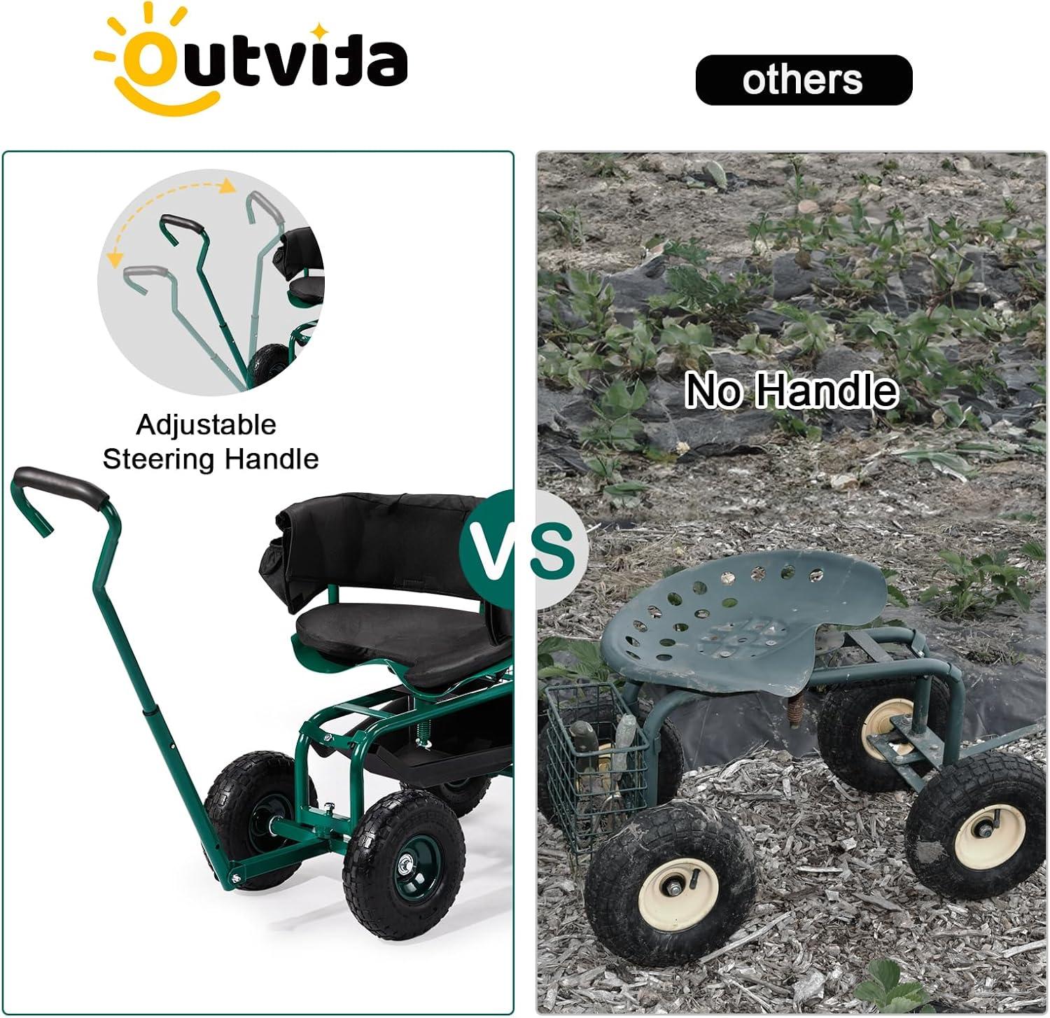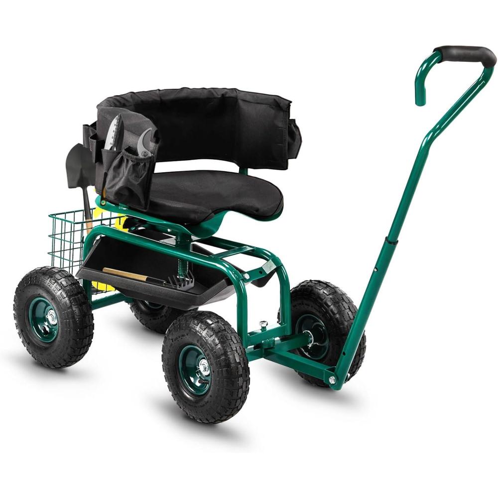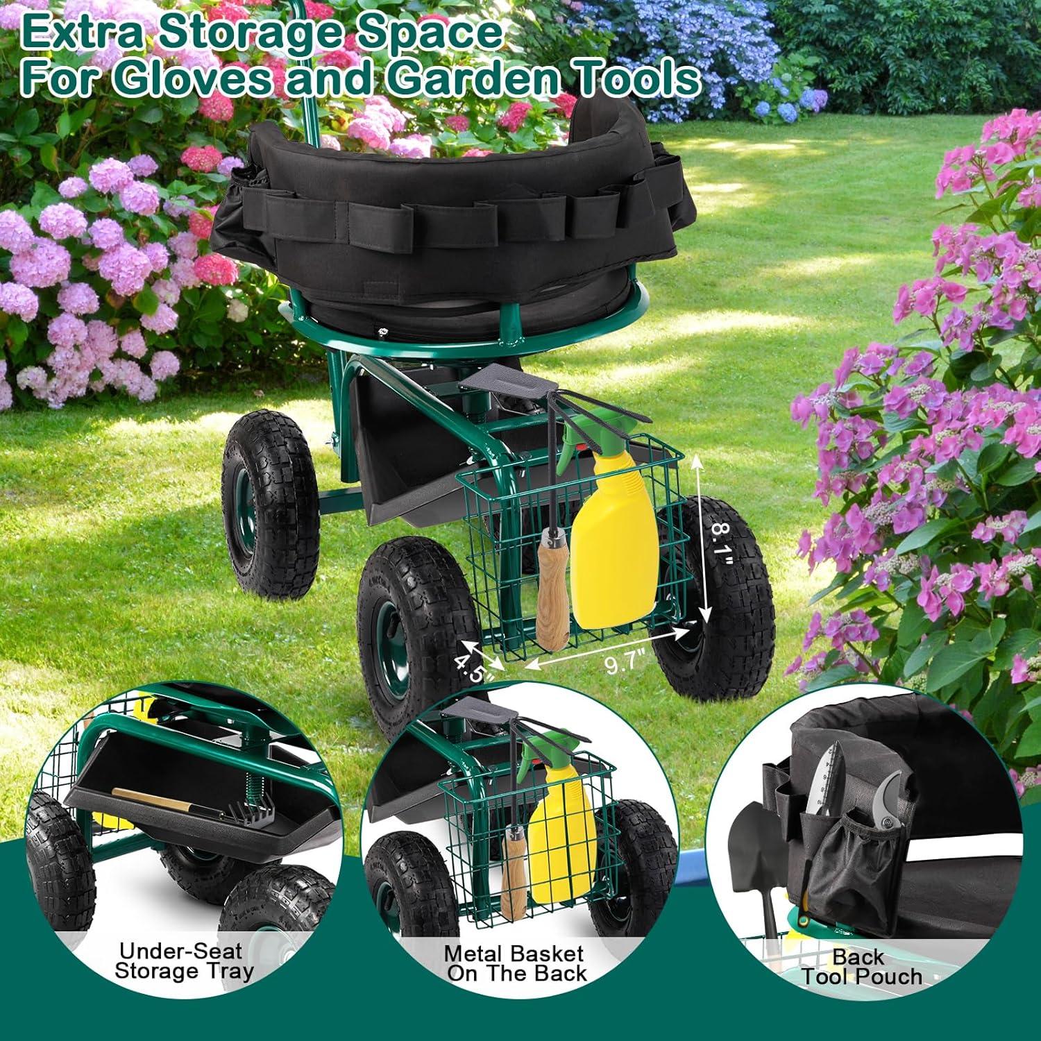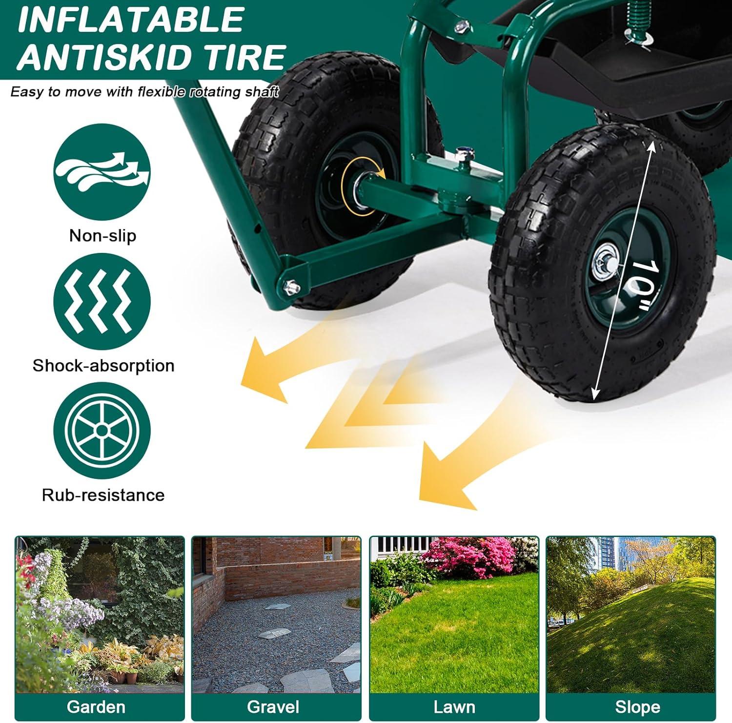 Ample Storage Space: The spacious rear storage basket and tool tray under the seat provide ample space for placing gardening tools, organizing all necessary gardening tools and placing them within reach, saving time and effort