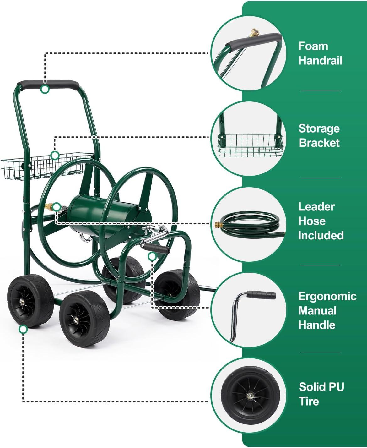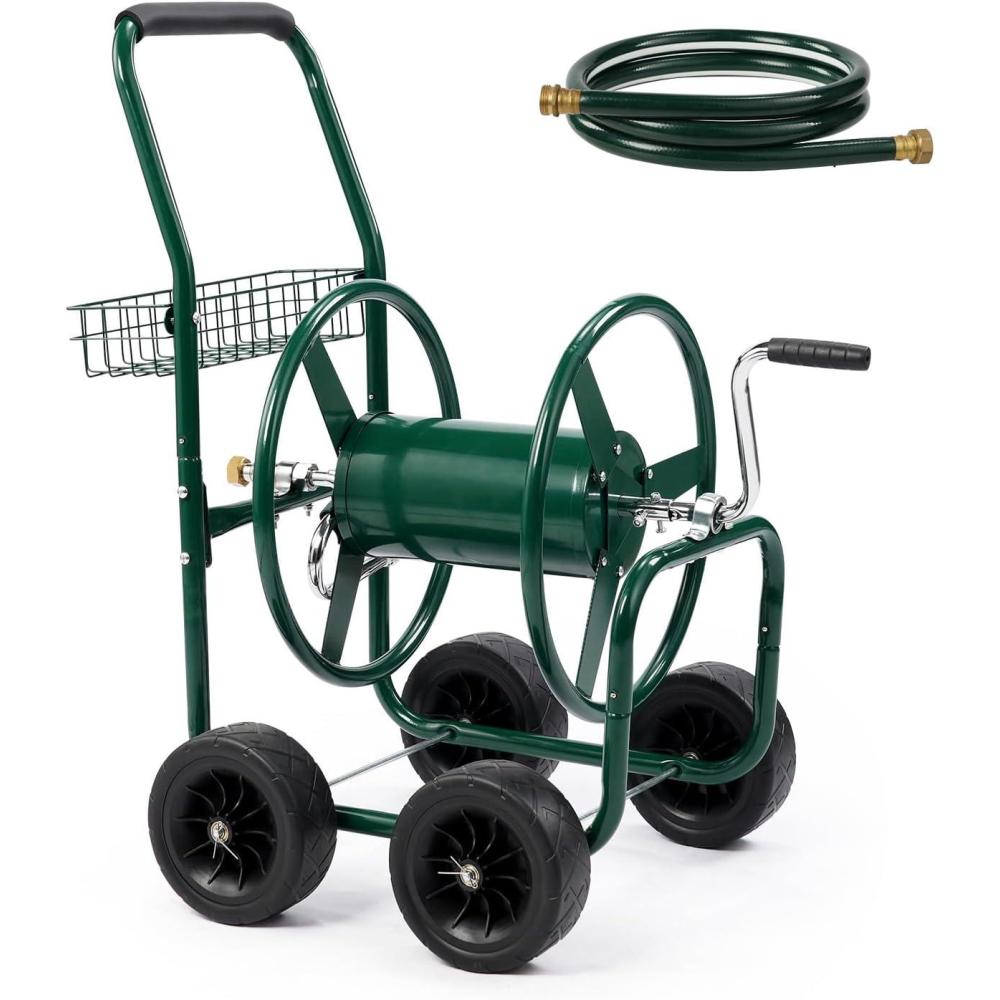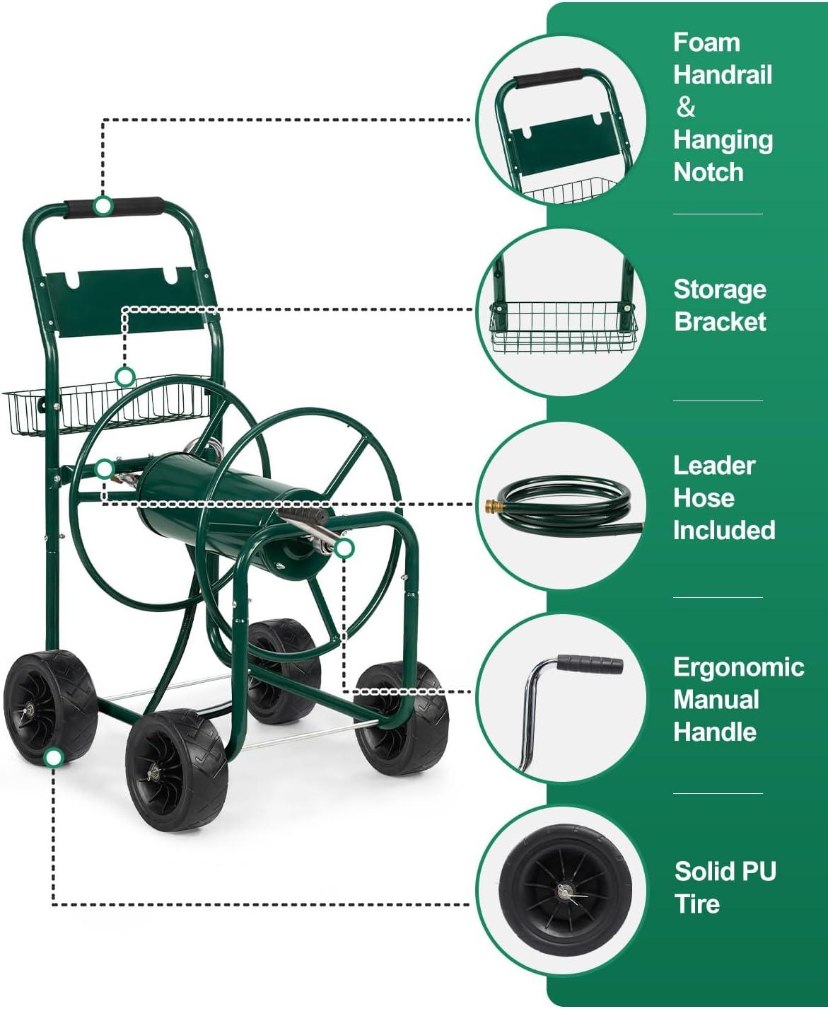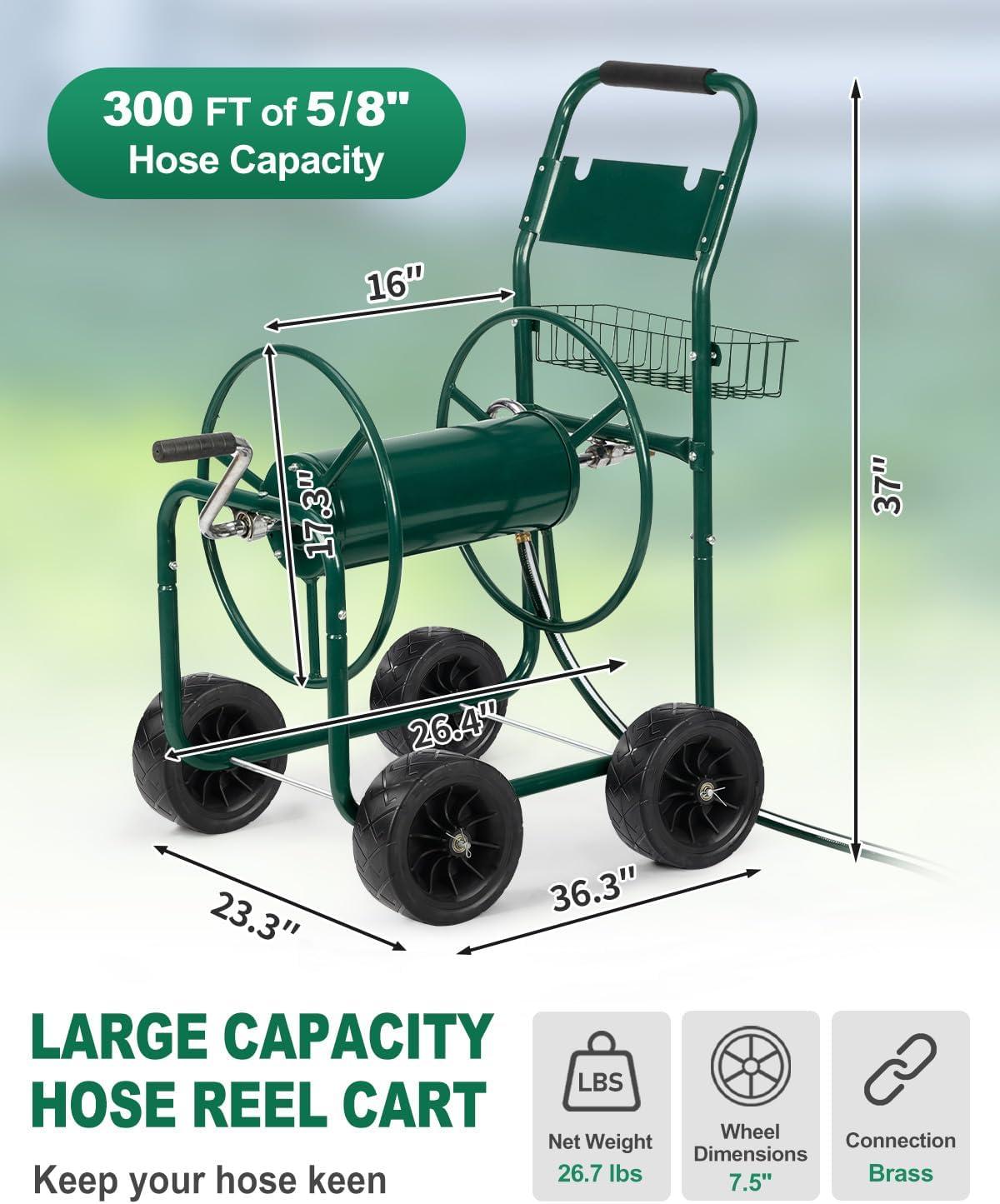 【Large Capacity Hose Reel】 Our hose cart can hold up a 300 ft (5/8″) or 400 ft (1/2″) of hose. The length and capacity of water hose make it suitable for most commercial farms and family gardens. The extra storage basket can store gardening tools or garden irrigation material